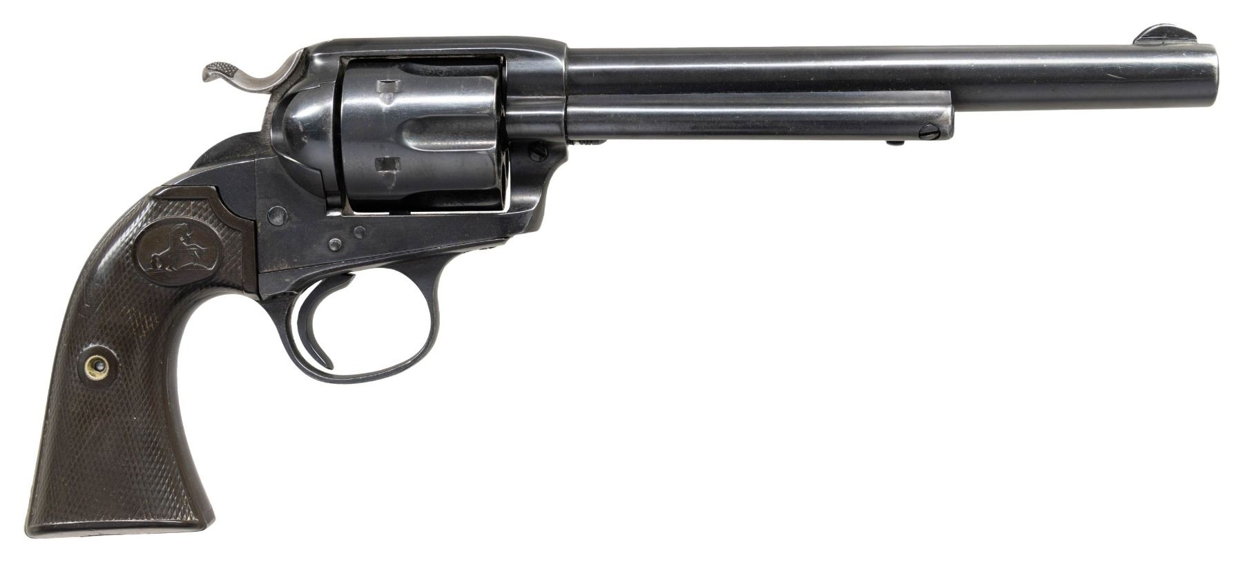Cal. 45 Colt. S# 223516. Bbl. 7 1/2" with replacement blade sight and Hartford address. 6-shot fluted cyl. Frame and grip straps have matching S#s. Cyl. is unnumbered. 2-piece checkered hard rubber Rampant Colt grips. Mfg. in 1902. CONDITION: over 90% reblued finish showing carry and edge wear with remaining spots of light pitting. Markings are lightly weakened. Grips show checkered wear with chips and dents at butt. Action shows wear and will not hold properly at third notch. Lightly pitted bore. (25-4906/DS). CURIO. $700-1,100.