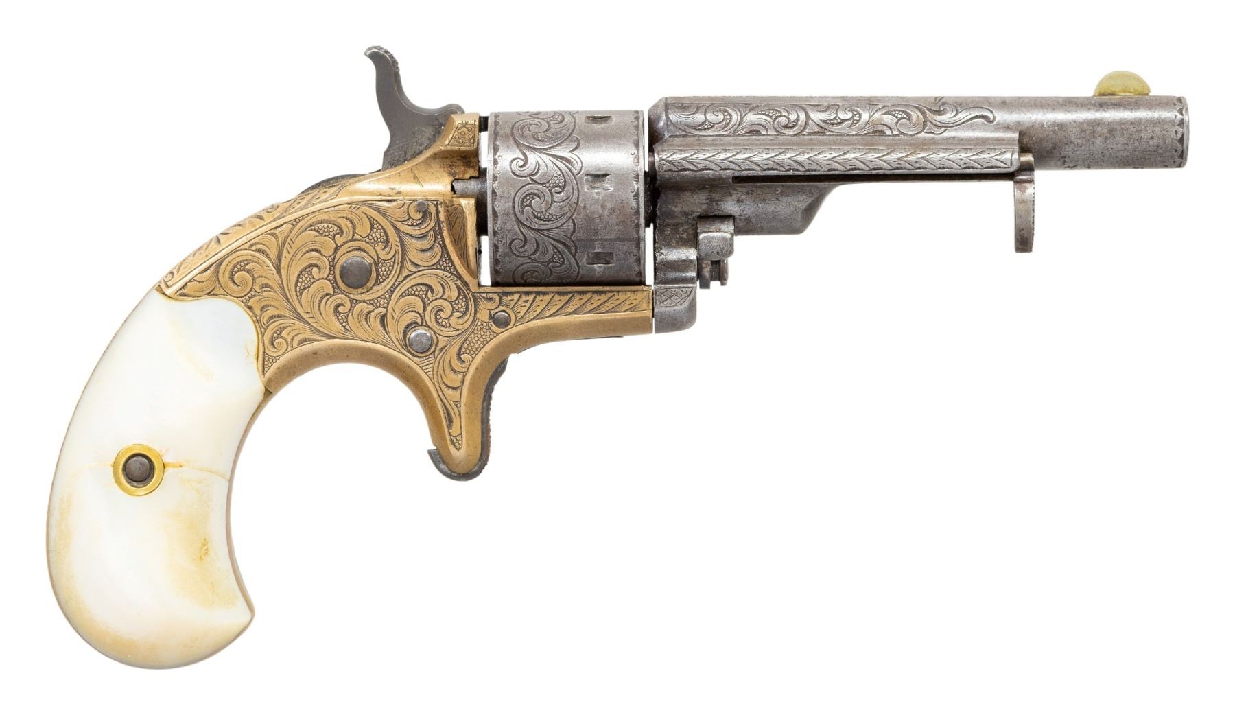 TYPE 2 COLT OPEN TOP POCKET REVOLVER. Cal. 22 RF. S# 766. Matching numbers on butt and bbl. Bbl. 2 7/8" with ejector and German silver half moon front sight. 7 Shot cyl. First type stylized barrel key. Initial Production guns (1-6000) were rarely upgraded with expensive plating, fancy stocks or engraving, save for the type 3, most of which were full-plated nickel. Consignor notes that only a dozen engraved Initial Production models have been observed; six each of Types 1 and 4. All but one were the work of the preeminent firearms engraver of the period, Louis D Nimschke. This Revolver is pictured on page 69 of COLT- SMITH & WESSON. A CLASH OF ARMS. Featuring Colt's Battle Born Open Top .22, by Robert Swartz. Frame, bbl. & cyl bear Nimschke's trademark floral scroll engraving with punch dot background and straight line borders. Front portion of bbl. and backstrap have intertwined wavy line engraving with punch dot accents and wavy punch dot borders. Revolver is stocked with 2 piece bird's head mother of pearl grips. UNATTACHED ACCESSORIES: Copy of "COLT- SMITH & WESSON. A CLASH OF ARMS. Featuring Colt's Battle Born Open Top 22." by Robert Swartz. CONDITION: good overall. Consignor states frame coloration is of an early low karat gold plating, our testing is inconclusive. Bbl. & cyl. exhibit light pin prick oxidation and staining. Brass frame has acquired a pleasing mustard patina. Right grip panel has full length horizontal crack extending through escutcheon with minor loss at right side of escutcheon. Bore retains strong rifling with an overall frosted appearance and areas of light- moderate oxidation in grooves. Mechanically excellent. An exceptionally difficult revolver to come across as few were made during initial production. (01-28281/BH). ANTIQUE. $2,000-3,000.