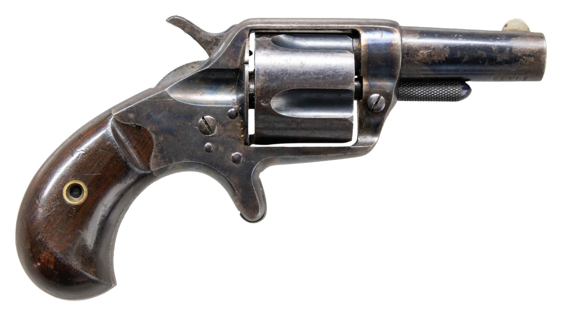 NEW LINE 41 CALIBER SINGLE ACTION REVOLVER. Cal. 41 CF. S# 10432. Bbl. 2 3/16". New Line 41 caliber single action revolver mfg. by Colt in 1879 (final year of production). Let side of the rnd. tapered bbl. exhibits "COLT NEW 41" within an oblong etched panel, with Colt's 2-line mfg. information marked across the top, and "PAT.SEPT.15.1874" above the S#, followed by 2 diminutive British proofs marked on the underside. Left side of the frame is marked "41 CAL", followed by "C" below the cyl. Side of cyl. exhibit British Crown/V and Crown/GP proof to the rear of the flutes. Frame exhibits a case colored finish, with the cyl. and bbl. exhibiting a high polished blue finish. Rear strap of hammer, trigger, and frame screws exhibit a nitre blue finish. Frame is mounted with 2-piece plain wood bird's head grips. German silver half-moon blade front sight with grooved rear sight on top strap of frame. All serialized parts are matching and include the frame, cyl., and bbl. CONDITION: frame retains large amounts of its original case colored finish, exhibiting some areas of wear fading to gray patina and scattered spots of light to mild surface oxidation overall. Grip straps have faded to a mottled gray patina. Cyl. and bbl. show scattered areas of flaking to their original blue finish. Nitre blued parts show areas of wear fading to gray patina, with some spots of light surface oxidation. Polished sides of hammer exhibit light surface oxidation and age related discoloration. Near mirror bore, exhibiting some scattered spots of light pitting predominately towards the muzzle, while retaining sharp, well defined rifling throughout. Proper manual mechanics, with tight cyl. lock up. Grips show some scattered marks and impressions from handling and storage, but otherwise remain sound. (01-28564/MLW). ANTIQUE. $1,000-1,500.