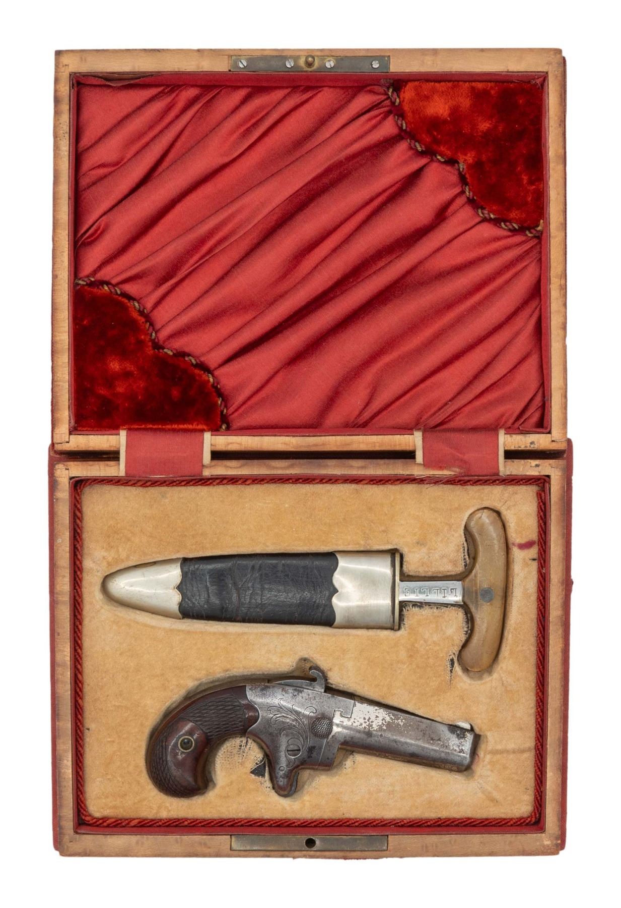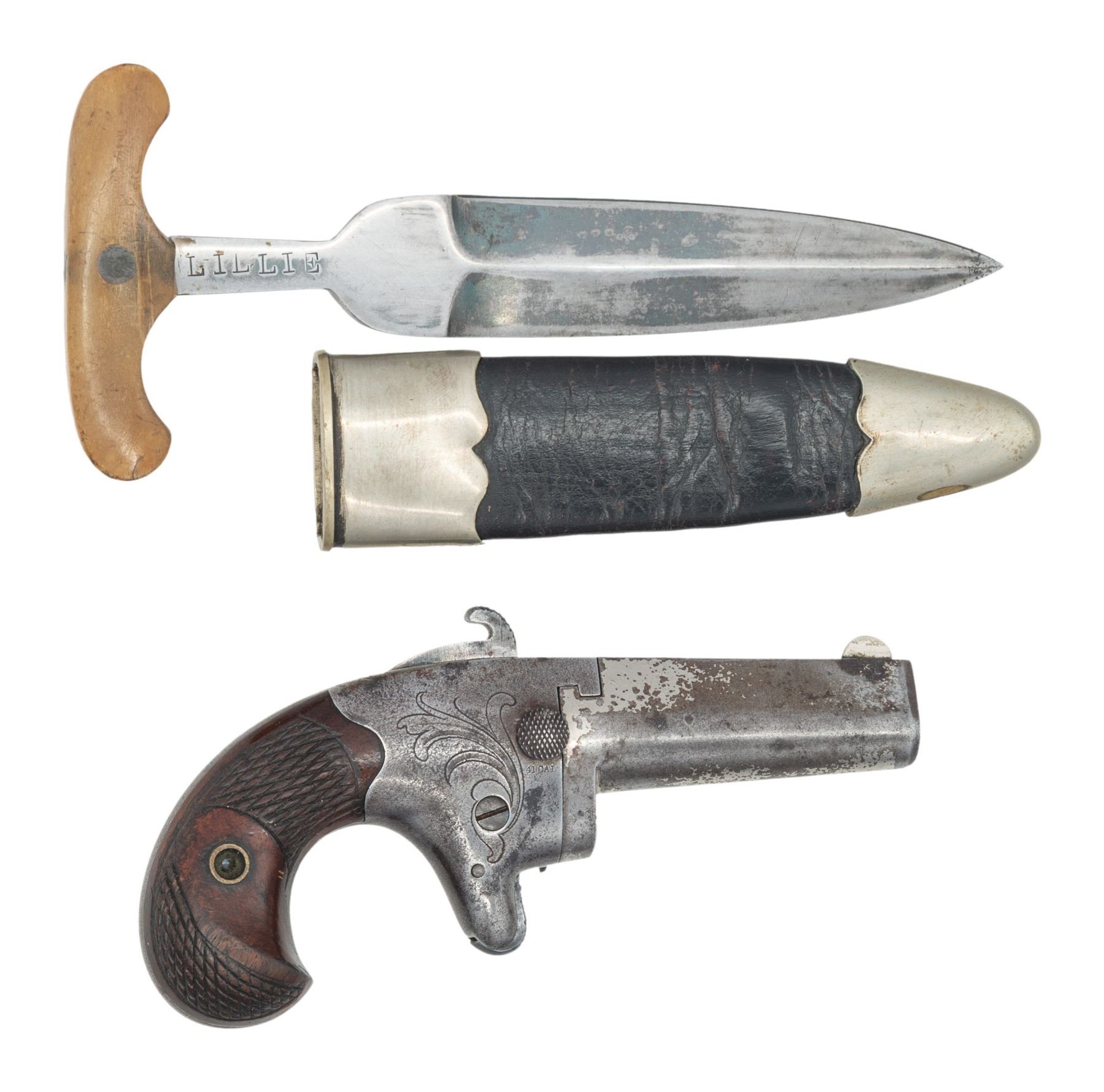 ENGRAVED "LILLIE". 1) COLT NO.2 DERRINGER. Cal. 41 RF. S# 7487. Bbl. 2 1/2" elliptical. Top flat has remnants of the maker's address, followed by "No 2" and bracketed by Maltese crosses. Silver finished semi-circular front sight. Engraved action with center mounted hammer and spur trigger. Bbl. rotates downward for loading. 2-piece checkered walnut birds head grips. Total of approx. 9,000 mfg. 1870-1890. CONDITION: bbl. retains 30% nickel finish. Balance of bbl. and action have faded to gray showing scattered light pitting. Grips show moderate wear. Functioning action, bbl. shows slight looseness when closed. Dark pitted bore with largely intact rifling. 2) PUSH DAGGER. Push dagger with bone T-handle. Overall length is 6 3/8". Blade length is 3 3/4". The knife shank is stamped "LILLIE". Knife is housed in a leather sheath with silver finished brass mouth and tip. CONDITION: blade has largely faded to gray showing spots of fading dark finish. Handle shows light wear and marks. Leather sheath remains malleable showing mild general wear. UNATTACHED ACCESSORIES: 8 7/8" x 7" x 3 1/2" case of birds eye maple with red cloth trim and fitted interior. Case contains 1 case key. Case shows light wear and marks. Pistol and knife are also accompanied by a binder of information talking about Miss May Lillie "The Deadshot Girl" who performed with Pawnee Bill in Buffalo Bill Cody's Wild West Show. (01-27892/DS). ANTIQUE. $1,000-1,500.
