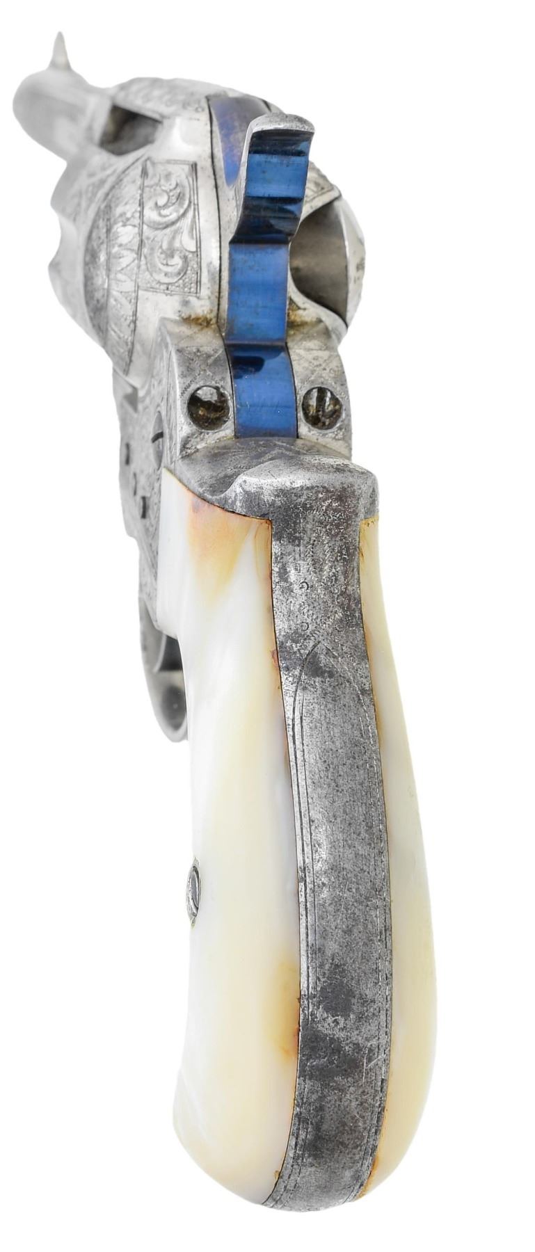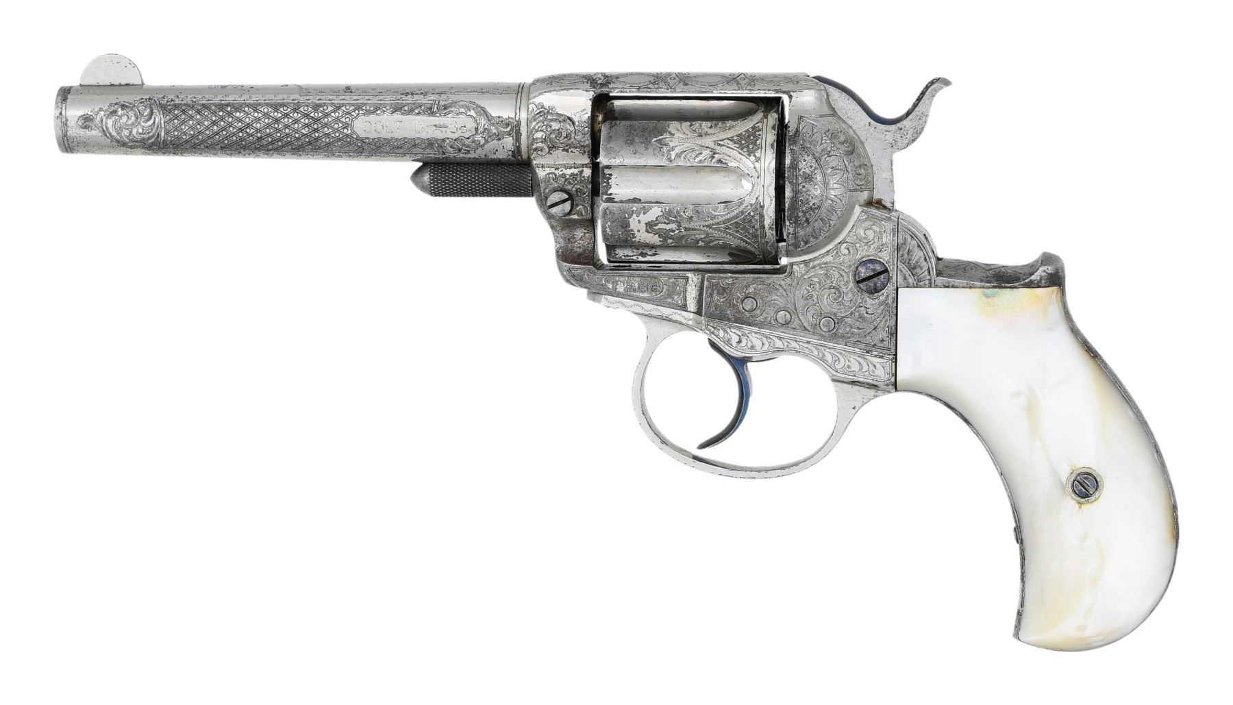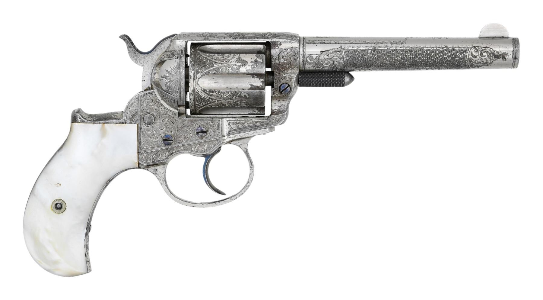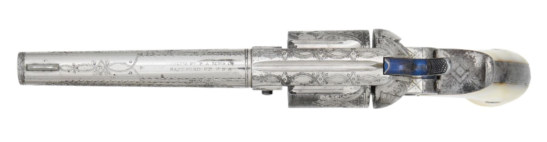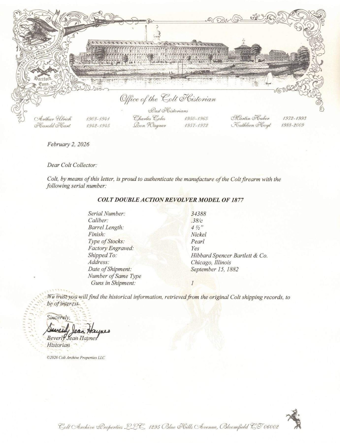 REVOLVER. Cal. 38 Colt. S# 34388. Bbl. 4 1/2", without ejector. Semi-circular blade front sight. Left side of bbl. has acid etched panel caliber marking. 6-shot fluted cyl. Left side of frame has standard stamped patent markings. It has nearly fully coverage vine type foliate hand engraving with checkered bordered pattern on bbl. sides. Nickel finish with fire blued trigger, and fire blued hammer with polished sides. 2-piece pearl birds head grips. Matching S#s are found on the frame, trigger guard, backstrap, cyl., and cyl. base pin. Mfg. in 1882. UNATTACHED ACCESSORIES: factory letter stating: "Serial Number: 34388/ Caliber: .38/c/ Barrel Length: 4 1/2"/ Finish: Nickel/ Type of Stocks: Pearl/ Factory Engraved: Yes/ Shipped To: Hibbard, Spencer, Bartlett & Company/ Address: Chicago, Illinois/ Date of Shipment: September 15, 1882/ Number of Same Type Guns in Shipment: 1". CONDITION: over 70% nickel finish showing scattered spots of finish loss and corrosion. Hammer and trigger retain 70% fire blue. Grips show small handling marks. Gun cycles properly in both SA and DA modes. Bore is generally bright with strong rifling. PROVENANCE: The Esteemed Norm Greenberg Collection. (01-27648/DS). ANTIQUE. $8,000-12,000.