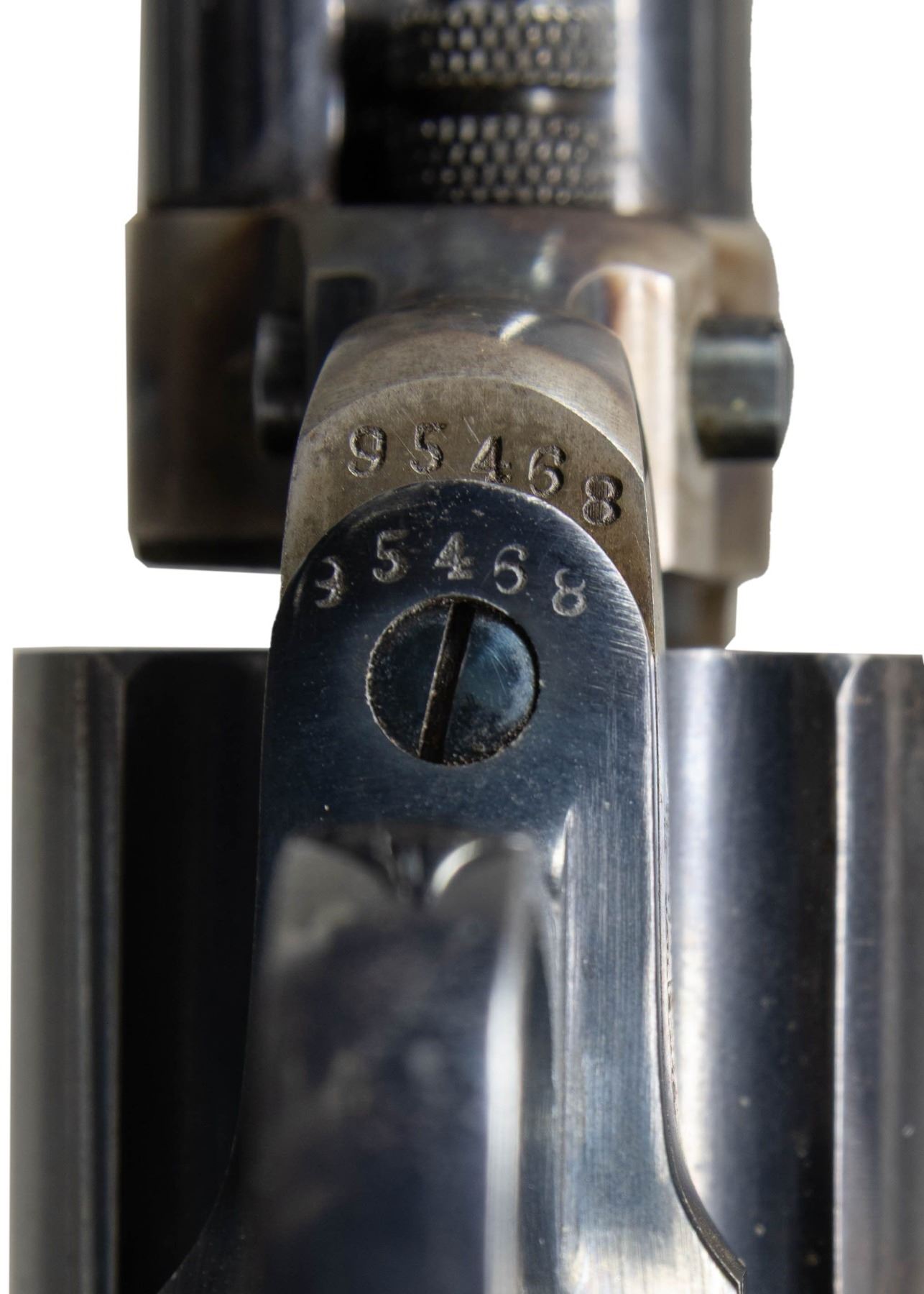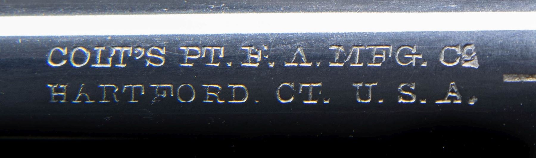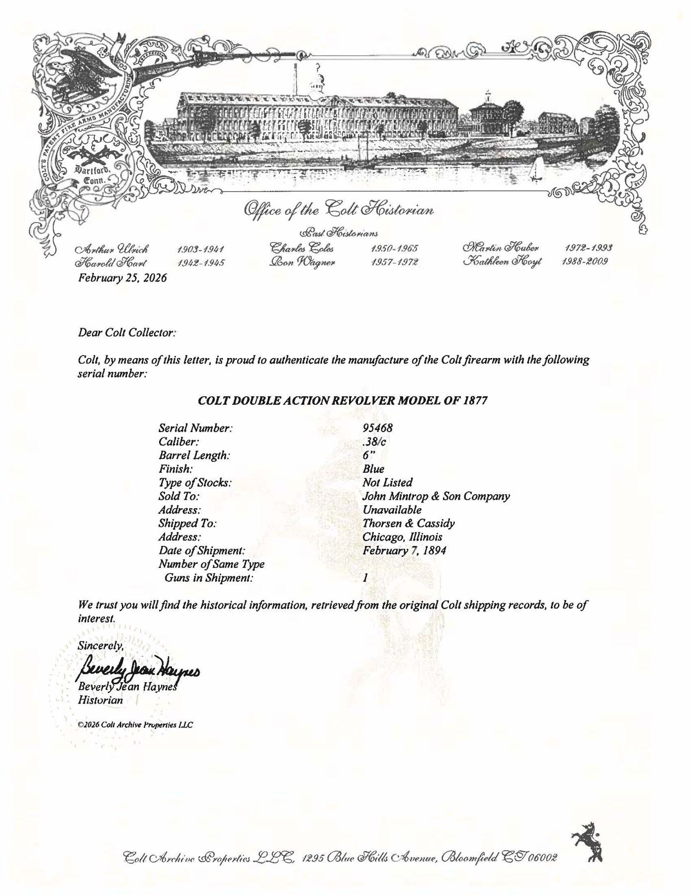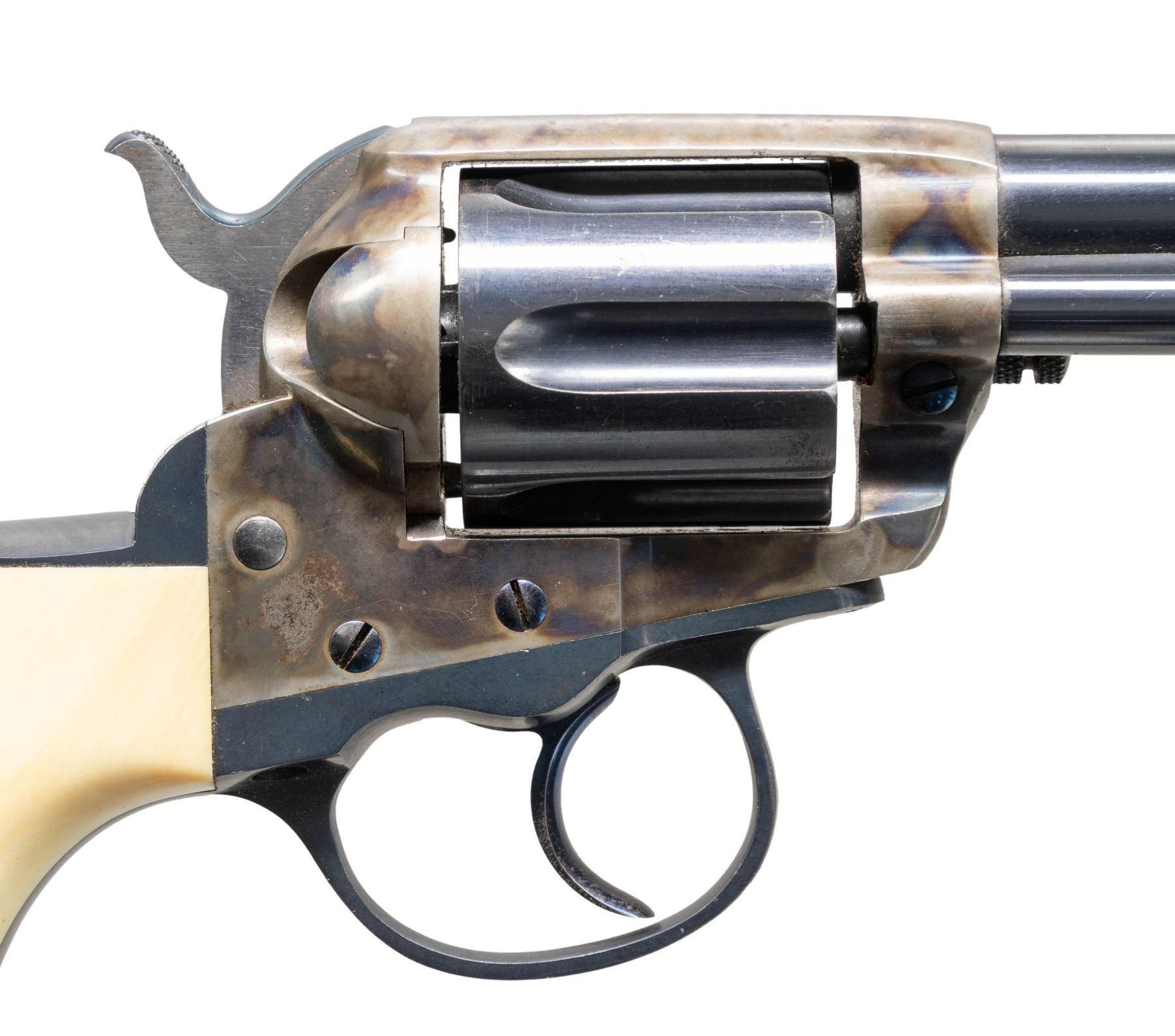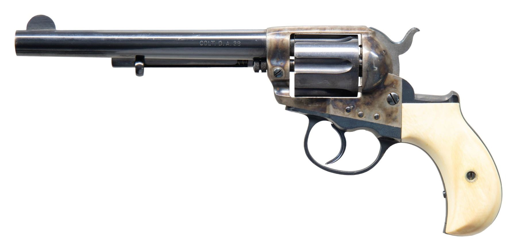 Cal. 38. S# 95468. Standard configuration 1877 double action, 6" barrel, blue and case colored finish, 2-line Hartford address, "COLT DA 38". Fine factory ivory grips with raised relief carved monogram "WPC" Manufactured 1893. NOTE: Email from Colt Archives confirming factory letter states: 38 Cal. 6" bbl. Blue finish. Type of stocks not listed. Sold to Thorsen & Cassidy, Chicago, Il. And shipped to John Mentrop Son & Co. 1 Gun in shipment on February 7, 1894. Factory letter will be forwarded to buyer upon it's arrival. CONDITION: excellent overall, retaining virtually all blue and case colors on frame & barrel, cylinder retains over 80% bright blue. Factory ivory grips are well fit with smooth toned patina. Mechanically fine, shiny rifled bore. PROVENANCE: Martin Lane Historic & Western Americana Lifetime Collection. (01-28167/JS). ANTIQUE. $8,000-12,000.