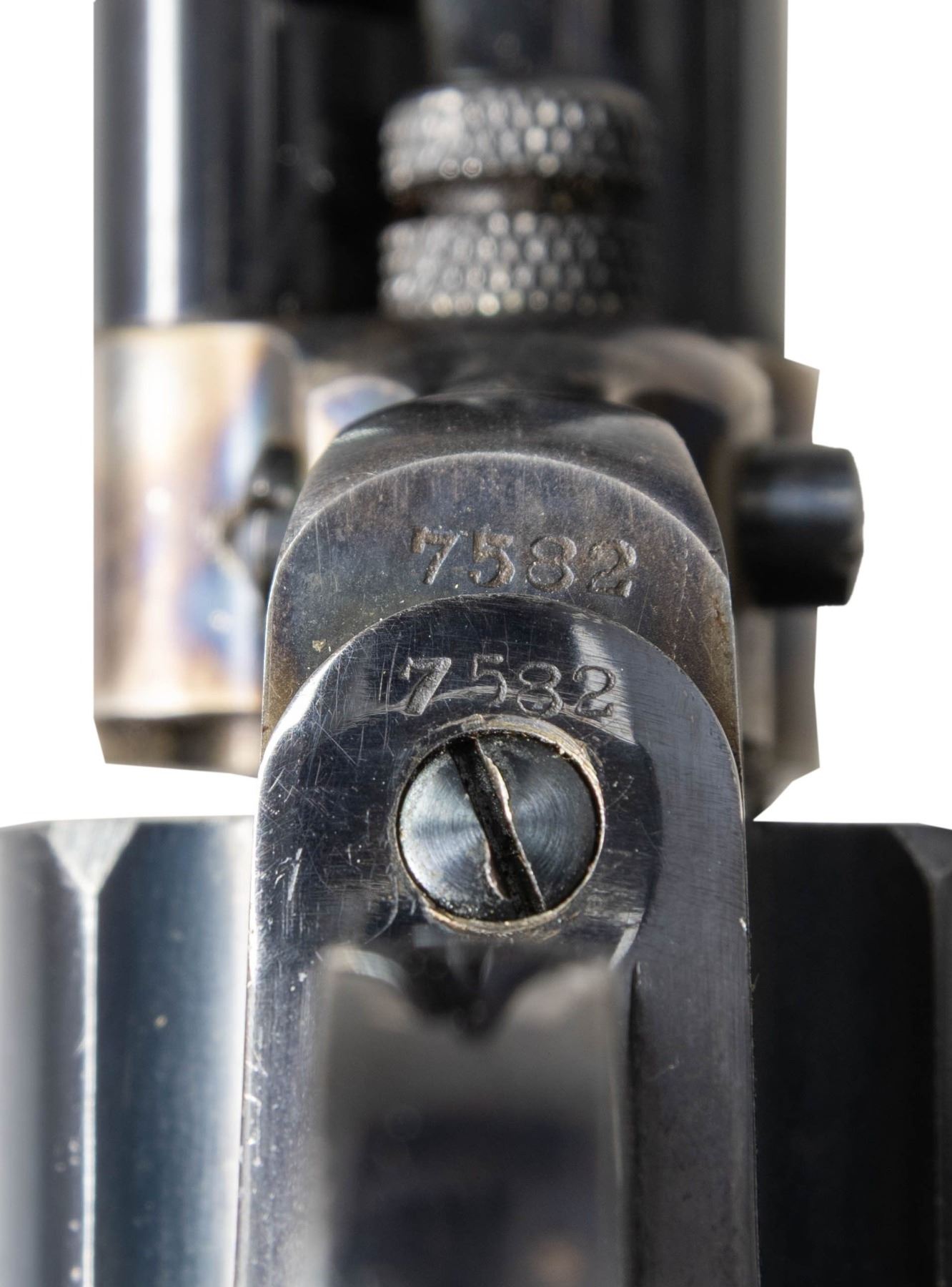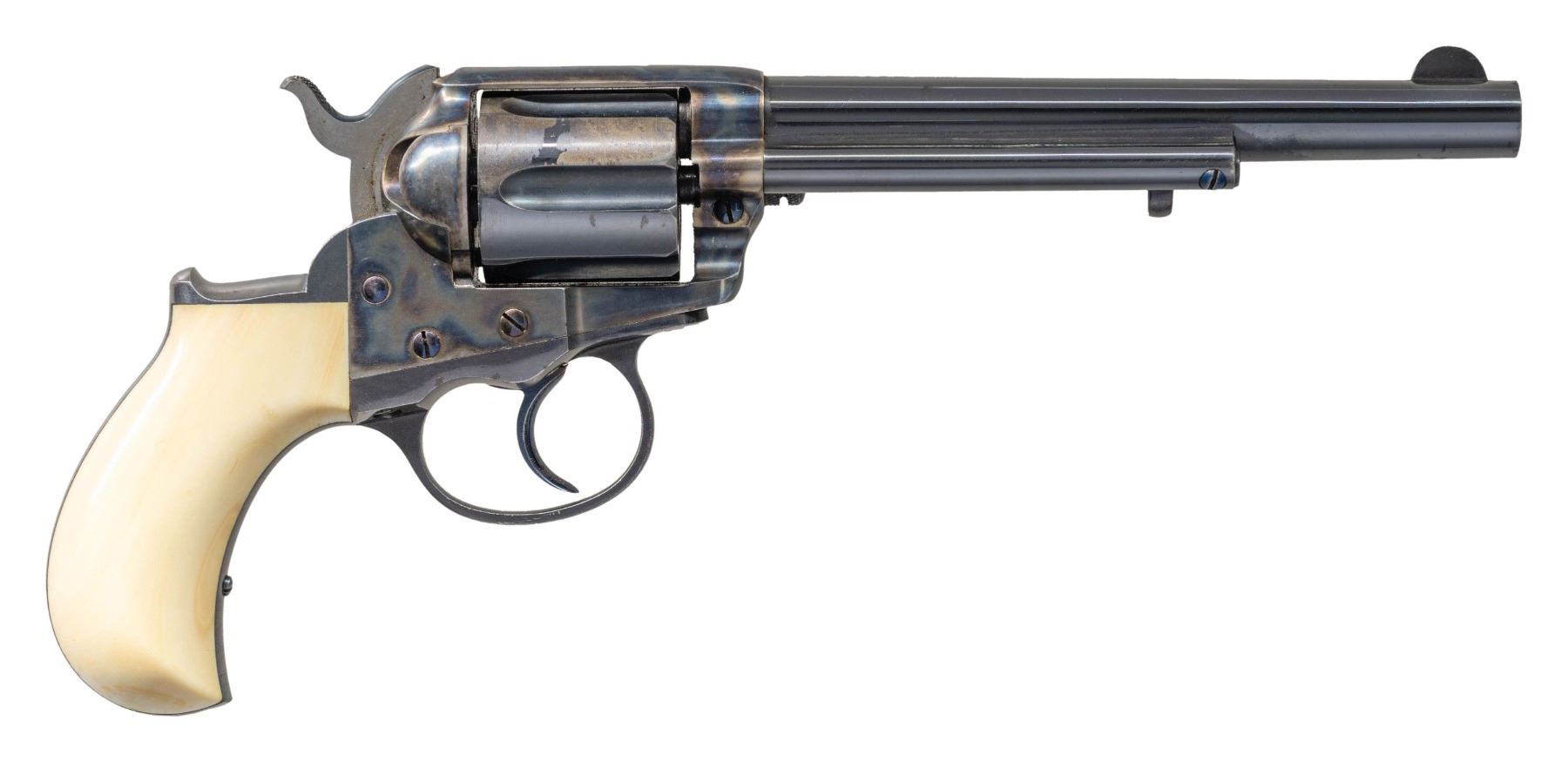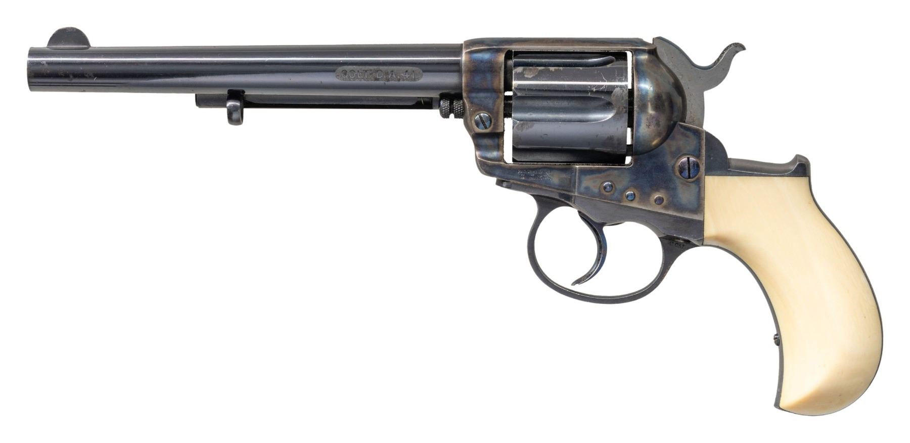 THUNDERER DA REVOLVER. Cal. 41. S# 7582. Standard configuration 1877 double action, 6" barrel, blue and case hardened finish, 2-line Hartford address, etched panel "COLT DA 41". Manufactured 1878. CONDITION: excellent overall, retaining virtually all blue and case colors on frame & barrel, cylinder retains over 80% bright blue. Factory ivory grips are well fit with smooth toned patina. Mechanically fine, shiny rifled bore. PROVENANCE: Martin Lane Historic & Western Americana Lifetime Collection. (01-28168/JS). ANTIQUE. $6,000-8,000.