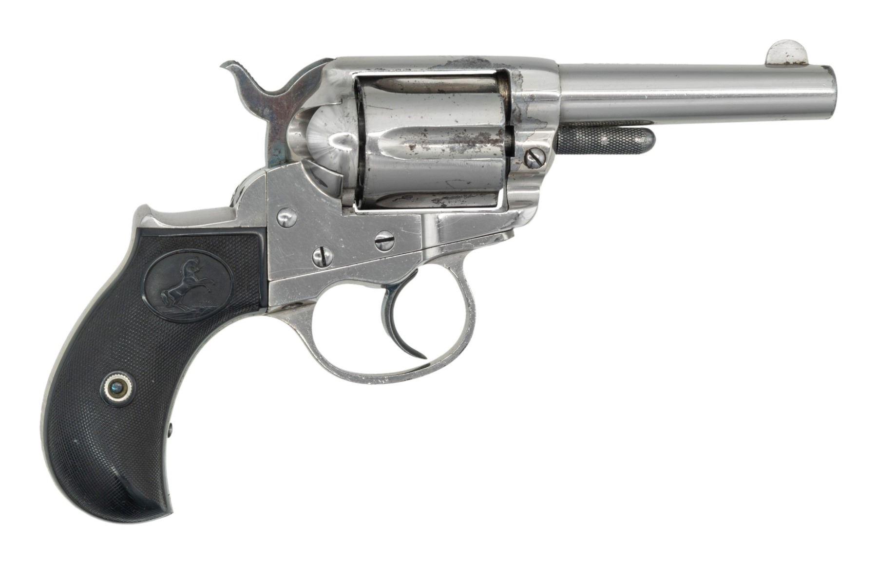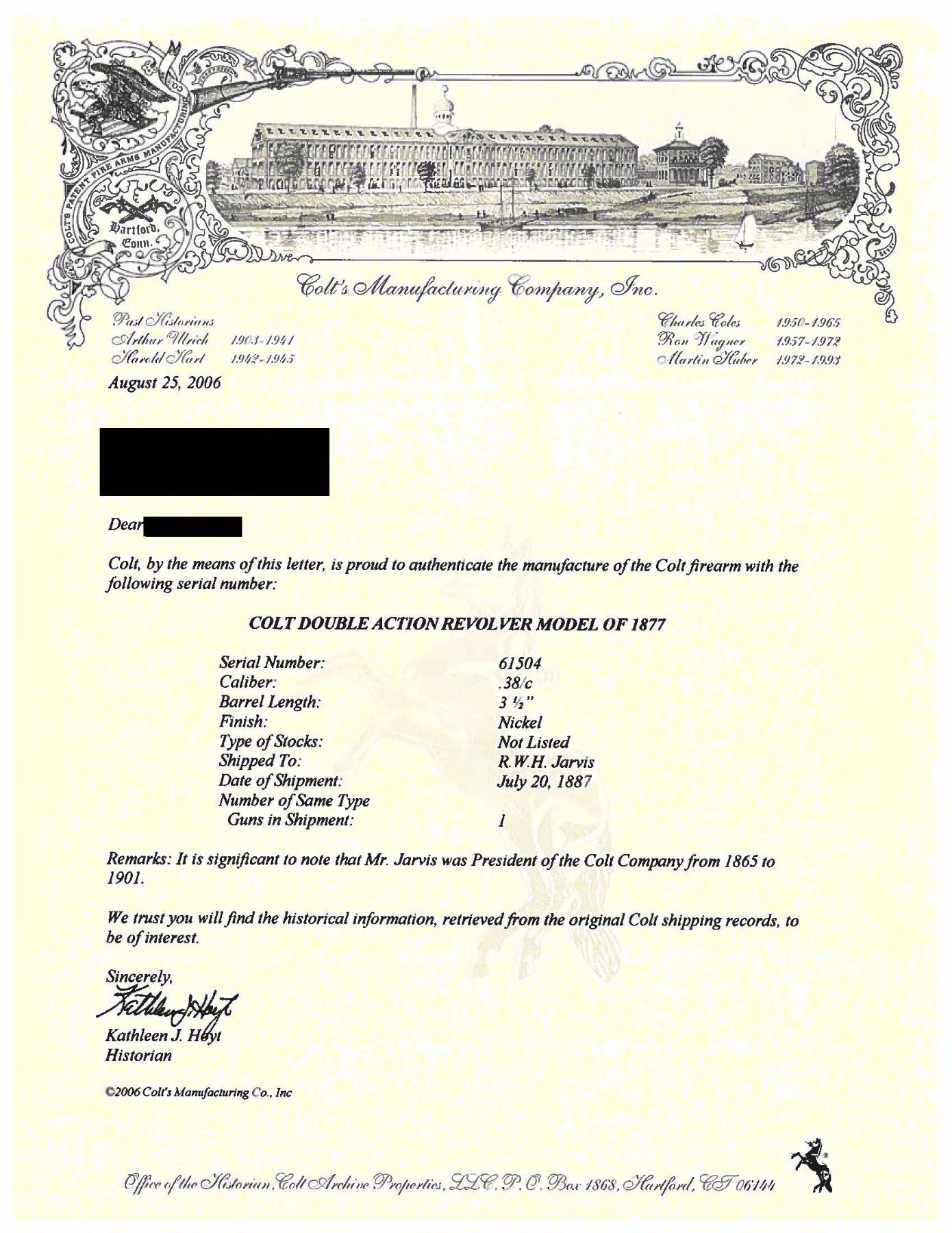 PRESIDENT RICHARD JARVIS. Cal. 38. S# 61504. Standard configuration 1877 double action, 3.5"" barrel, nickel finish, 2-line Hartford address, 3-line patent on frame, hard rubber rampant Colt grips. Richard Jarvis was Samuel Colt's brother-in-law and ran Colt from 1865-1901. This is among a few Colts directly associated to him. UNATTACHED ACCESSORIES: factory letter stating shipment to Colt President Richard Jarvis. CONDITION: fine overall, retaining 90% original nickel with scattered chips and small cosmetic blemishes, grips are well fit, mechanically fine, good rifled bore. PROVENANCE: Estate Collection of John "Jack" Dhooghe. (01-28247/JS). ANTIQUE. $2,500-4,500.