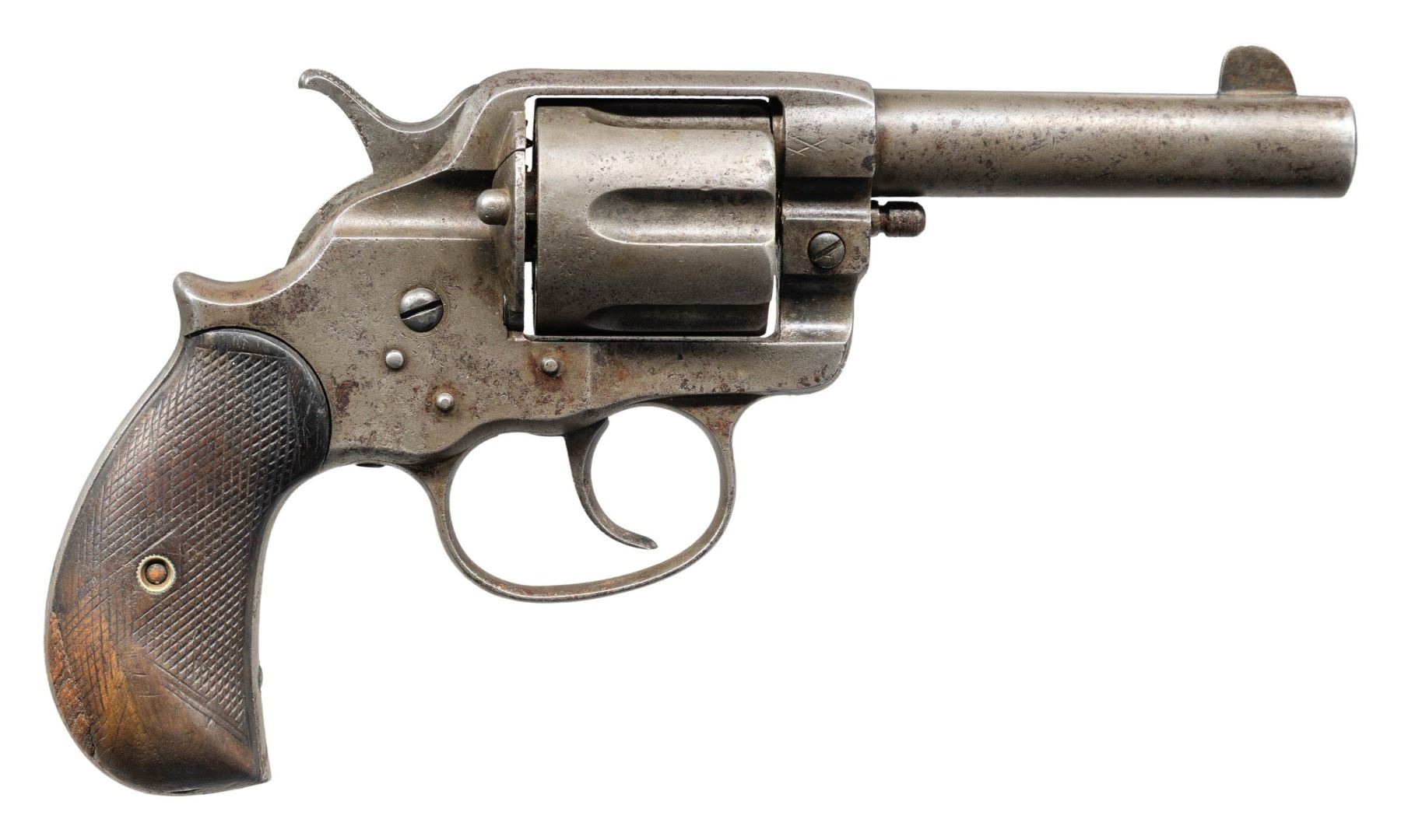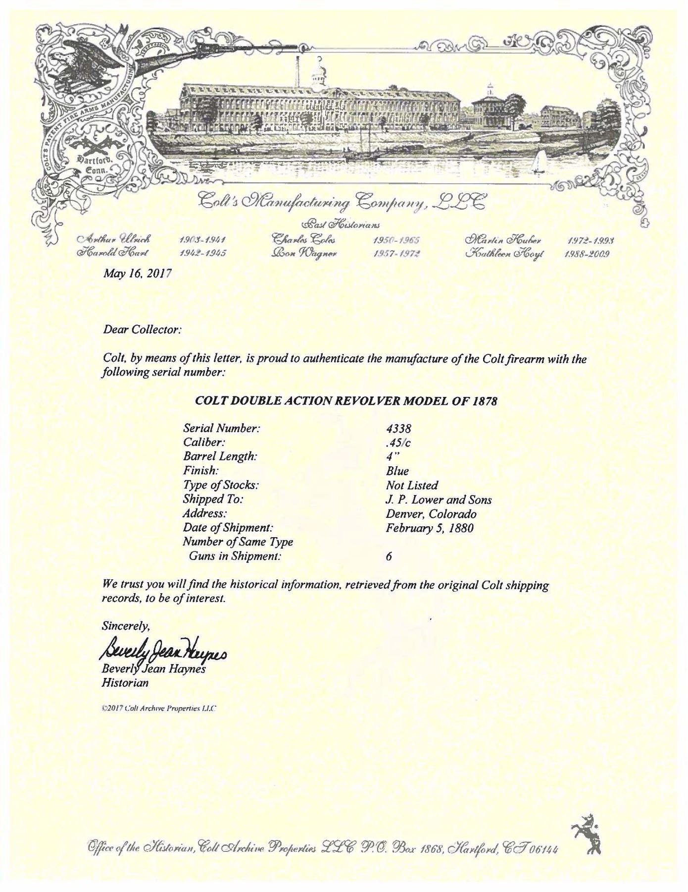 ACTION REVOLVER ID'D TO DEPUTY U.S. MARSHAL WILLIAM THOMPSON WITH HOLSTER, FACTORY LETTER, & PROVENANCE. Cal. 45 Colt. S# 4338. Bbl. 4". Model 1878 double action revolver mfg. by Colt in 1880. Top of the bbl. is faintly marked with Colt's 2-line address. Left side of the frame is retailer marked "J.P. LOWER", with "45 CAL." marked on the left side of the forward trigger guard bow. Frame is mounted with 2-piece checkered wood grips. Standard fixed blade front sight and frame notched rear sight. Frame and bbl. mfg. without provision for ejector rod housing, with no provision for lanyard swivel on butt. Interior of grip panels match the frame via a handwritten "4338" (very faint on left panel). Accompanying documentation indicates that this revolver was used by Deputy U.S. Marshal in the shooting of Edward Meeks Dalton, whom was wanted on a misdemeanor charge of Polygamy for having two wives, and ultimately was considered a martyr by the Mormon community across the United States at the time. To this day, Dalton is the only Mormon to have been killed at the hands of a Federal Marshal, and is the only known death over polygamy before the church's October 6, 1890 declaration to abolish the plural marriage custom. UNATTACHED ACCESSORIES: finely tooled brown leather holster, featuring a tool Mayan pattern glyph on the front of the body, an unmarked brown leather belt, as well as a Deputy U.S. Marshall badge. Revolver is accompanied by a range of documentation, including: a Colt factory letter stating: "Serial Number: 4338/ Caliber .45/c/ Barrel Length: 4"/ Finish: Blue/ Type of Stocks: Not Listed/ Shipped To: J.P. Lower and Sons/ Address: Denver, Colorado/ Date of Shipment: February 5, 1880/ Number of Same Type Guns in Shipment: 6", a letter dated March 2nd of 1951 from the wife of a previous owner indicating that this revolver was given to her husband by Oscar Thompson (son of William Thompson Jr.), an article detailing the shooting of Edward Meeks Dalton by William Thompson on December 16th of 1886, scans of Dalton's grave, as well as additional documents detailing the shooting and its significance. CONDITION: metal components have faded to a gray/brown patina, exhibiting scattered handling marks and scattered spots/patches of mild pitting overall. Bore is relatively bright, exhibiting consistent mild to moderate pitting, while retaining strong rifling throughout. Proper manual mechanics. Grips show moderate smoothing, as well as scattered marks and impressions from handling and storage, with the right panel exhibiting a repair along the rear edge. Holster is very good overall, remaining malleable, and exhibiting consistent crazing on the belt. PROVENANCE: From the Buckstix Collection. (01-28592/MLW). ANTIQUE. $4,000-6,000.
