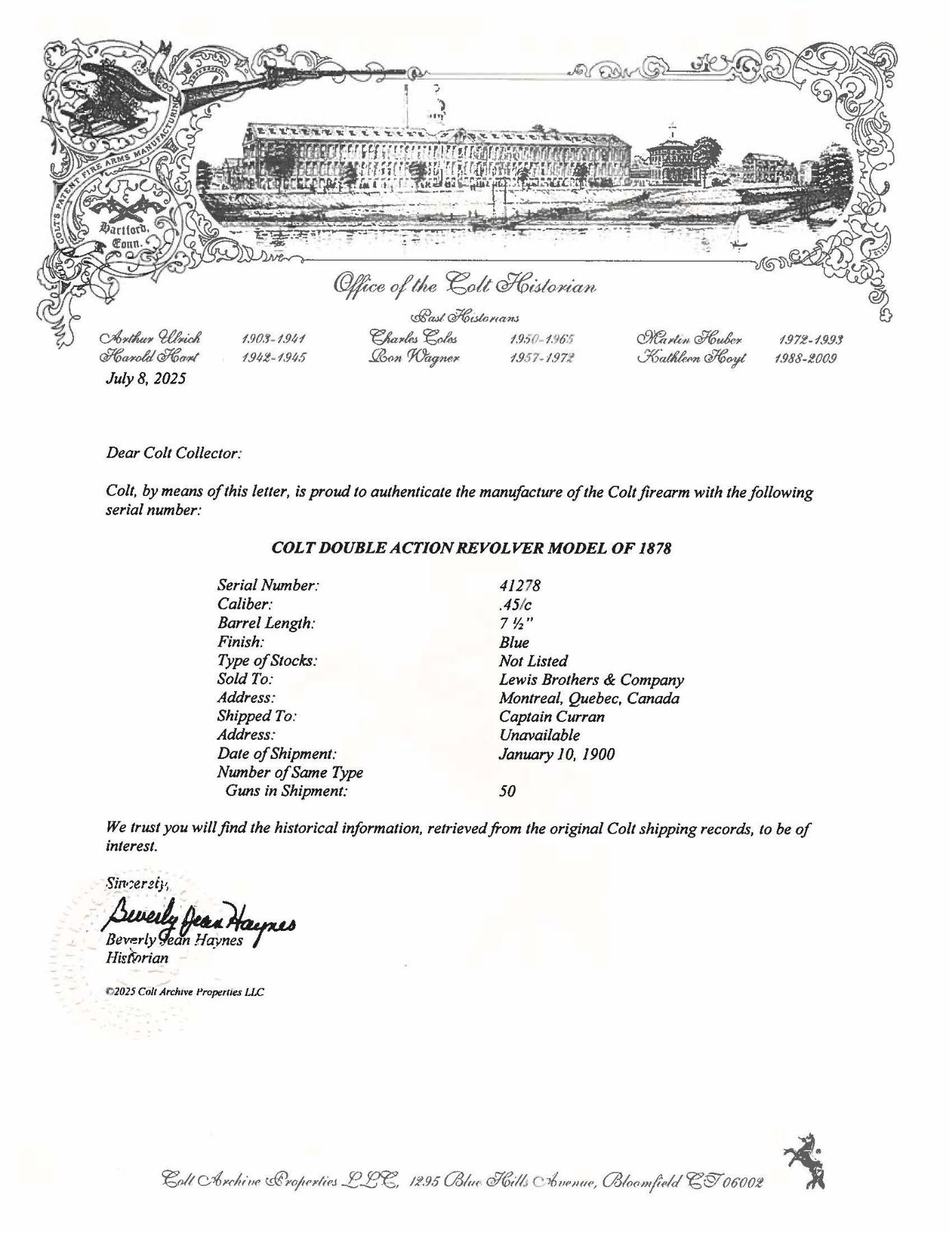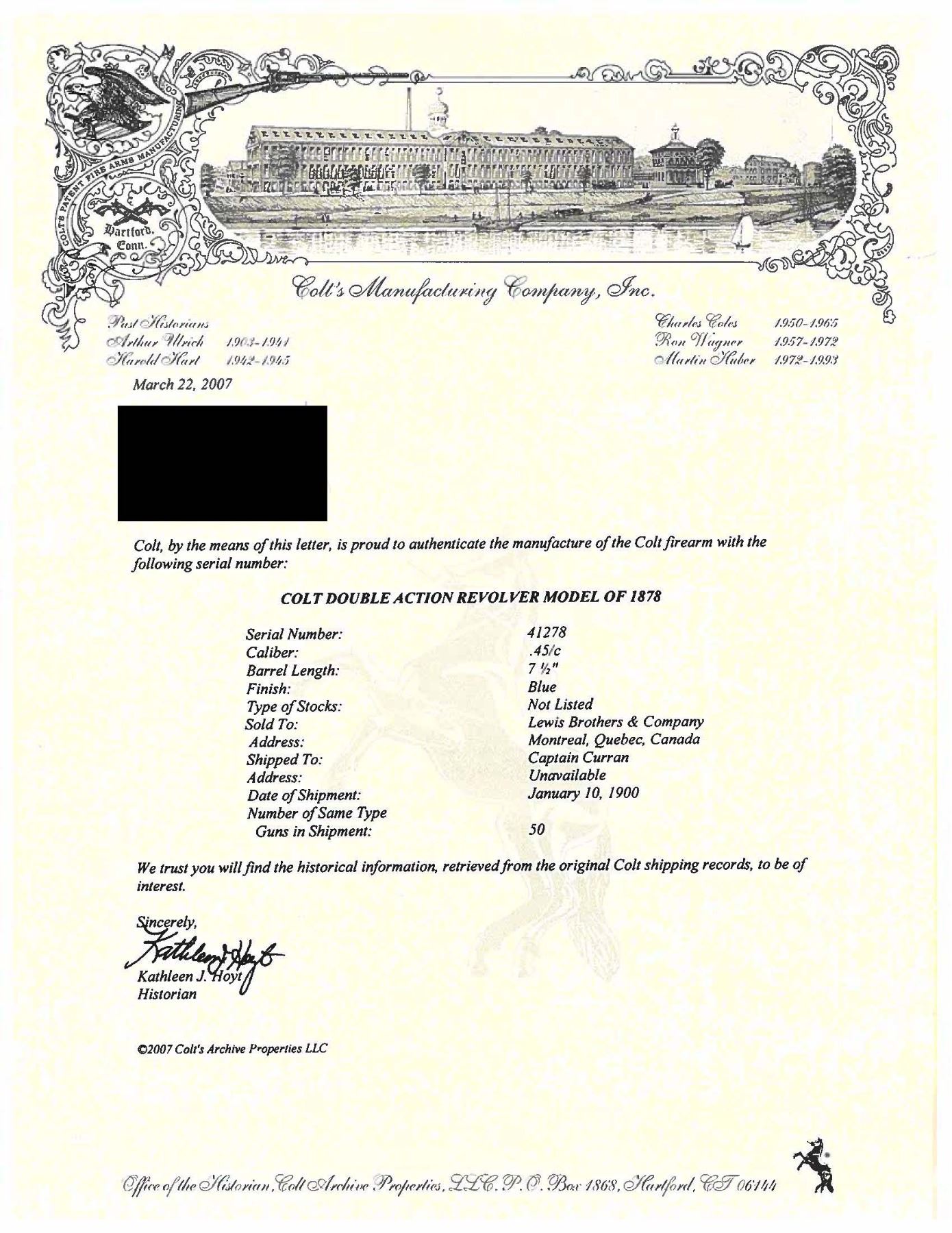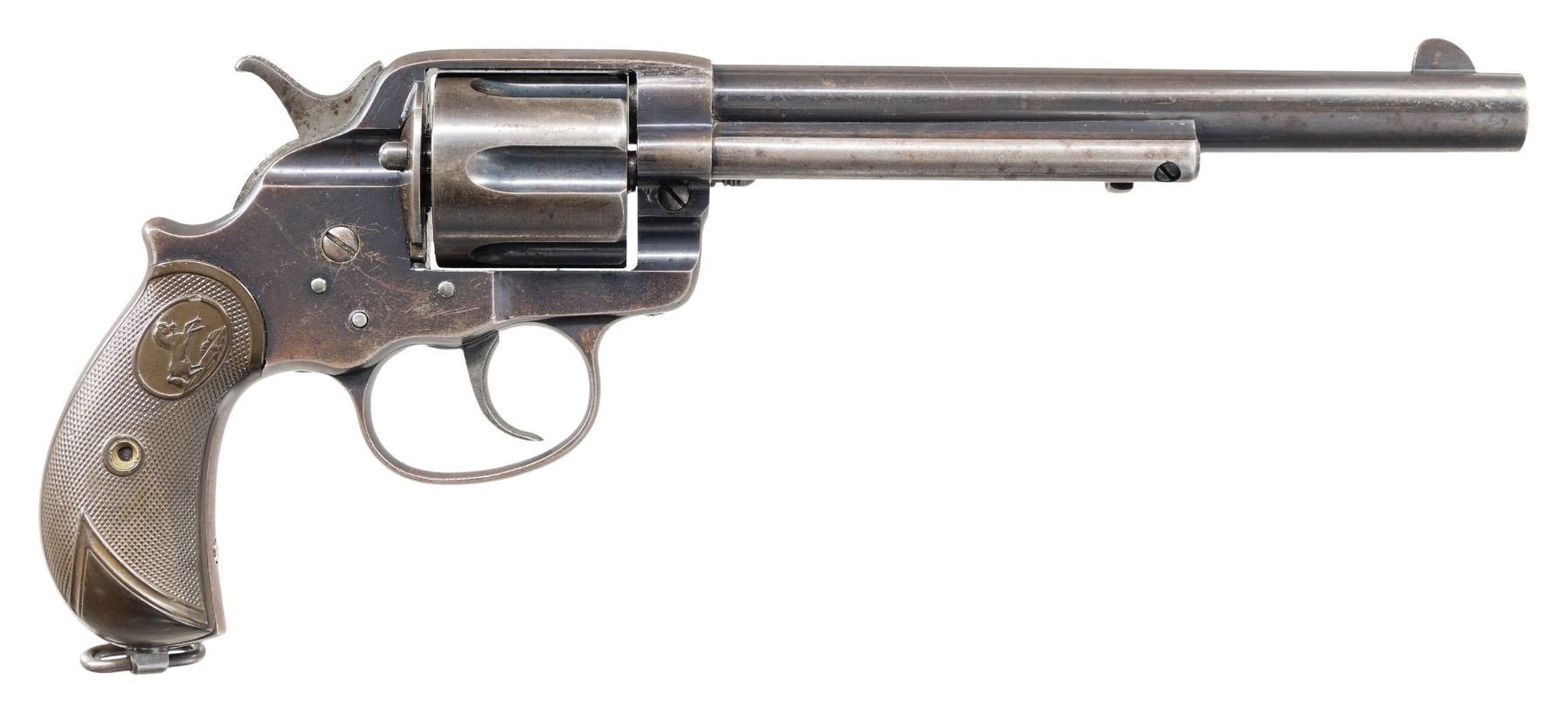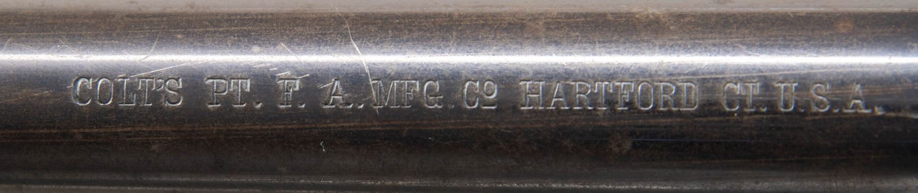 TO CANADA FOR USE IN THE 2ND BOER WAR. Cal. 45 Colt. S# 41278. Per Colt Letter, this revolver was 1 of 50 shipped Jan. 10, 1900 to the Lewis Brothers & Company of Montreal, Quebec, Canada for a Captain Curran. As per "Colt's Double-Action Revolver Model of 1878" by Don Wilkerson (pg. 135), "Several Canadian units were raised to go to South Africa....Other Canadian united were recruited on behalf of the War Office and were considered to be British units. One of these British units may have also been armed with Model 1878 revolvers. Beginning on January 5, 1900, Colt sent six shipments, consisting of 50 revolvers each, to Lewis Brothers & Company in Montreal for a Captain Curran. There were 300 revolvers in all, .45 caliber, 7 1/2" barrels with blue finish." This revolver has 7.5" bbl. w/ blade front sight. Blued revolver with lanyard loop at butt & two piece hard rubber Colt grips. UNATTACHED ACCESSORIES: Colt letter. Brown leather holster written "R.F. Dove" on interior of flap, back of holster written "WHITE HURST" & another name scratched out. CONDITION: fair fading blue mixing with brown/gray patina throughout showing muzzle wear, scattered scratches & marks. Good grips with light wear & paint added to left panel. Very good rifling. PROVENANCE: From the Buckstix Collection. (25-6347/MD). CURIO. $3,000-4,000.