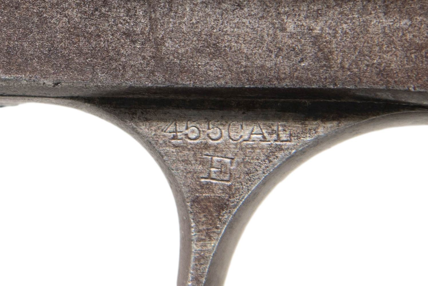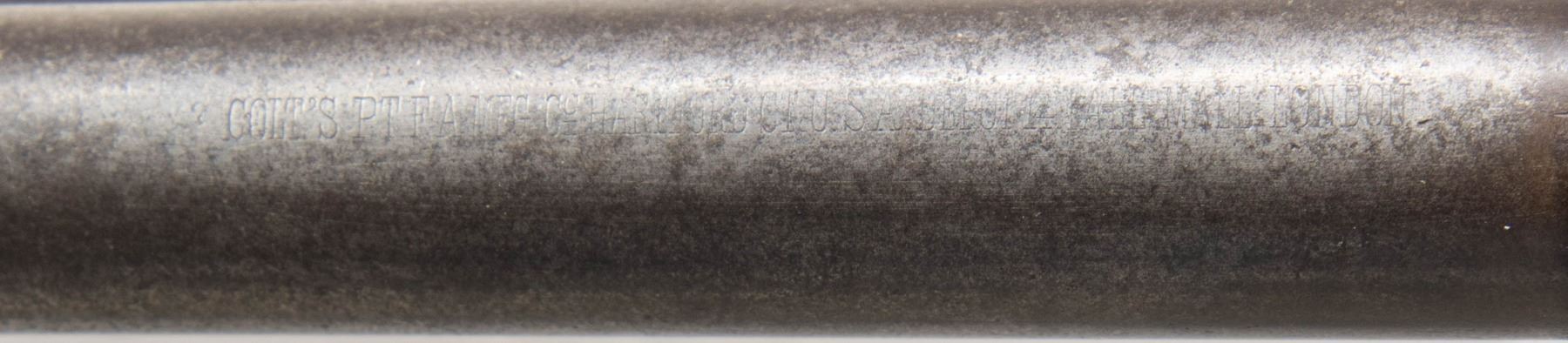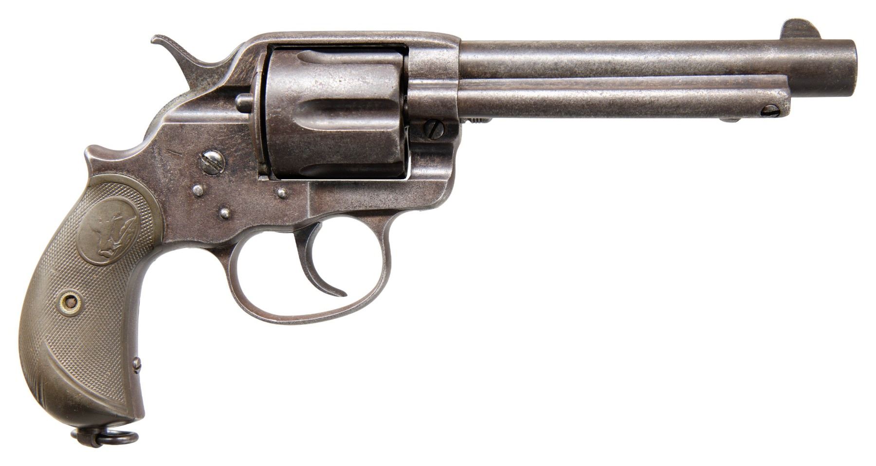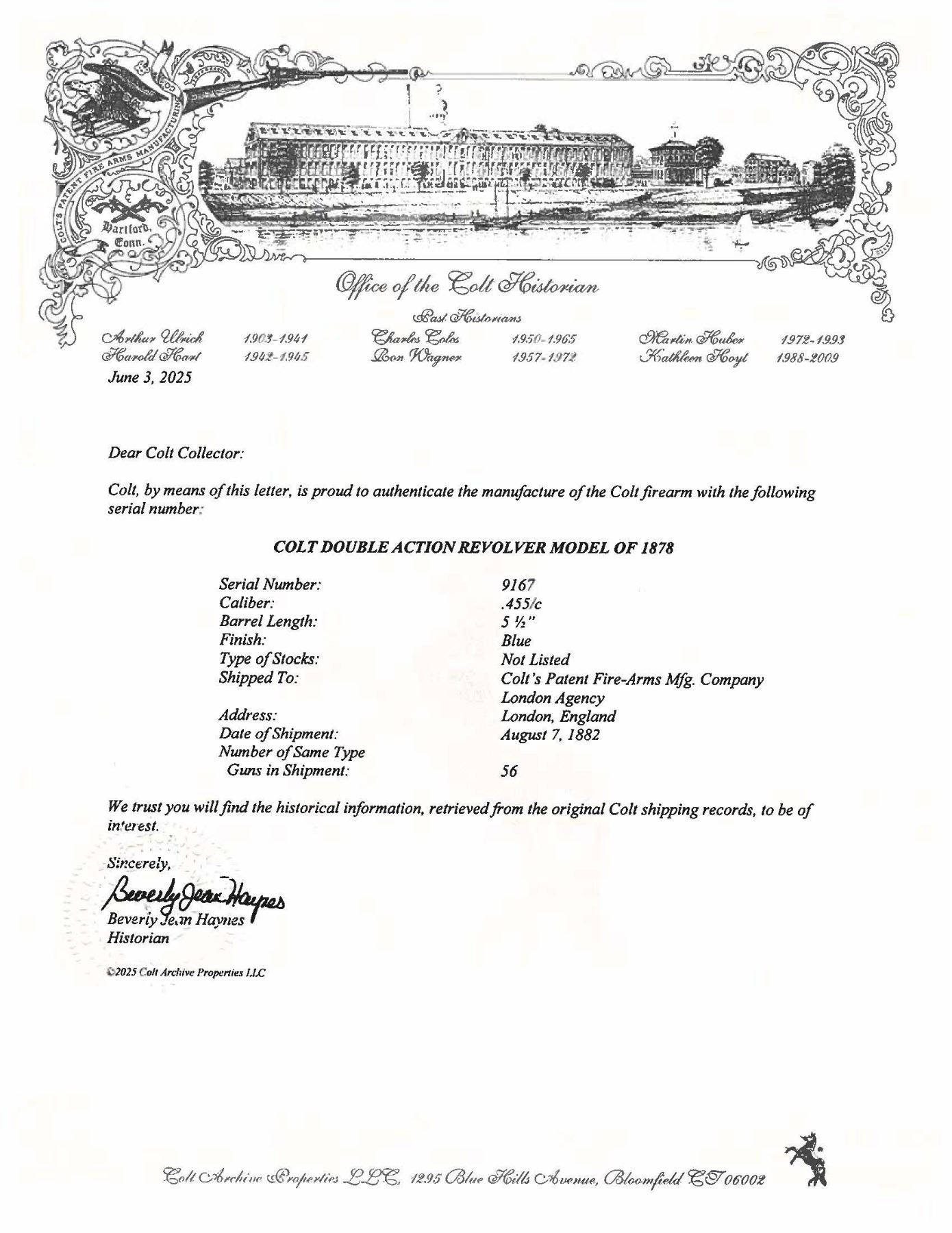 ACTION REVOLVER WITH FACTORY LETTER. Cal. 455 Eley. S# 9167. Bbl. 5 1/2". 1 of only approx. 1,147 Model 1878 double action revolvers chambered in .455 Eley with 5 1/2" bbls. mfg. by Colt. This example, mfg. in 1882, is marked "COLT'S PT.F.A MFG Co HARTFORD CT.U.S.A.DEPOT14.PALL MALL LONDON" across the top of the bbl. Left side of the forward trigger guard web is marked "455 CAL/ E". Small British proofs are present between the flutes on the cyl., as well as on the underside of the bbl. towards the breech. Frame is mounted with 2-piece Colt checkered brown hard rubber grips, featuring a lanyard swivel and ring on the butt. Standard fixed blade front sight and frame notched rear sight. Matching numbers are present on the frame and cyl., with the frame and loading gate matching via assembly # "413". UNATTACHED ACCESSORIES: Colt factory letter stating: Serial Number: 9167/ Caliber: .455/c/ Barrel Length: 5 1/2"/ Finish: Blue/ Type of Stocks: Not Listed/ Shipped To: Colt's Patent Fire-Arms Mfg. Company/ London Agency/ Address: London, England/ Date of Shipment: August 7, 1882/ Number of Same Type Guns in Shipment: 56". CONDITION: metal components retain traces of original blue finish, with the balance having faded to a dark mottled gray patina, exhibiting consistent light pitting, with scattered patches/areas of mild pitting present overall. Bore is relatively bright, exhibiting consistent mild pitting and some scattered spots of moderate pitting, while retaining strong rifling throughout. Proper manual mechanics, with some cyl. play. Grips show smoothing, as well as some scattered marks from handling and storage, but otherwise remain sound. PROVENANCE: From the Buckstix Collection. (01-28610/MLW). ANTIQUE. $2,500-3,500.