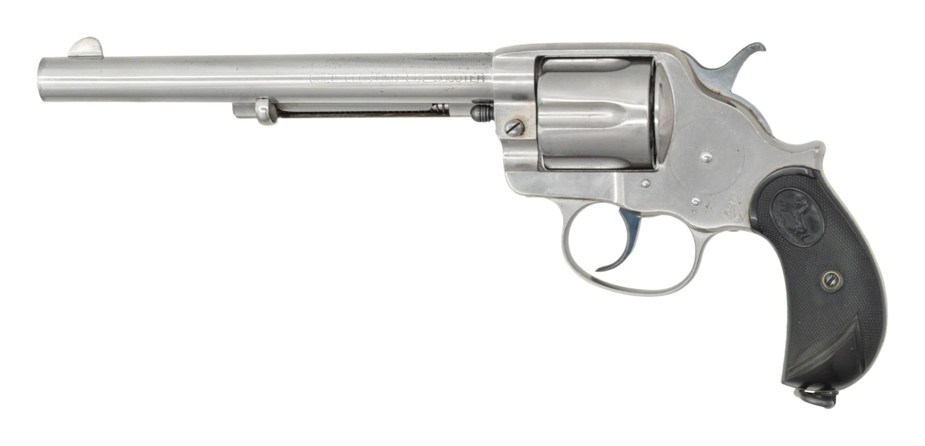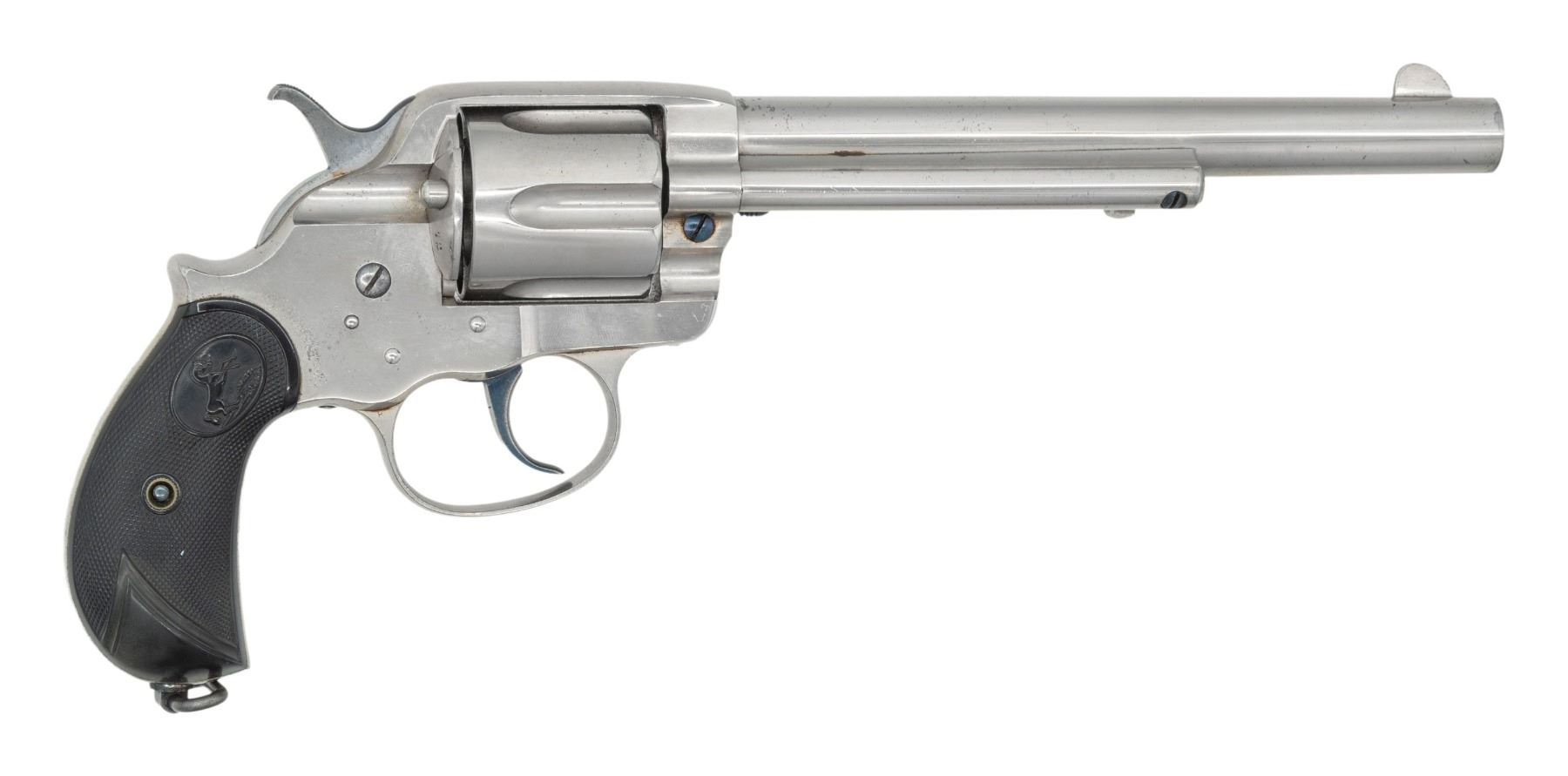 SIX SHOOTER DOUBLE ACTION REVOLVER. Cal. 44-40. S# 40119. Bbl. 7 1/2". Model 1878 Frontier Six Shooter double action revolver mfg. by Colt in 1898. Left side of the bbl. is marked "COLT FRONTIER SIX SHOOTER", with Colt's single line address marked across the top, and "44" stamped on the underside towards the breech. Left side of the frame is marked with the encircled Rampant Colt logo. Metal components exhibit a nickel plated finish overall, with screws, top strap of hammer, and the trigger exhibiting a nitre blue finish. Frame is mounted with 2-piece Colt checkered brown hard rubber grips, featuring a lanyard swivel and ring on the butt. Standard blade front sight and frame notched rear sight. All serialized parts are matching and include the frame and cyl. Matching assembly # "72" is present on the frame (beneath the left grip panel) and on the loading gate. Grips are unnumbered, with the left grip exhibiting a hand inscribed "AWV/ 48" on the interior of the panel. CONDITION: metal components retain the vast majority of their original nickel plated finish, showing some scattered spots and small patches of light flaking overall. Nickel plating on butt section of frame has acquired a cloudy appearance. Nitre blue parts retain good amounts of their original finish in protected areas, with contact points having worn to a gray patina. Very bright bore, exhibiting scattered spots of light pitting and some small patches of mild pitting, while retaining strong rifling throughout. Proper manual mechanics, with tight lock up. Grips are very good overall, showing light wear, with few minor superficial handling marks present overall. An especially attractive nickel plated Colt Model 1878 Frontier Six Shooter. PROVENANCE: The Esteemed Norm Greenberg Collection. (01-28736/MLW). ANTIQUE. $1,500-2,000.