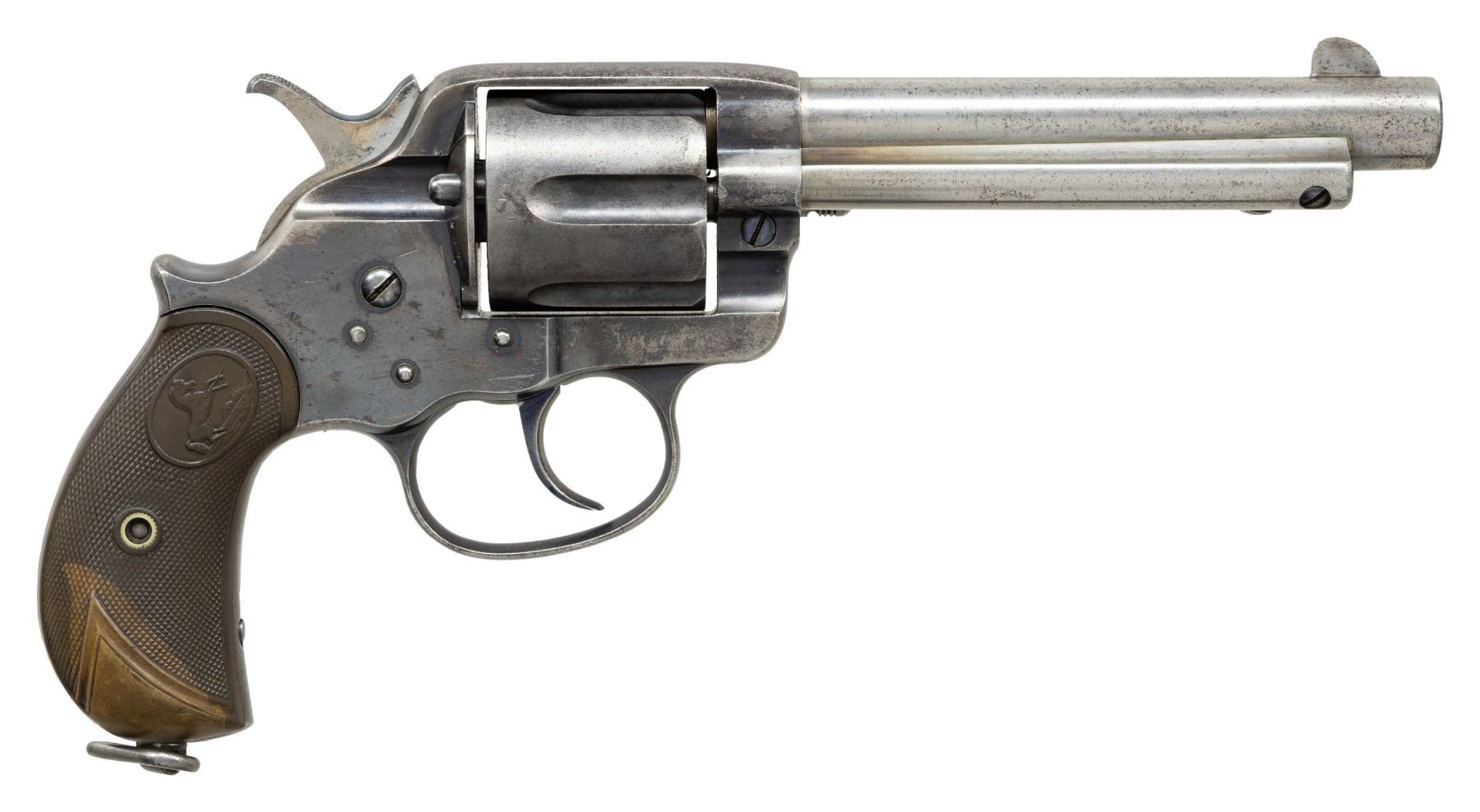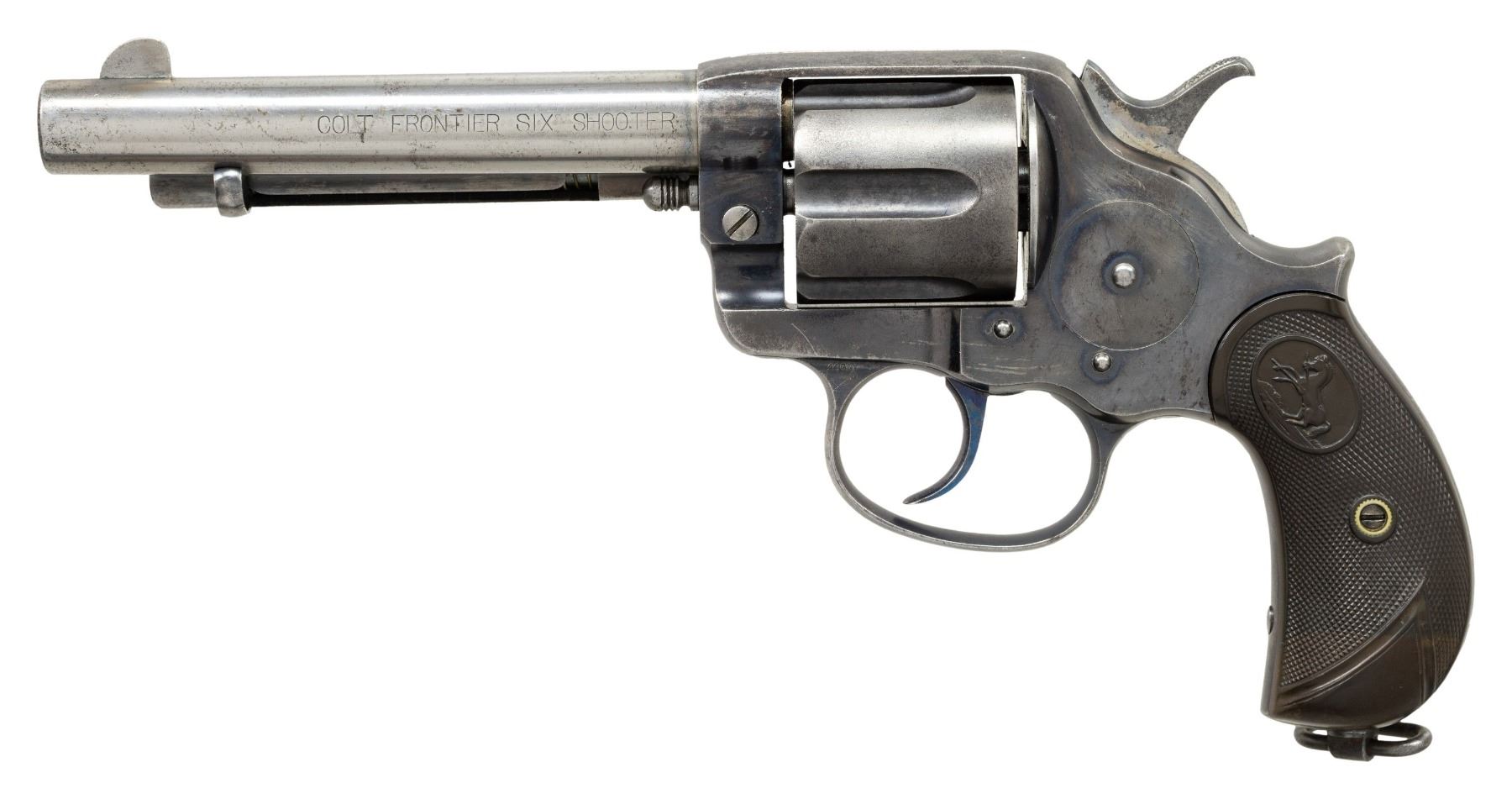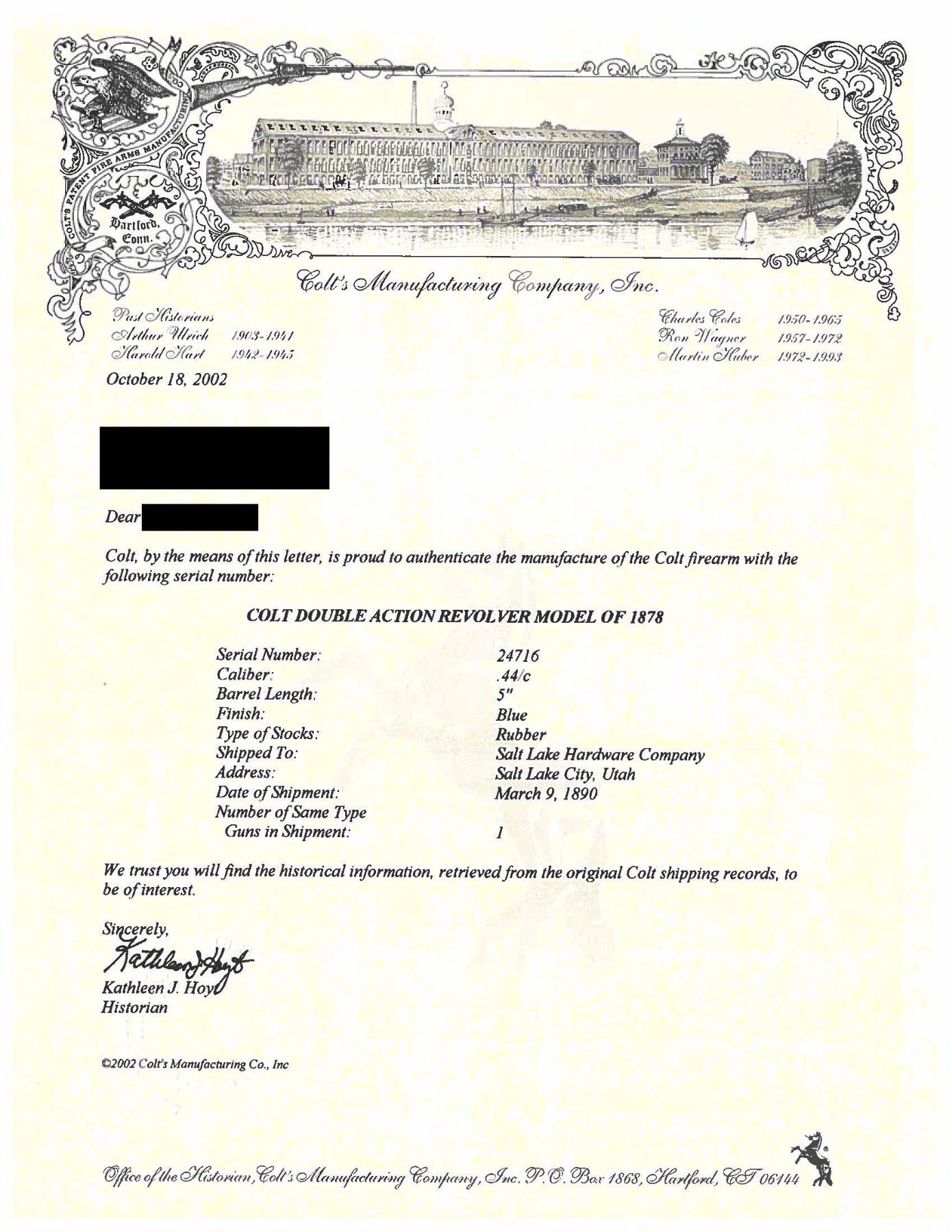 Cal. 44-40. S# 24716. Bbl. 5 3/8" with blade front sight. Long flute six shot cylinder. Blue finished with polished hammer sides. Two piece checkered hard rubber grips with rampant colt motifs. Butt of gun is fitted with a lanyard loop. UNATTACHED ACCESSORIES: letter from Colt's Manufacturing Company Inc. detailing the following information, "Serial Number: 24716 / Caliber: .44/c / Barrel Length: 5" / Finish: Blue / Type of Stocks: Rubber / Shipped To: Salt Lake Hardware Company / Address: Salt Lake City, Utah / Date of Shipment: March 9, 1890 / Number of Same Type Guns in Shipment: 1". CONDITION: barrel and ejector housing have a clean gray appearance showing scattered light pitting. Action and cylinder retain 60% fading blue showing small dents and spots of fine pitting. Grips show light wear with some fading at the butt. Functioning action, cylinder exhibits some side play. Bore has intact rifling showing scattered pitting. (01-28475/DS). ANTIQUE. $1,200-1,600.