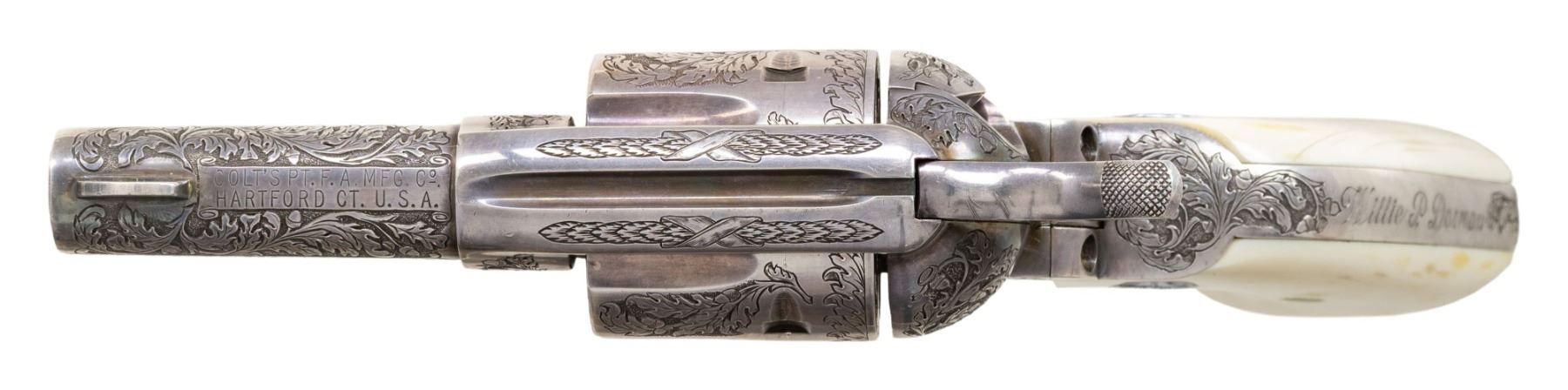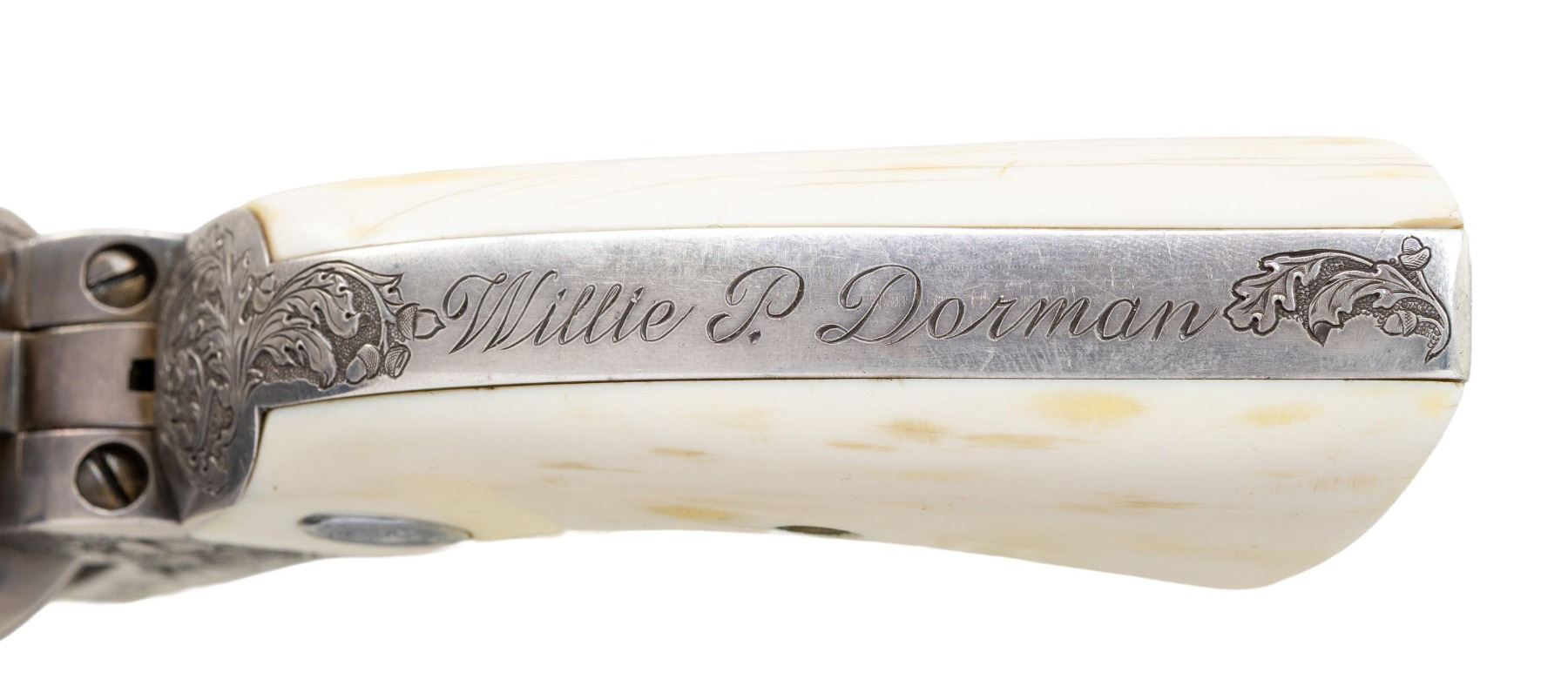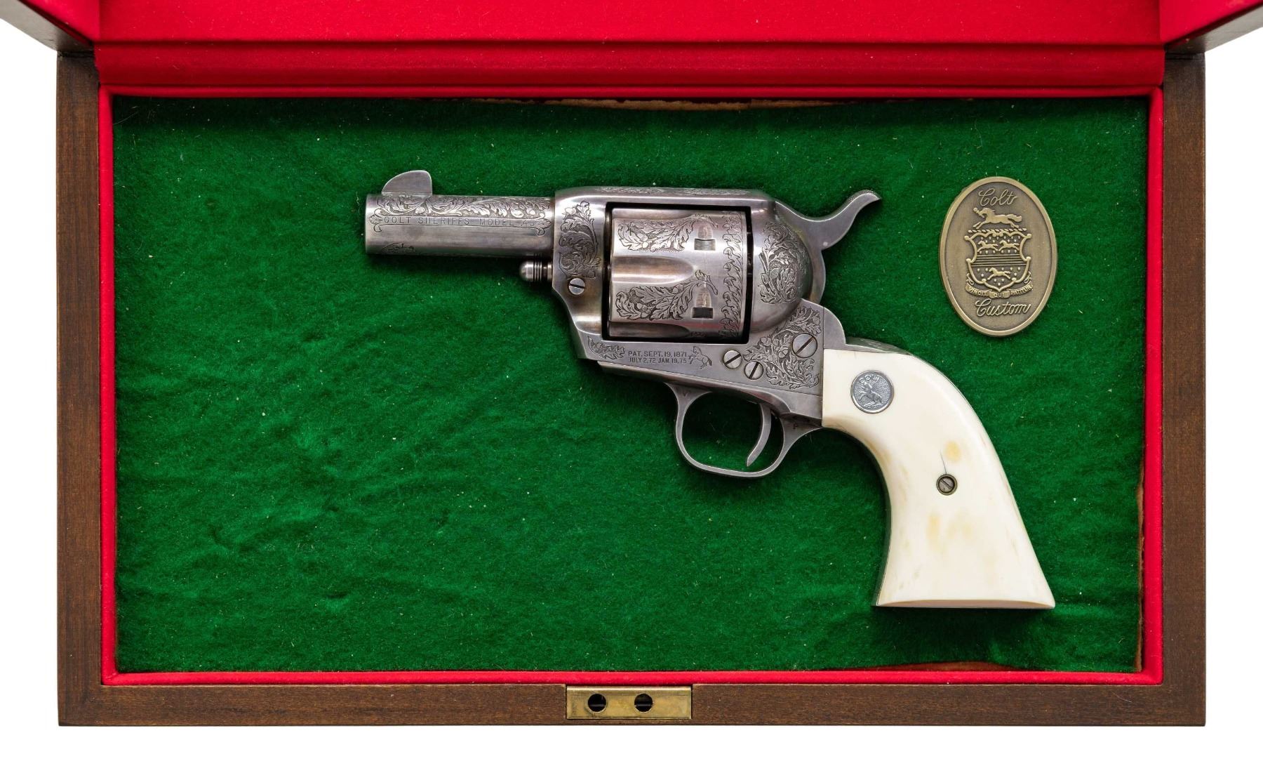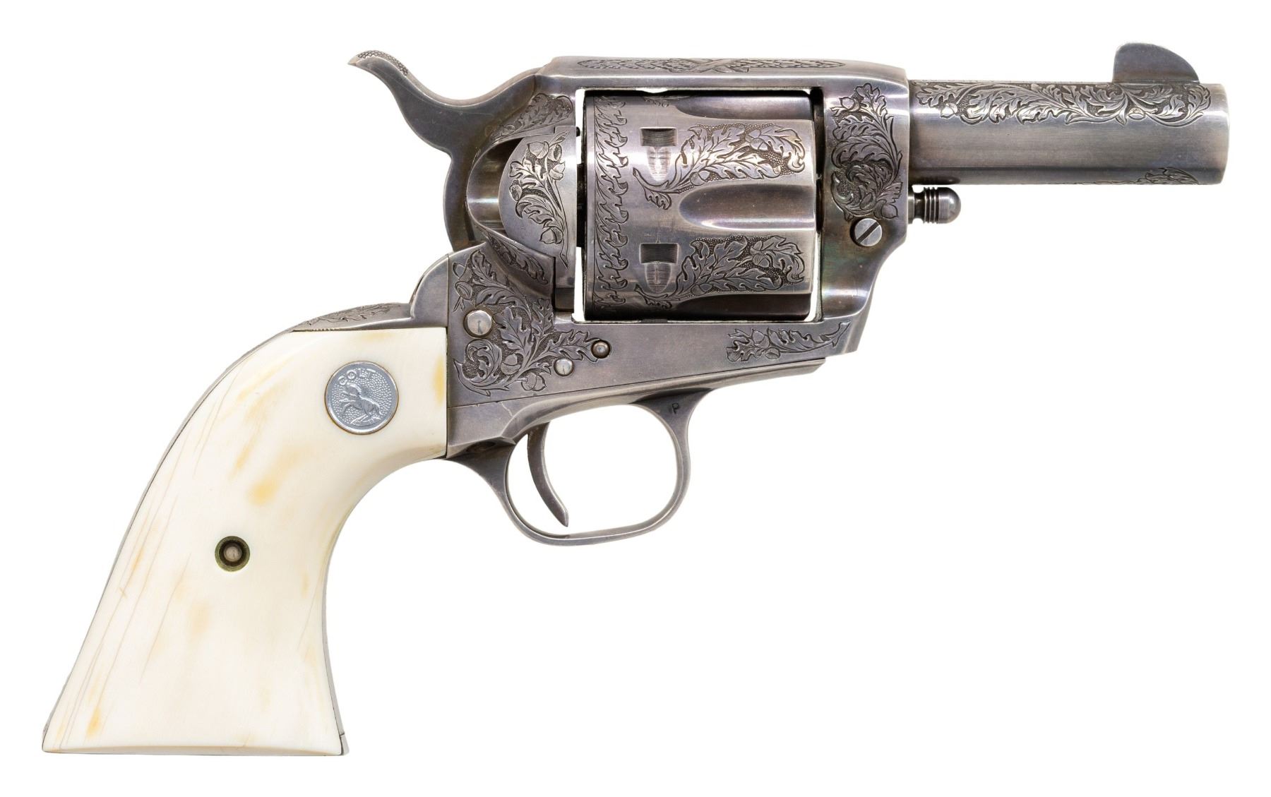 SILVER PLATED & OAK LEAF AND ACORN ENGRAVED COLT SECOND GENERATION SHERIFF'S MODEL SAA REVOLVER. Cal. 45 Colt. S# 0239SM. Bbl. 3" ejectorless with blade front sight. When one thinks of factory engraved SAA revolvers, typical engraving patterns would be Germanic of Foliate scrollwork over a punch dot background. Originally mfg. 1960, subject revolver was sent back to the factory Feb. 12, 1979 for additional customizing. As noted in the factory letter, revolver features one-of-a-kind "B" coverage oak leaf & acorn relief engraving. Backstrap has inscription "Willie P. Dorman". Lower left of grip frame under grip marked "H. DOVE ENGR 1979". Consignor states that this was the only revolver Dove engraved in this style as it was a pattern he usually reserved for longarms. Revolver is finished in full silver plating. Howard Dove (1942-1994) is widely considered as one of the greatest contemporary engravers of all time. He was one of only 2 individuals to ever be employed by the Colt Custom Shop & Winchester Custom Shop at the same time and was known as The Official Engraver of the Colt Collector's Association as he engraved a total of 6 "show guns". Following his untimely passing, the Colt Collector's Association dedicated an annual award at their yearly convention for "Best Engraved Colt"; The Howard Dove Award. Revolver is stocked with 2 piece ivory grips emblazoned with silver Rampant Colt medallions, grips are numbered to gun. This gun was featured in an article in "GUNS" magazine (April 1987) by Robert Omeara. UNATTACHED ACCESSORIES: Colt factory letter stating the following: "Serial Number: 0239SM / Caliber: .45/c / Barrel Length: 3" / Finish: Blue / Type of Stocks: Not Listed / Shipped To: Centennial Arms Corp. / Address: 3318 W. Devon St. Chicago, IL / Date of Shipment: October 13, 1960 / Number of Same Type Guns in Shipment: 200 / Remarks: the records further indicate Subject revolver was returned to the factory February 12, 1979 for additional customizing. The customizing was processed on Colt Repair Order Number 87812 and consisted of oak leaf style Type "B" master engraving, the inscription "Willie P Dorman" engraved in script style on the backstrap and the installation of ivory stocks with silver medallions which were supplied by the customer. The revolver was refinished in silver and subsequently reshipped to Mr. Willie P. Dorman c/o Ace Pawn Shop, Fayetteville, NC". Revolver is housed in a glass top walnut presentation case containing replica Sheriff's badge and Colt Custom Shop medallion. CONDITION: there are a couple scratches on top of hammer and faint cyl. drag line otherwise, metal is near excellent. Silver plating acquiring a pleasing dark tarnish with age. Grips are very good with a few scattered stable hairlines from age shrinkage. Near excellent bore. This is a unique opportunity to own a one-of-a-kind masterpiece engraved by one of the most highly regarded and respected contemporary engravers of all time.PROVENANCE: From the Buckstix Collection. (25-6323/BH). CURIO. $15,000-22,500.