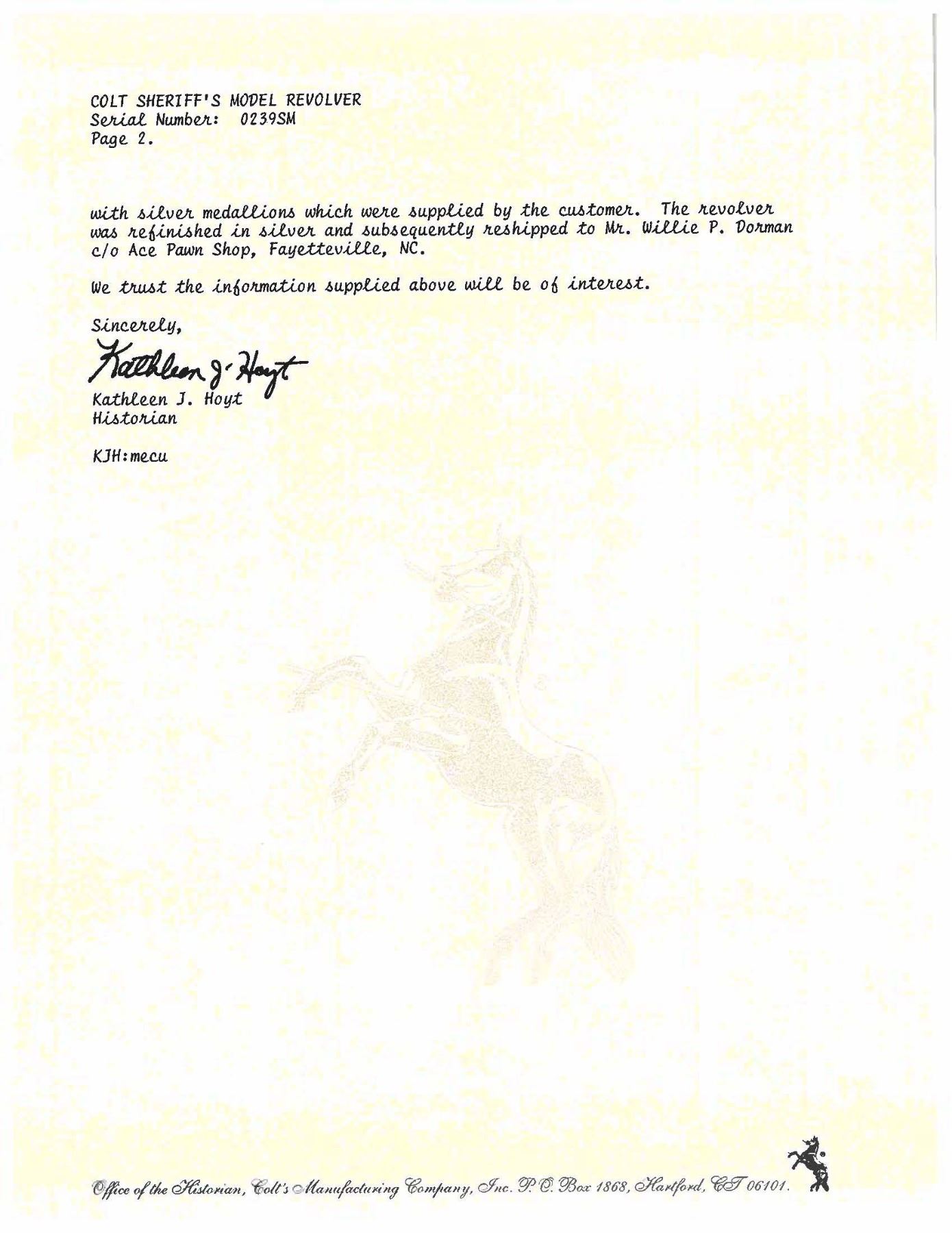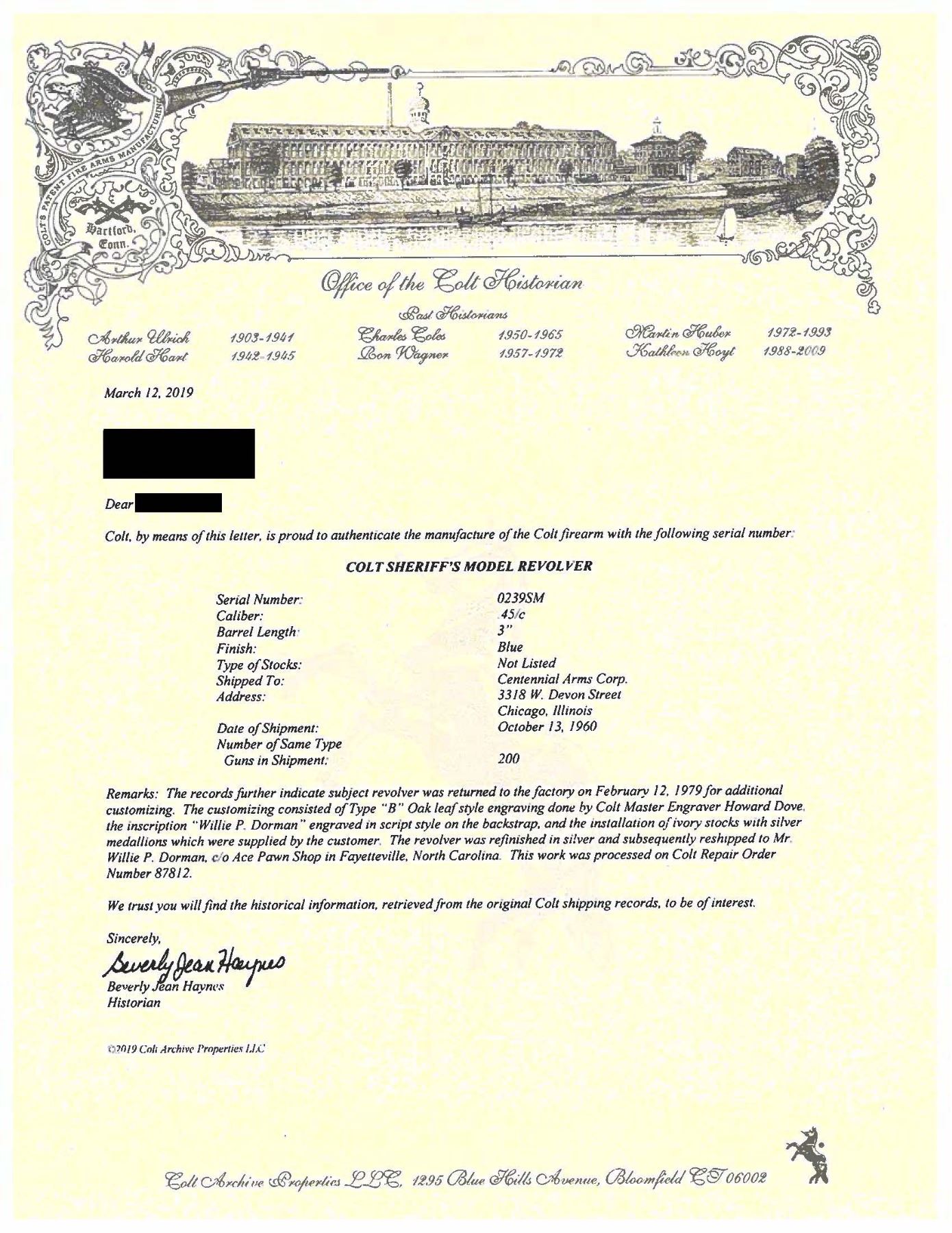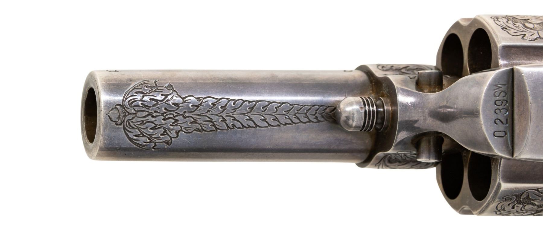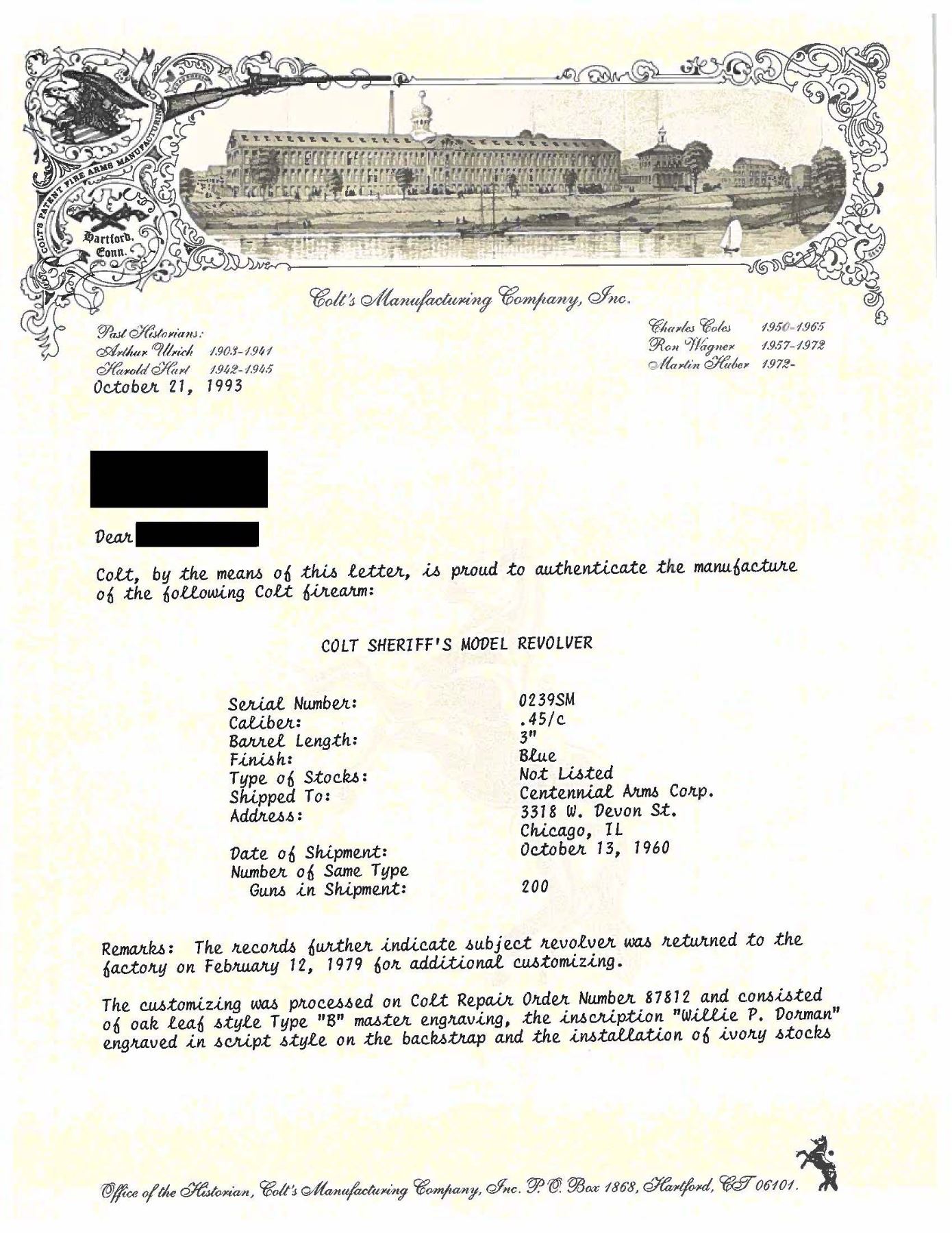 SILVER PLATED & OAK LEAF AND ACORN ENGRAVED COLT SECOND GENERATION SHERIFF'S MODEL SAA REVOLVER. Cal. 45 Colt. S# 0239SM. Bbl. 3" ejectorless with blade front sight. When one thinks of factory engraved SAA revolvers, typical engraving patterns would be Germanic of Foliate scrollwork over a punch dot background. Originally mfg. 1960, subject revolver was sent back to the factory Feb. 12, 1979 for additional customizing. As noted in the factory letter, revolver features one-of-a-kind "B" coverage oak leaf & acorn relief engraving. Backstrap has inscription "Willie P. Dorman". Lower left of grip frame under grip marked "H. DOVE ENGR 1979". Consignor states that this was the only revolver Dove engraved in this style as it was a pattern he usually reserved for longarms. Revolver is finished in full silver plating. Howard Dove (1942-1994) is widely considered as one of the greatest contemporary engravers of all time. He was one of only 2 individuals to ever be employed by the Colt Custom Shop & Winchester Custom Shop at the same time and was known as The Official Engraver of the Colt Collector's Association as he engraved a total of 6 "show guns". Following his untimely passing, the Colt Collector's Association dedicated an annual award at their yearly convention for "Best Engraved Colt"; The Howard Dove Award. Revolver is stocked with 2 piece ivory grips emblazoned with silver Rampant Colt medallions, grips are numbered to gun. This gun was featured in an article in "GUNS" magazine (April 1987) by Robert Omeara. UNATTACHED ACCESSORIES: Colt factory letter stating the following: "Serial Number: 0239SM / Caliber: .45/c / Barrel Length: 3" / Finish: Blue / Type of Stocks: Not Listed / Shipped To: Centennial Arms Corp. / Address: 3318 W. Devon St. Chicago, IL / Date of Shipment: October 13, 1960 / Number of Same Type Guns in Shipment: 200 / Remarks: the records further indicate Subject revolver was returned to the factory February 12, 1979 for additional customizing. The customizing was processed on Colt Repair Order Number 87812 and consisted of oak leaf style Type "B" master engraving, the inscription "Willie P Dorman" engraved in script style on the backstrap and the installation of ivory stocks with silver medallions which were supplied by the customer. The revolver was refinished in silver and subsequently reshipped to Mr. Willie P. Dorman c/o Ace Pawn Shop, Fayetteville, NC". Revolver is housed in a glass top walnut presentation case containing replica Sheriff's badge and Colt Custom Shop medallion. CONDITION: there are a couple scratches on top of hammer and faint cyl. drag line otherwise, metal is near excellent. Silver plating acquiring a pleasing dark tarnish with age. Grips are very good with a few scattered stable hairlines from age shrinkage. Near excellent bore. This is a unique opportunity to own a one-of-a-kind masterpiece engraved by one of the most highly regarded and respected contemporary engravers of all time.PROVENANCE: From the Buckstix Collection. (25-6323/BH). CURIO. $15,000-22,500.