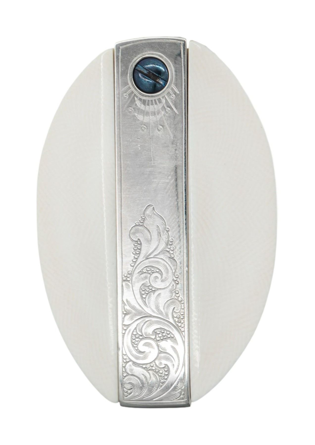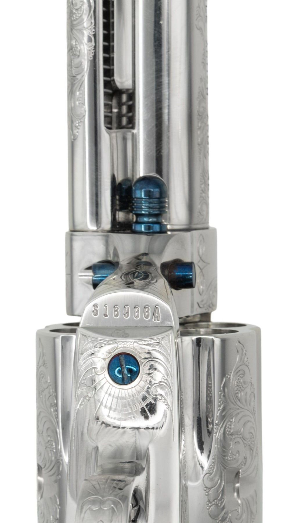 REVOLVER. Cal. 45 Colt. S# S16966A. Bbl. 4 3/4" with blade front sight. Full nickel finish with attractive nitre blue accents consisting of frame & grip frame screws, cyl. rod, cyl. rod retaining pin & ejector head. 6 Shot fluted cyl. Revolver features factory class "C" floral scroll engraving over punch dot background with star burst notes on either side of front sight, bottom front of grip frame & butt. 1 Piece smooth white grip with Rampant Colt medallions. UNATTACHED ACCESSORIES: non matching 2 piece walnut grips with Rampant Colt medallions. 2 Piece Colt box with foam inserts, original paperwork & hang tag. CONDITION: all aspects near excellent, appears new. (25-1510/BH). CURIO. $4,000-6,000.