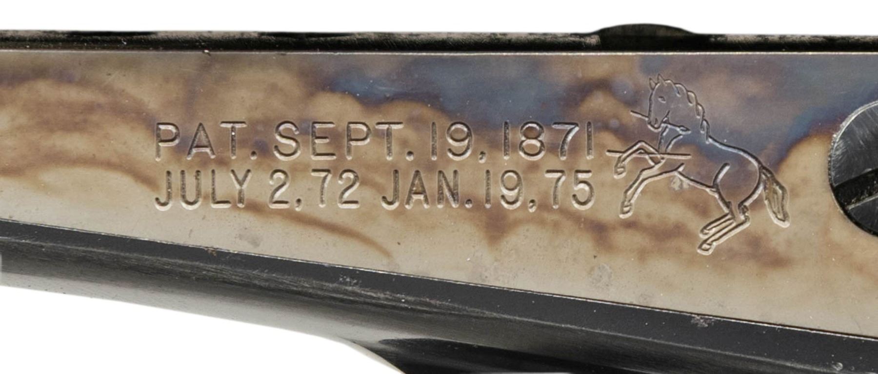 ARMY REVOLVER WITH BOX. Cal. 45 Colt. S# 6102SA. Bbl. 5 1/2". Second Generation Single Action Army revolver mfg. by Colt in 1956 (first year of second generation production). Left side of the bbl. is marked "COLT SINGLE ACTION ARMY .45", with Colt's single line address marked across the top. Left side of the frame is marked with Colt's 2-line patent information, followed by the Rampant Colt logo. Frame and loading gate exhibit a case colored finish, with remaining metal components exhibiting a blue finish overall. Sides of hammer are polished in-the-white. Frame is mounted with 2-piece Colt checkered black synthetic grips. Standard SAA pattern blade front sight and frame notched rear sight. All serialized parts are matching and include the frame, as well as the trigger guard and rear grip strap (beneath left grip panel). Grips are matching via "3102", which is inscribed on the interior of the panels. Matching assembly # "138" is present on the frame, loading gate, and cyl. UNATTACHED ACCESSORIES: Colt wood grain factory box with mostly illegible end label. CONDITION: frame and loading gate retain the majority of their original case colored finish, showing light edge wear, with some spots/areas of light to mild fading, and a few scattered spots of light surface oxidation. Blued parts retain the majority of their original finish, showing some areas of mild wear and thinning that have faded to a gray patina, as well as some superficial handling marks overall. Mirror bore, exhibiting scattered spots of hardened grease, while retaining well defined rifling throughout. Proper manual mechanics, with tight lock up. Grips show some light checkering wear and some light superficial handling marks, but otherwise remain sound. Box is in poor condition, exhibiting numerous tears and taped repairs, with both end flaps having torn off, but remaining present. PROVENANCE: The Esteemed Norm Greenberg Collection. (25-4139/MLW). CURIO. $2,500-3,750.