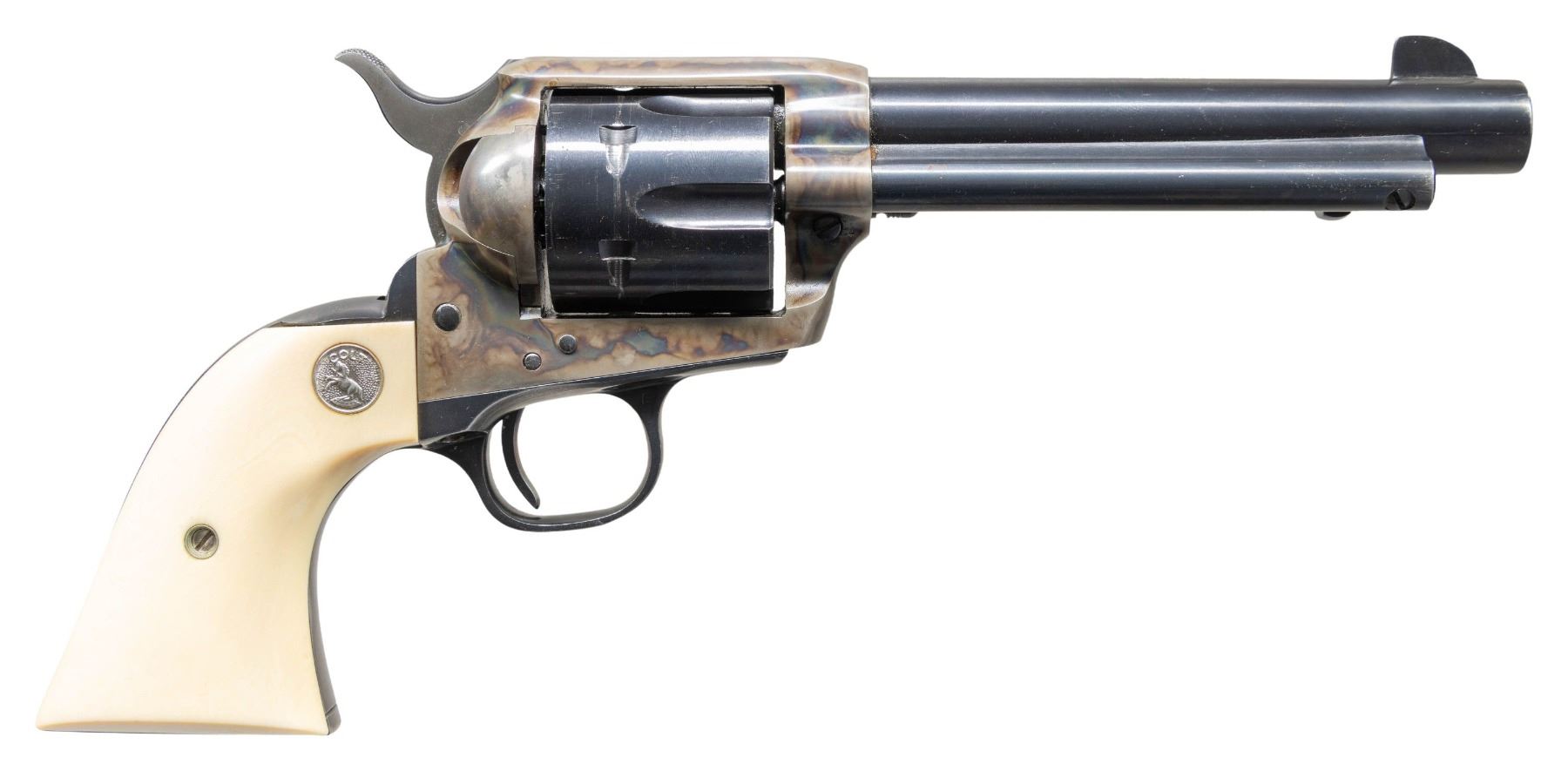 REVOLVER. Cal. 45 Colt. S# 58430SA. Bbl. 5 1/2". Second Generation Single Action Army revolver mfg. by Colt in 1970. Left side of the bbl. is marked "COLT SINGLE ACTION ARMY .45", with Colt's single line address marked across the top. Left side of the frame is marked with Colt's 2-line patent information, followed by the Rampant Colt logo. Frame and loading gate exhibit a case colored finish, with remaining metal components exhibiting a blue finish. Sides of hammer are polished in-the-white. Frame is mounted with 2-piece Colt silver medallion plain natural white grips. Standard SAA pattern blade front sight and frame notched rear sight. Nearly all serialized parts are matching and include the frame, cyl., and grip straps (left side, beneath grip panel). Grips do not match, but match each other via a handwritten "68835" in black ink on the interior of the panels. Matching assembly # "160" is present on the frame and loading gate. CONDITION: frame retains the majority of its original case colored finish, showing some spots of light to mild fading. Loading gate has retains fair case coloring, exhibiting fading and light surface level pitting. Blued parts retain the majority of their original finish, showing scattered spots of mild wear, with some scattered scratches and superficial handling marks. Near mirror bore, exhibiting what appears to be some very light pitting, while retaining well defined rifling throughout. Proper manual mechanics. Grips show light superficial marks and scratches, but otherwise remain sound. (25-4646/MLW). CURIO. $1,800-2,700.