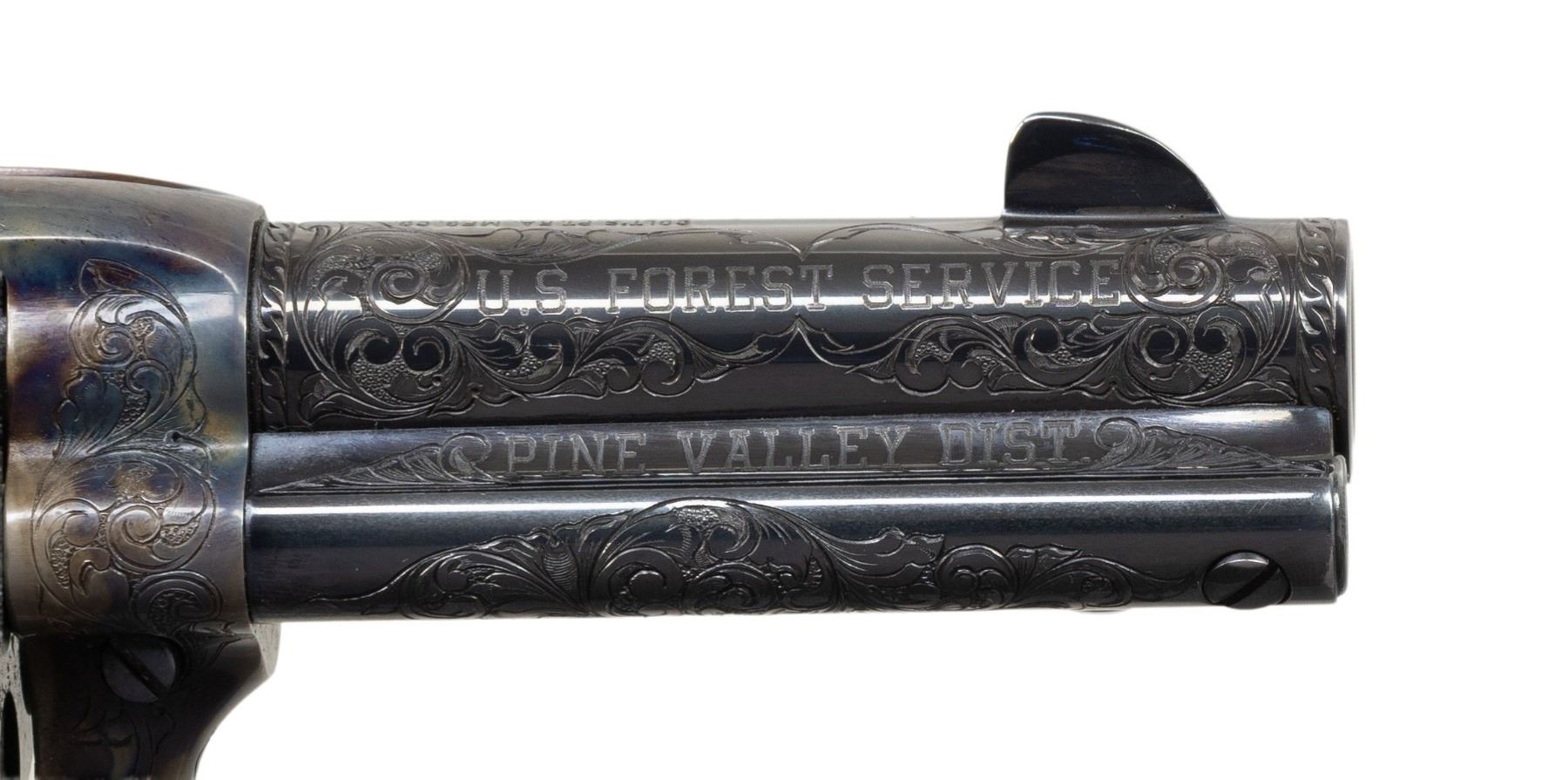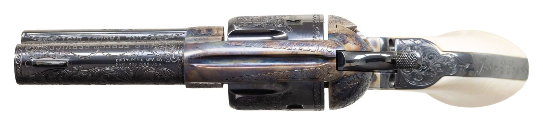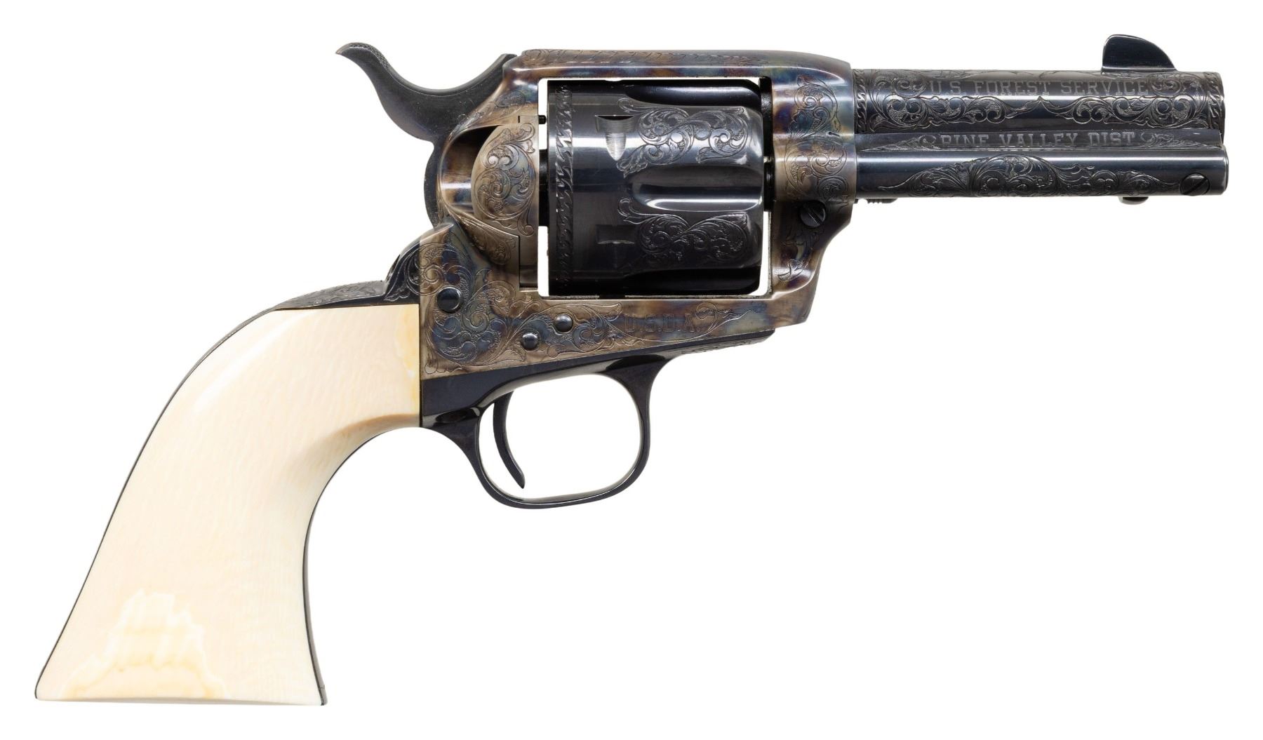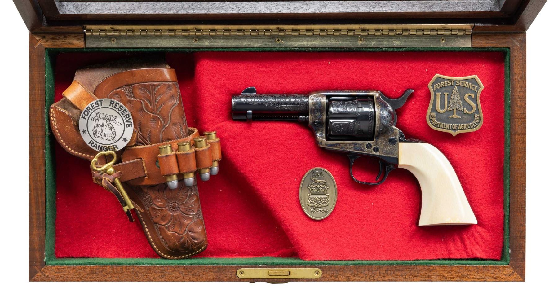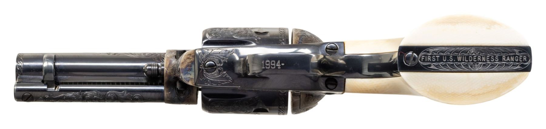PRESENTATION 3RD GEN 3 1/2" SAA REVOLVER TO U.S. WILDERNESS RANGER JOHN D. DAY. Cal 38 WCF. S# S05394A. Bbl. special order 3 1/2" with ejector and blade front sight. John D. Day was the first U.S. Wilderness Ranger from 1994-1999 in Pine Valley, UT. This revolver was presented to him by John Maxwell in 1995 and carried by him during his duty as a Wilderness Ranger. Revolver is pictured in an included copy of "Wilderness Ranger" by John Denton Day on pages 193 & 195. Revolver features Class "C" standard American scroll engraving by Colt Master Engraver Jan Gwinnell. Custom inscriptions include "U.S.D.A." on right side of frame, "1994-" on bottom of trigger guard, "FIRST U.S. WILDERNESS RANGER" on bottom of butt, script "John D. Day" on backstrap, "U.S. FOREST SERVICE" on right side of bbl. & "PINE VALLEY DIST." on top of ejector housing. Case hardened frame with balance of parts blued. Hammer sides polished bright. Revolver is stocked with 1 piece certifiable antique Colt ivory grip. UNATTACHED ACCESSORIES: copy of "Wilderness Ranger" by John Day which is a copy of Day's Journal entries during his time as a Wilderness Ranger with entries from April, 1994 to October, 1999. Colt factory letter stating the following: "Serial Number: S05394A / Caliber .38/40 / Barrel Length: 3 1/2" / Finish: Blue/color case / Type of Stocks: One piece configuration smooth ivory / Special Features: Special caliber marking ".38 WCF" on the left side of the barrel / Factory Engraved: Yes, see remarks section for details. / Shipped To: Southern Ohio Gun Dist. / Address: 240 Harmon Avenue Lebanon, Ohio / Date of Shipment: June 20, 1995 / Colt Custom Shop Order: 4938 / Number of Same Type Guns in Shipment: 1" Remarks section confirms the above listed inscriptions as factory original followed by "It is also of interest to not the subject revolver was made especially for Mr. John D. Day". A copy of "Cowboys, Indians, Outlaws and Ghost Towns of Southern Utah by John Day. "The Return of Butch Cassidy by John Day. Hinged red and green velvet lined walnut glass topped display case with Colt Custom Shop medallion & U.S. Forest Service belt buckle. Tooled leather Hunter holster, John Day's name scratched on back. Forest Reserve Ranger badge formerly belonging to Day. Original Colt Custom Shop Factoy box & shipping sleeve. CONDITION: Revolver overall near excellent with 1 small spot of wear at left side of muzzle. PROVENANCE: From the Buckstix Collection. (25-6315/BH). CURIO. $6,000-9,000.
