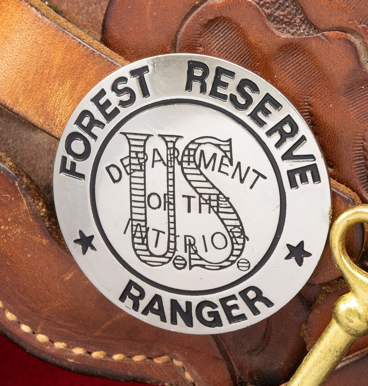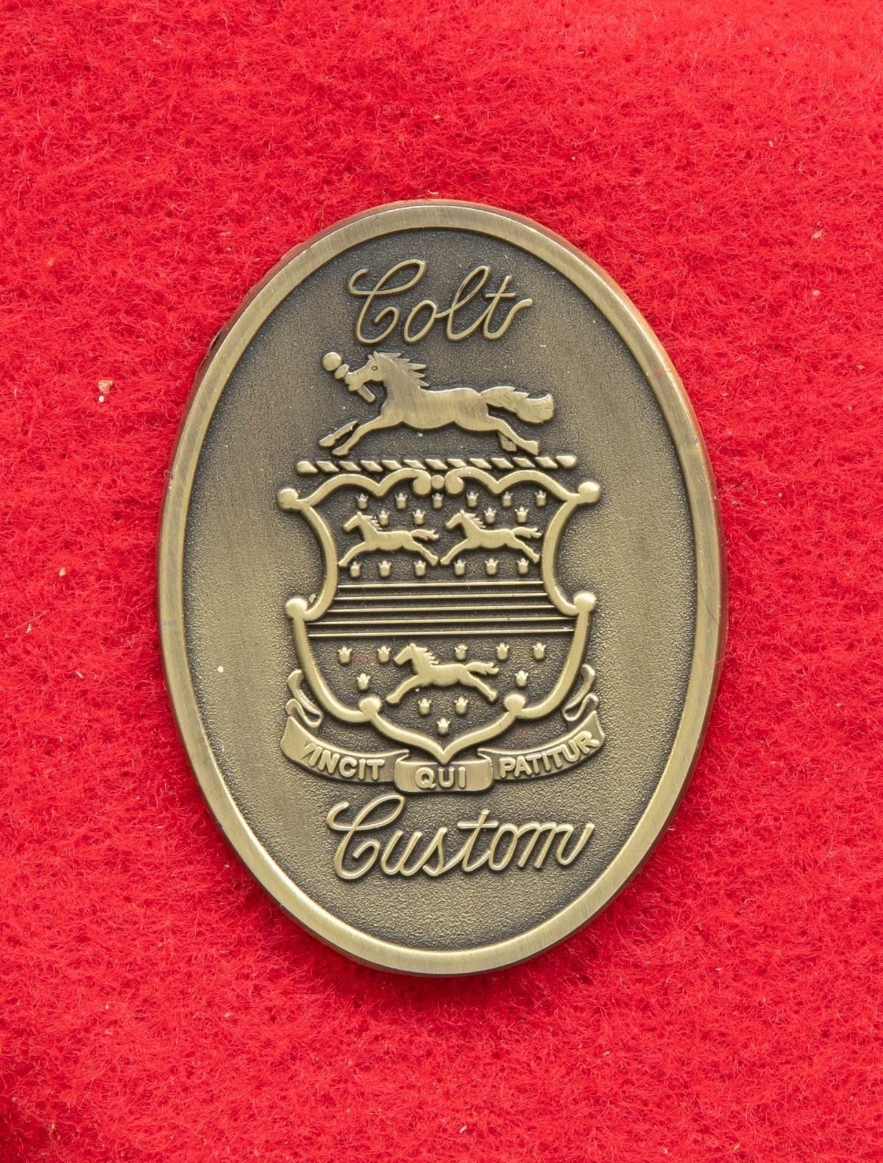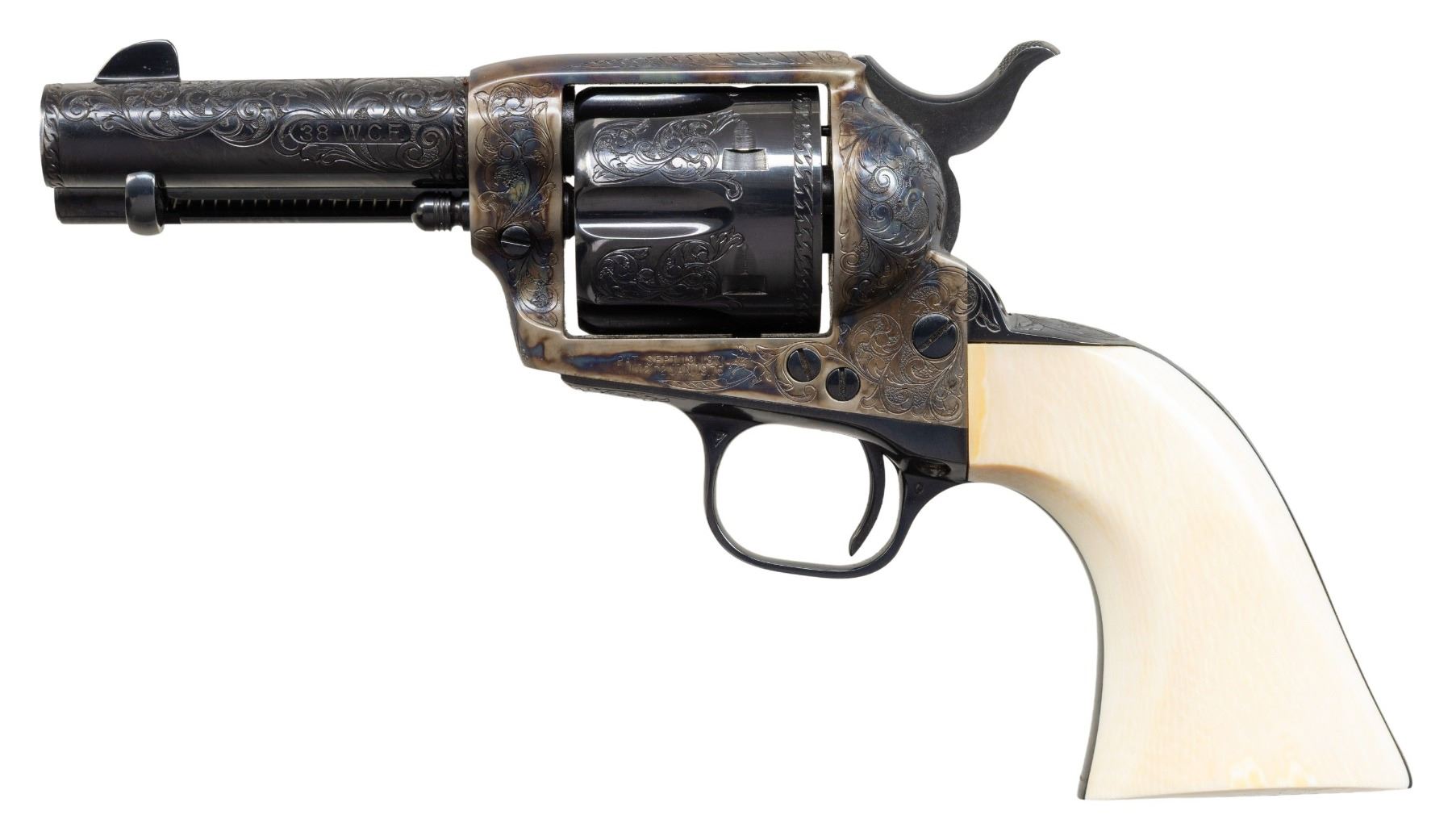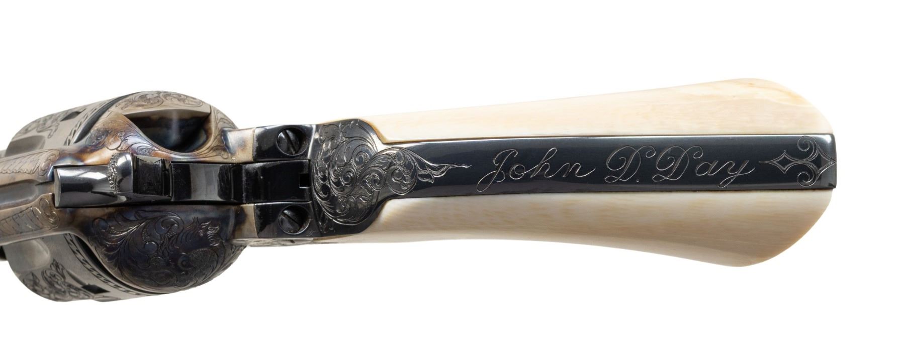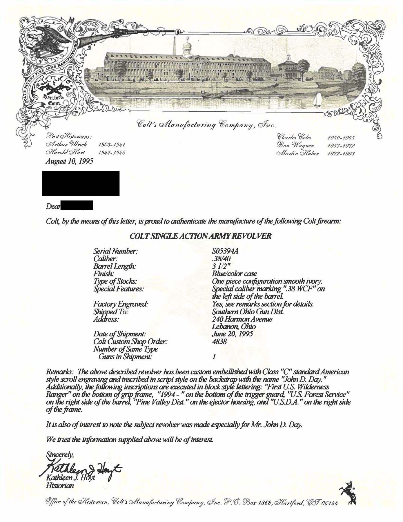 PRESENTATION 3RD GEN 3 1/2" SAA REVOLVER TO U.S. WILDERNESS RANGER JOHN D. DAY. Cal 38 WCF. S# S05394A. Bbl. special order 3 1/2" with ejector and blade front sight. John D. Day was the first U.S. Wilderness Ranger from 1994-1999 in Pine Valley, UT. This revolver was presented to him by John Maxwell in 1995 and carried by him during his duty as a Wilderness Ranger. Revolver is pictured in an included copy of "Wilderness Ranger" by John Denton Day on pages 193 & 195. Revolver features Class "C" standard American scroll engraving by Colt Master Engraver Jan Gwinnell. Custom inscriptions include "U.S.D.A." on right side of frame, "1994-" on bottom of trigger guard, "FIRST U.S. WILDERNESS RANGER" on bottom of butt, script "John D. Day" on backstrap, "U.S. FOREST SERVICE" on right side of bbl. & "PINE VALLEY DIST." on top of ejector housing. Case hardened frame with balance of parts blued. Hammer sides polished bright. Revolver is stocked with 1 piece certifiable antique Colt ivory grip. UNATTACHED ACCESSORIES: copy of "Wilderness Ranger" by John Day which is a copy of Day's Journal entries during his time as a Wilderness Ranger with entries from April, 1994 to October, 1999. Colt factory letter stating the following: "Serial Number: S05394A / Caliber .38/40 / Barrel Length: 3 1/2" / Finish: Blue/color case / Type of Stocks: One piece configuration smooth ivory / Special Features: Special caliber marking ".38 WCF" on the left side of the barrel / Factory Engraved: Yes, see remarks section for details. / Shipped To: Southern Ohio Gun Dist. / Address: 240 Harmon Avenue Lebanon, Ohio / Date of Shipment: June 20, 1995 / Colt Custom Shop Order: 4938 / Number of Same Type Guns in Shipment: 1" Remarks section confirms the above listed inscriptions as factory original followed by "It is also of interest to not the subject revolver was made especially for Mr. John D. Day". A copy of "Cowboys, Indians, Outlaws and Ghost Towns of Southern Utah by John Day. "The Return of Butch Cassidy by John Day. Hinged red and green velvet lined walnut glass topped display case with Colt Custom Shop medallion & U.S. Forest Service belt buckle. Tooled leather Hunter holster, John Day's name scratched on back. Forest Reserve Ranger badge formerly belonging to Day. Original Colt Custom Shop Factoy box & shipping sleeve. CONDITION: Revolver overall near excellent with 1 small spot of wear at left side of muzzle. PROVENANCE: From the Buckstix Collection. (25-6315/BH). CURIO. $6,000-9,000.