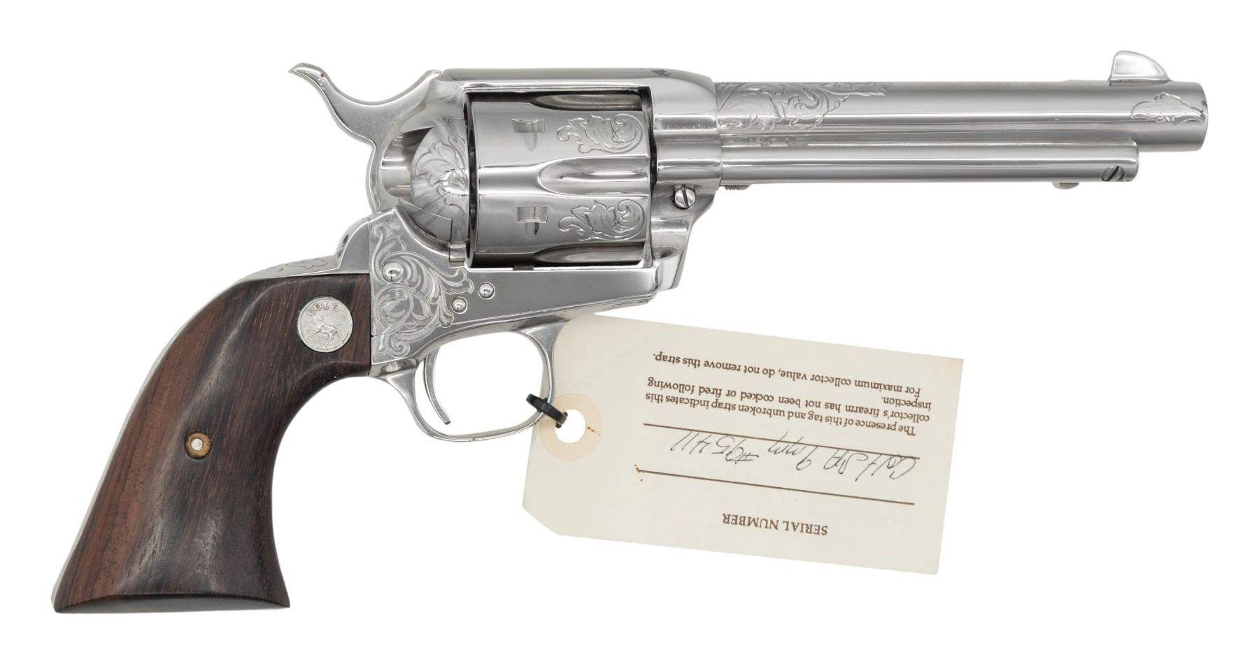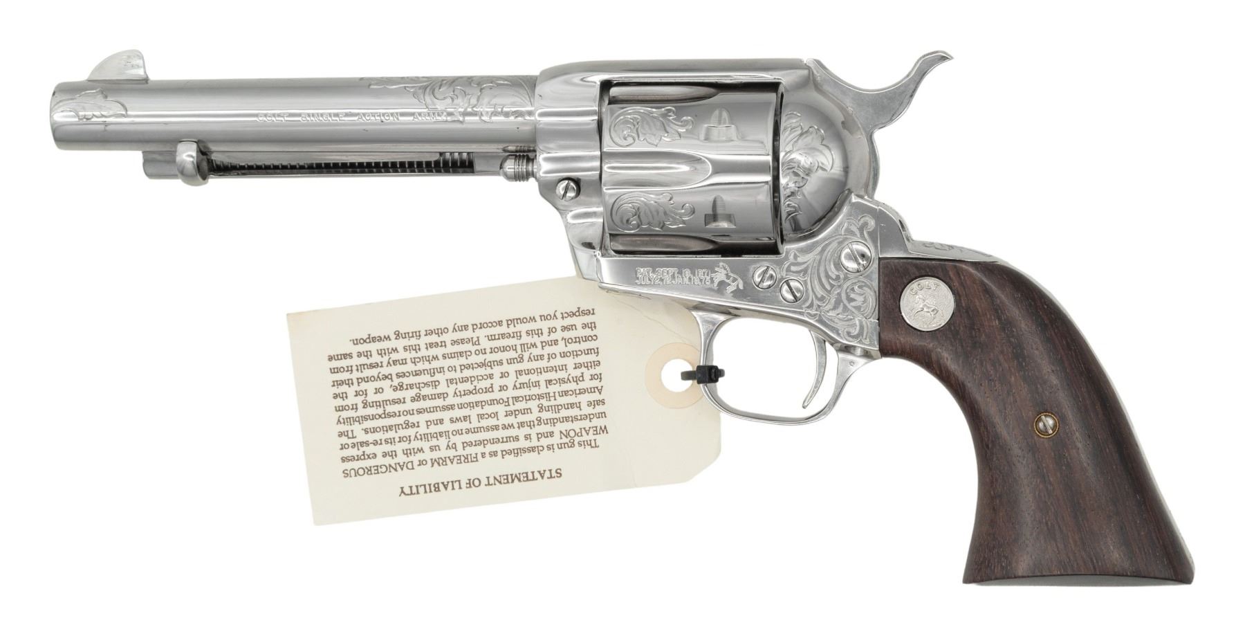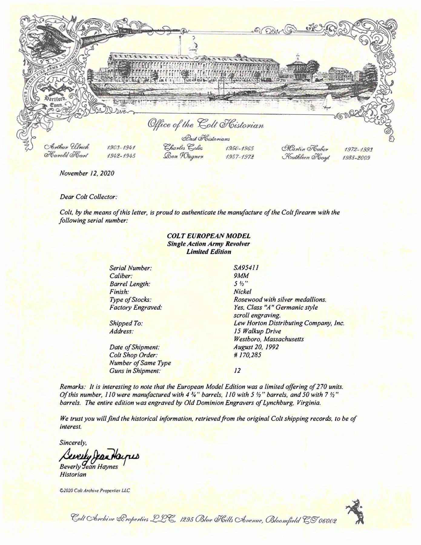 "EUROPEAN MODEL" SAA REVOLVER WITH ORIGINAL BOX & LETTER. Cal 9mm Luger. S# SA95411. Bbl. 5 1/2" with blade front sight. Mfg. 1992 & shipped to Lew Horton Distributing Company. this revolver is part of a limited run of 270 units in all. Of total production only 110 were mfg. with 5 1/2" bbls. Engraving for entire production run by Old Dominion Engravers of Lynchburg, VA. Revolver features a full nickel finish with Class "A" Germanic scroll engraving. Stocks are matching numbered 2 piece smooth rosewood grips with silver Rampant Colt medallions. Matching numbers on left side of grip frame, trigger guard frame, loading gate & front of cyl. Rear of cyl. stamped "9MM". UNATTACHED ACCESSORIES: original 2 piece blue factory box with styrofoam insert and white shipping sleeve. Original paperwork. Original hang tag affixed indicating revolver "has not been cocked or fired following inspection". Colt factory letter stating the following: "COLT EUROPEAN MODEL / Single Action Army Revolver / Limited Edition / Serial Number: SA95411 / Caliber: 9MM / Barrel Length: 5 1/2" / Finish: Nickel / Type of Stocks: Rosewood with silver medallions / Factory Engraved: Yes, Class "A" Germanic style scroll engraving. / Shipped To: Lew Horton Distributing Company, Inc. / Address: 15 Walkup Drive Westboro, Massachusetts / Date of Shipment: August 20, 1992 / Colt Shop Order: #170,285 / Number of Same Type Guns in Shipment: 12". CONDITION: metal retains 98% original nickel, 1 tiny spot of flaked finish at end of ejector housing, all other aspects near excellent. PROVENANCE: From the Buckstix Collection. (25-6320/BH). CURIO. $2,500-3,500.