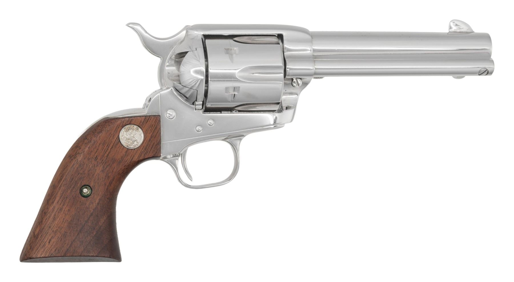 ARMY REVOLVER. Cal. 38-40. S# S06022A. Bbl. 4 3/4". Third Generation Single Action Army revolver mfg. by Colt in 1993. Left side of the bbl. is marked "COLT SINGLE ACTION ARMY 38-40", with Colt's single line address marked across the top. Left side of the frame is marked with Colt's 2-line patent information, followed by the Rampant Colt logo. Metal components exhibit a bright nickel plated finish overall. Frame is mounted with 2-piece Colt silver medallion plain wood grips. Standard SAA pattern blade front sight and frame notched rear sight. Frame and rear grip strap are matching via the full S#. Cyl. is matching via "6022". Trigger guard and loading gate are matching via "022". Grips are matching via "6022" which is handwritten in red marker on the interior of the panels. CONDITION: metal components retain virtually all of their original factory nickel plated finish, showing some scattered light scratches and superficial handling marks. Cyl. bears a mild dragline. Mirror bore, retaining well defined rifling throughout. Proper manual mechanics with tight lock up. Grips show a few scattered handling marks and minor impressions, but otherwise remain very good overall. (25-5412/MLW). MODERN. $1,500-2,250.