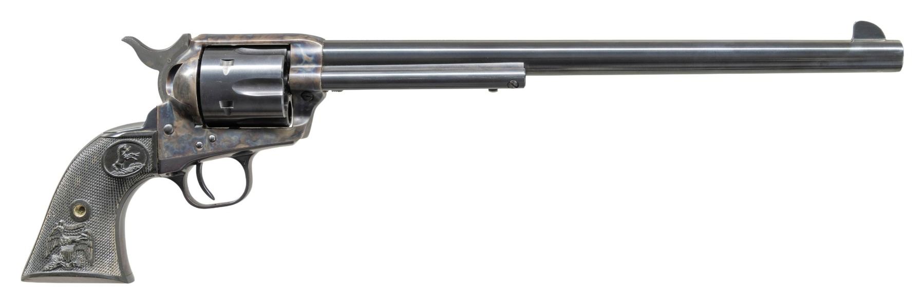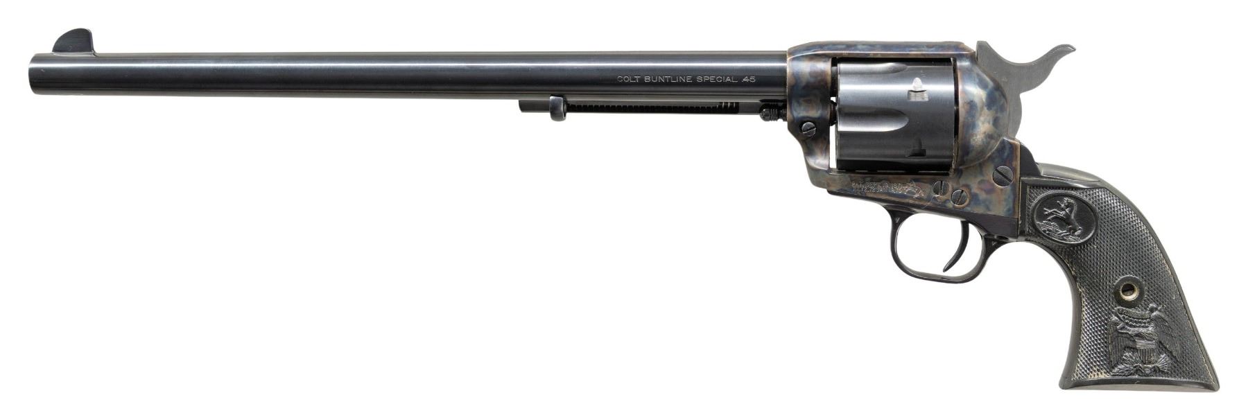 BUNTLINE SPECIAL REVOLVER WITH MATCHING FACTORY BOX. Cal. 45 LC. S# SA54436. Bbl. 12". Third Generation Single Action Army Buntline Special revolver mfg. by Colt. Left side of the bbl. is marked "COLT BUNTLINE SPECIAL .45", with Colt's single line address marked across the top. Left side of the frame is marked with Colt's 2-line patent information, followed by the Rampant Colt logo. Frame and loading gate exhibit a case colored finish, with remaining metal components exhibiting a blue finish overall. Sides of hammer are polished in-the-white. Frame is mounted with 2-piece Colt checkered black synthetic grips. Standard SAA pattern blade front sight with frame notched rear sight. All serialized parts are matching and include the frame, cyl., as well as the trigger guard and rear grip strap (marked beneath left grip panel). Grips are matching via a hand inscribed "54436" on the interior of the panels. UNATTACHED ACCESSORIES: matching factory box, containing factory paperwork. CONDITION: near new, with metal components retaining virtually all of their original factory finishes overall. Frame and loading gate retain vibrant case colors, with some striations from prior cleaning present on the loading gate. Cyl. exhibits a few superficial marks, but no dragline. Mirror bore, retaining well defined rifling throughout. Proper manual mechanics (with cyl. not inserted to preserve condition). Grips are excellent overall. Box shows some exterior wear from handling and storage, but otherwise remains sound. PROVENANCE: Estate Collection of John "Jack" Dhooghe. (25-5512/MLW). MODERN. $1,200-1,800.