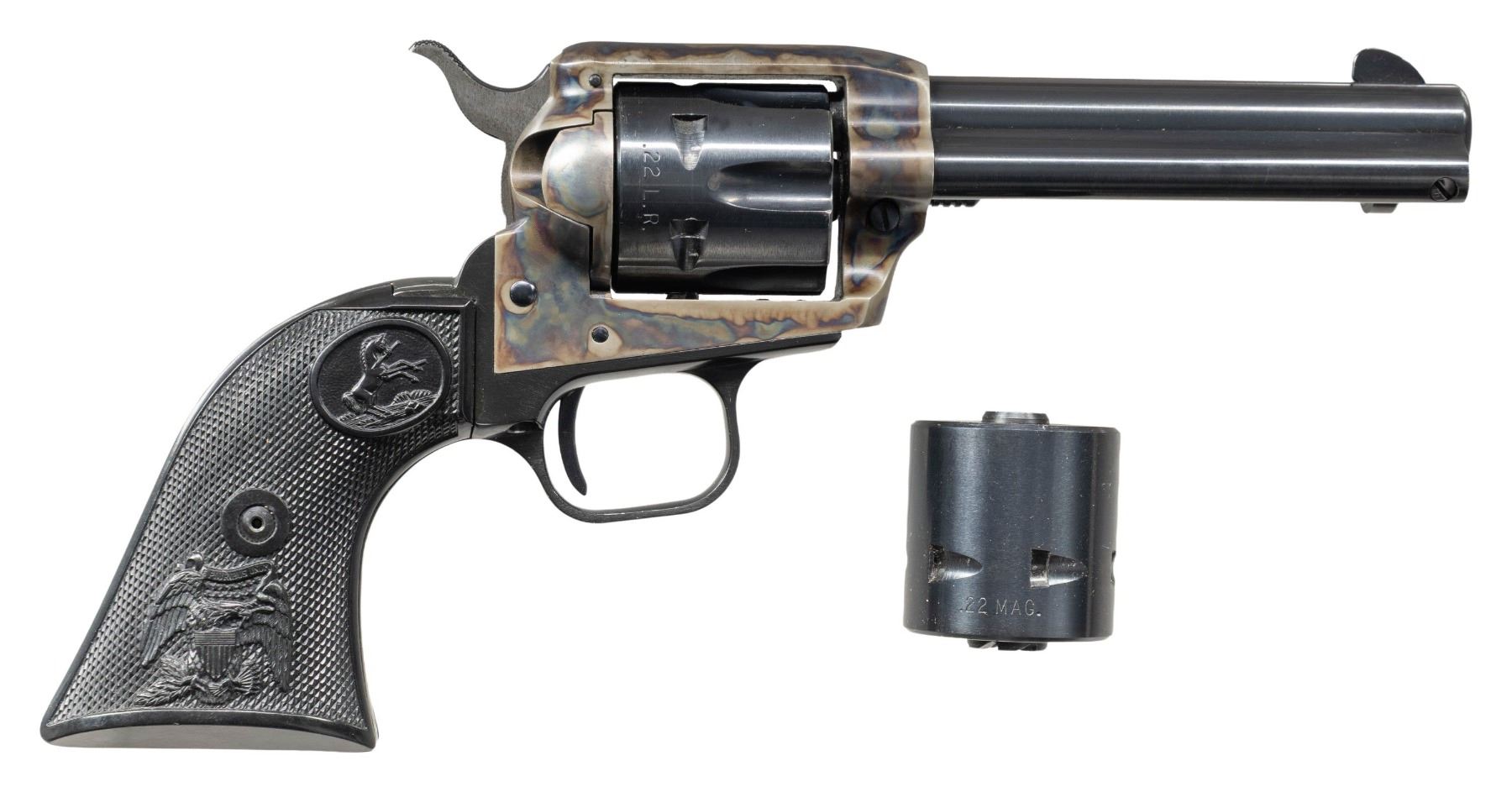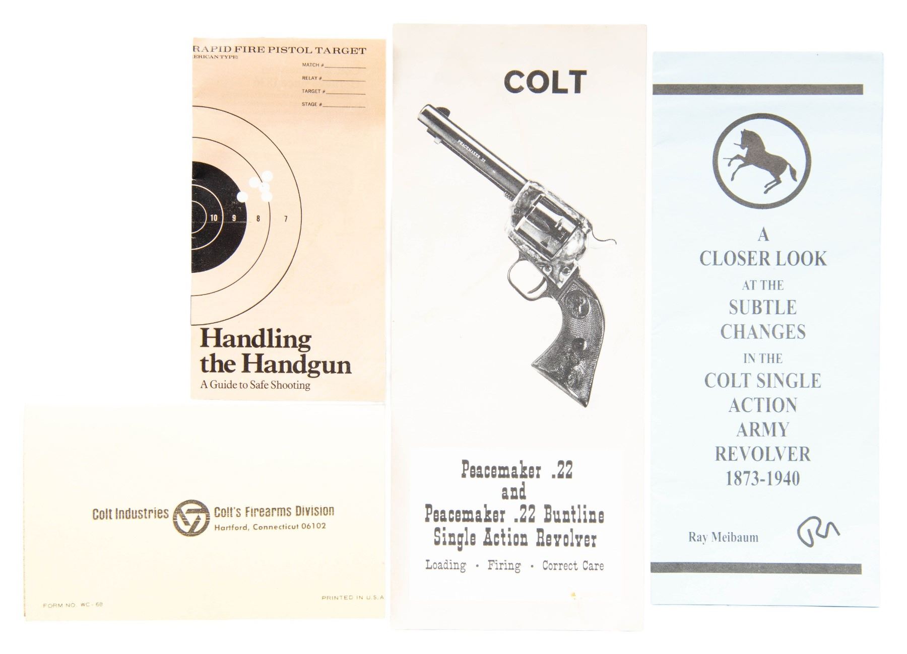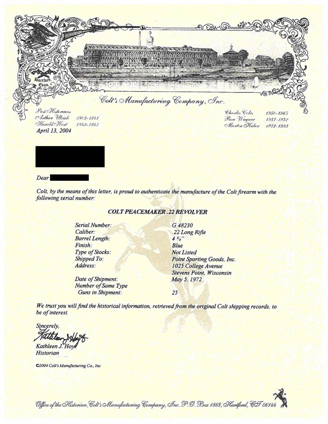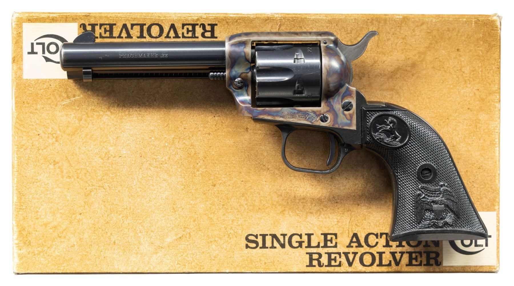 MATCHING BOX & 22 MAG CYL. Cal. 22 LR. S# G48230. Per Colt letter, shipped to Point Sporting Goods Inc. in Stevens Point Wisconsin May 5th, 1972. Bbl. 4.4". Blued & case hardened finish. Two piece black Colt grips. UNATTACHED ACCESSORIES: Colt letter. Colt Peacemaker box with matching S#; contains paperwork & 22 Mag. cyl. in box. Factory box in good condition showing torn corner & fraying around corners. CONDITION: all aspects very good to near excellent with a few marks on cyl. Very good rifling. (25-6341/MD). CURIO. $1,000-1,500.PROVENANCE: From the Buckstix Collection.w/ Colt Archive letter