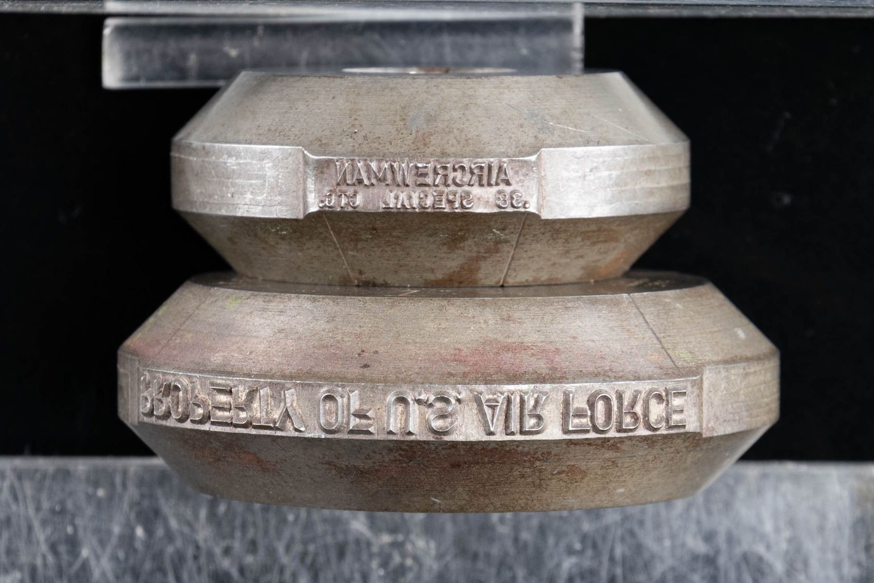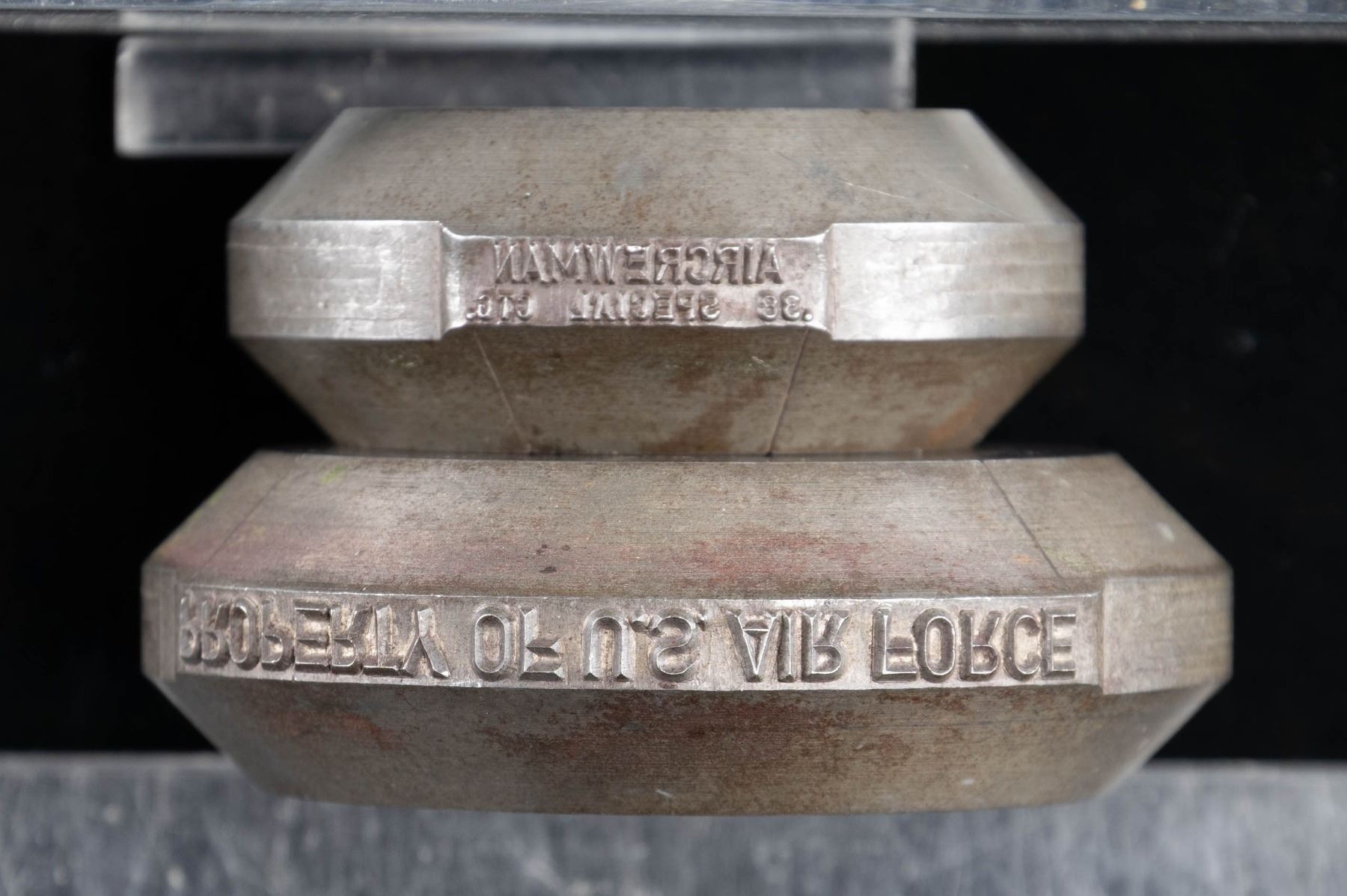 Lot consists of 2 Colt Aircrewman factory rolls dies, including: 1) Aircrewman factory roll die marked "AIRCREWMAN/ .38 SPECIAL CTG." twice along the edge. Top of die is marked "T-15415" and "industrial/ ENGRAVERS INC./ 2855", with "1" and "2" applied at corresponding roll stamp areas. 2) Colt Aircrewman factory roll die marked "PROPERTY OF U.S. AIR FORCE" twice along the edge. Top of die is marked "T-15416" above "industrial/ ENGRAVERS INC./ 2856", with "1" and "2" applied at corresponding roll stamp areas. CONDITION: dies exhibit a dark mellow gray patina, with some scattered spots of age related discoloration. Roll stamp markings and roll die mfg. markings remain clear and sharp. Only approx. 1,189 Aircrewman revolvers were mfg. by Colt between 1951-1952, with the majority being destroyed by the U.S. Air Force due to the risk of an operator firing standard pressure .38 Special ammunition. This is an exceedingly rare opportunity for one to acquire the roll die stamps utilized by Colt for the extremely limited production of the Aircrewman revolver. (02-25097/MLW). NON-GUN. $1,200-2,000.