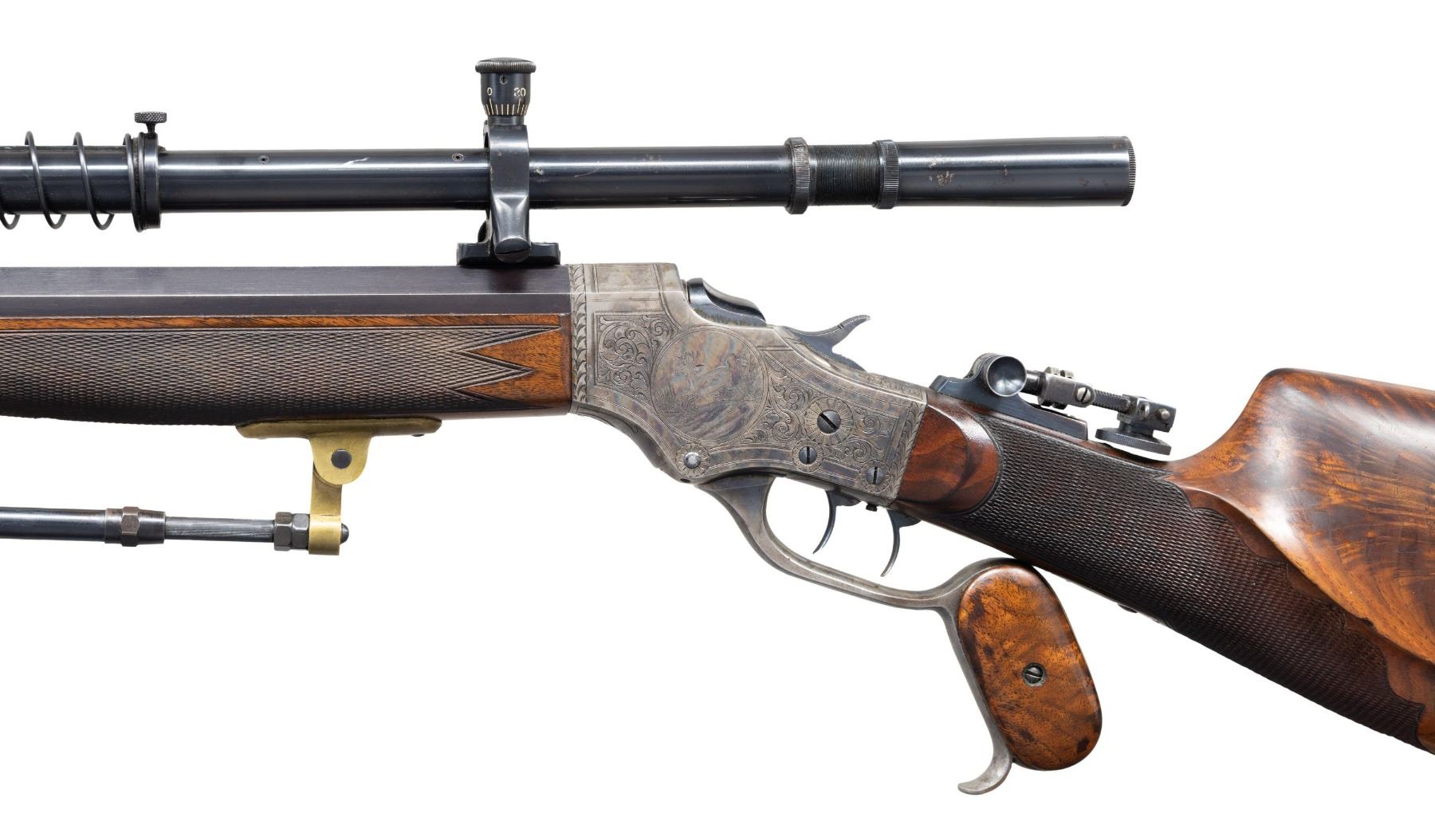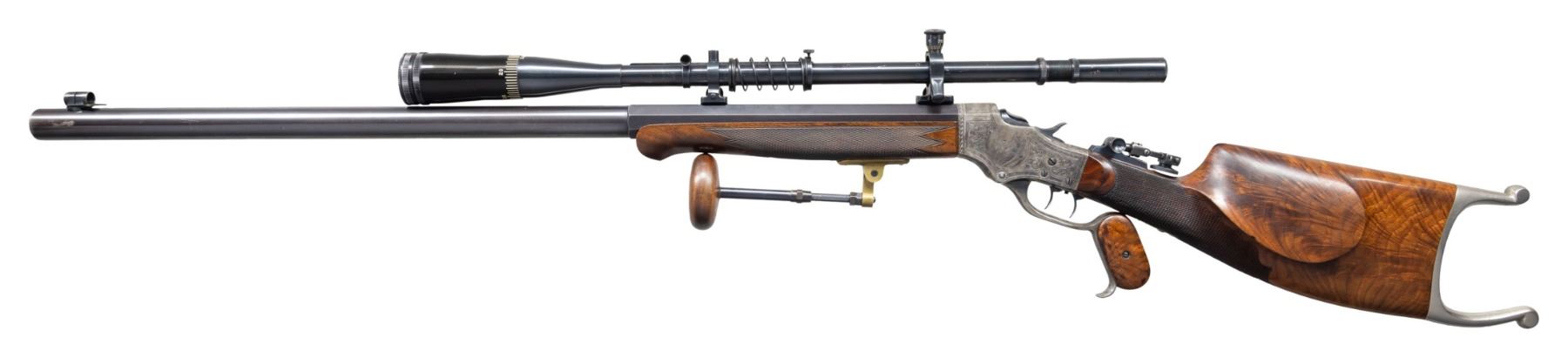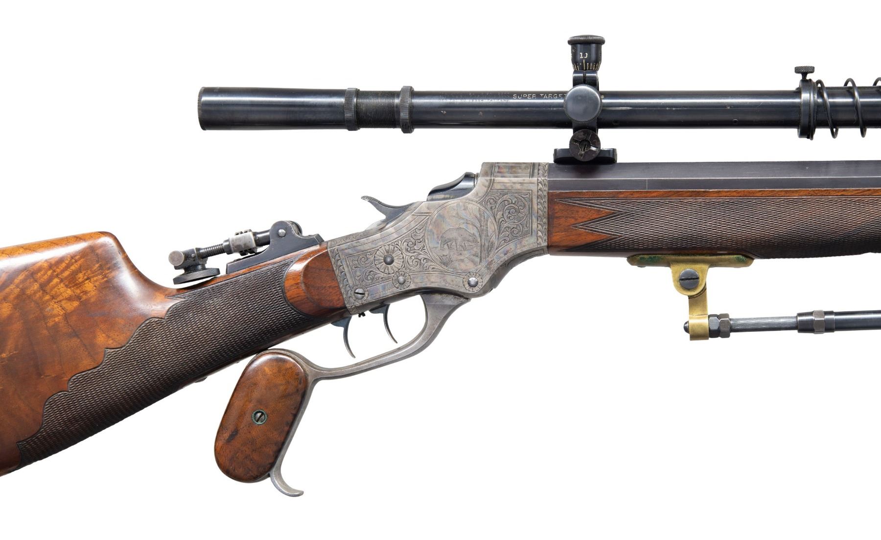 SINGLE SHOT RIFLE. Cal. 32-40 S#. 9473. Bbl. 32" octagon to round measures 1 1/16" at the muzzle and is fitted with a Pope false muzzle and bullet starter. Famed barrel maker Harry Pope sold his rifling machinery to J. Stevens and started work with them in a supervisory role in 1901. The Stevens-Pope barrels were available on order for Stevens, Winchester high wall, Ballard and other target rifles until 1913. The top flat is stamped "STEVENS-POPE" over the standard single line J. Stevens address. The bottom barrel flat is stamped with Pope's barrel number "1864". The front of the frame is model marked "54".This stunning rifle is the highest grade offered by Stevens. It is based on the Model 44 1/2 action. Harry Pope designed this improved falling block action shortly after arriving at Stevens. It has a drop forged receiver designed for smokeless powder pressures. This late production rifle features deep cut style scroll engraving. The right game scene depicts a bear while the left shows a running whitetail buck. Standard features include double set triggers, ripple case colored frame and Pope Special lever with 2 piece wood grips. The perch belly cheekpiece stock and schnable tipped forend are of fine Black Walnut with elaborate hand checkering that is designed around the base of the factory palm rest. The special Schuetzen buttplate is nickel finished. Sights consist of a Stevens No. 210 globe front with extra discs, a Stevens-Pope No.110 tang sight and an added Lyman Super Target Spot scope. Weight with scope is 15 lbs, 3.4 oz. UNATTACHED ACCESORIES: includes a wood shooters box containing: an Ideal No. 6 powder measure, Pope RE and DE capper, Stevens-Pope bullet lubricating pump with dies, bullet mold marked with matching barrel number "1864:, King powder Co. FFFG powder tin, Muller "Valvespout" oil tin, 1 Springfield armory box containing 38 lubricated lead bullets with 1928 date,1 partial box of Remington UMC No. 2 1/2 nickeled primers, 2 sealed boxes of 100 Peters No. 15 primers, 1 partial tin box of UMC No. 2 1/2 primers with red label, 1 tin primer box containing 3 front sight discs, wood cartridge case & bullet blocks, a small box containing a short starter plus other assorted tools and cases. Non related items include a Craftsman "Golden Rule, 50 years of value, 1886-1936" tape measure. A modern foam lined rifle case also holds: the false muzzle with bullet seater, a lubricating pump, loading rod, sight inserts, 2 firing pins, along with a modern cleaning rod & supplies. CONDITION: this exceptional rifle retains over 70% lightly faded barrel blue showing areas of thinning with dark spotting. The receiver has over 70% lightly faded case colors with crisp engraving. The stocks have lightly worn finish and checkering showing spots of wear with handling marks and a dent along the lower edge of the cheekpiece. The forend barrel channel shows gouge marks from relieving. Sound triggers and action. The barrel retains lightly worn Pope rifling showing a slight darkness in the grooves. PROVENANCE: From the Buckstix Collection. (25-6369/DS). CURIO. $10,000-20,000.