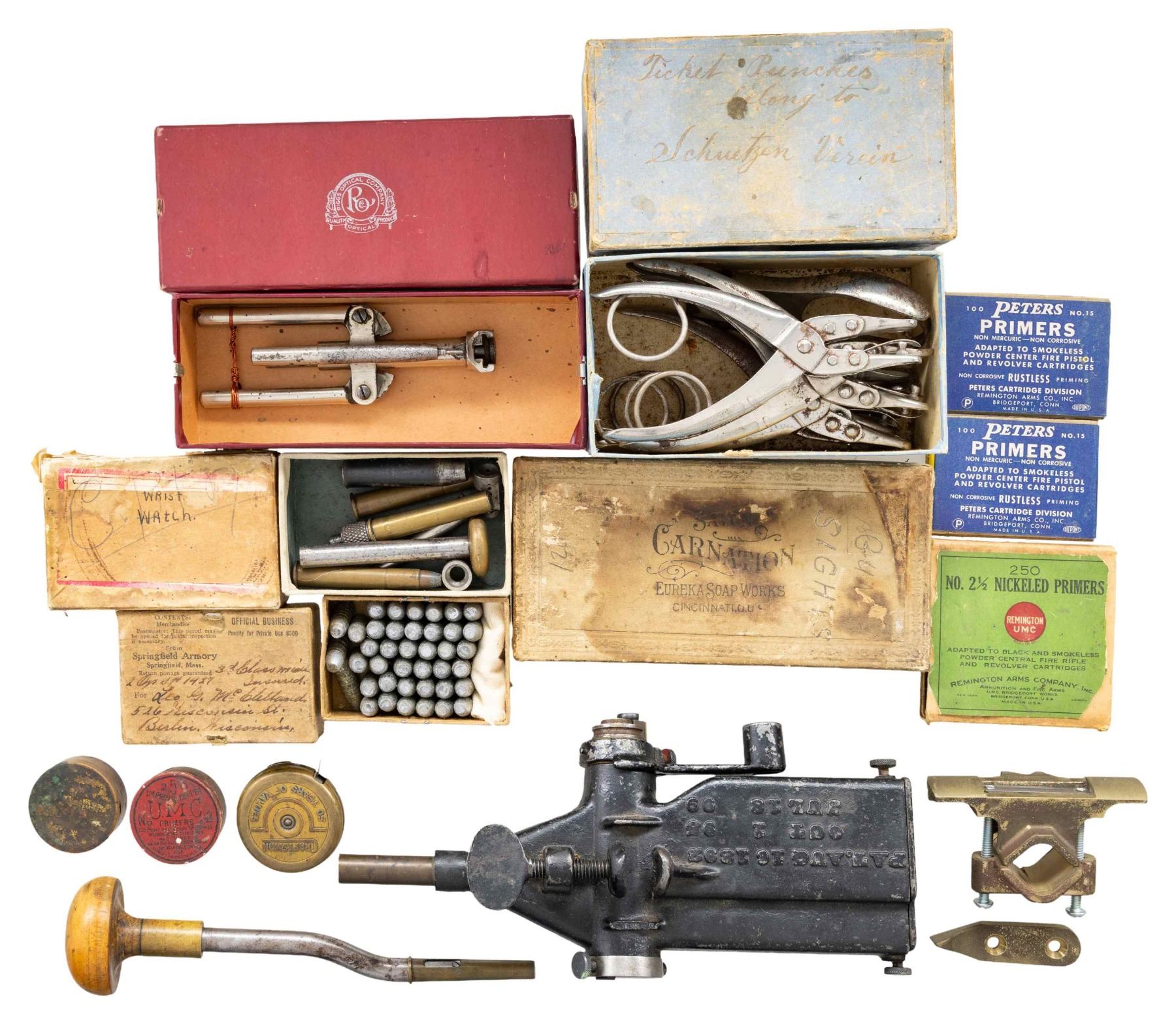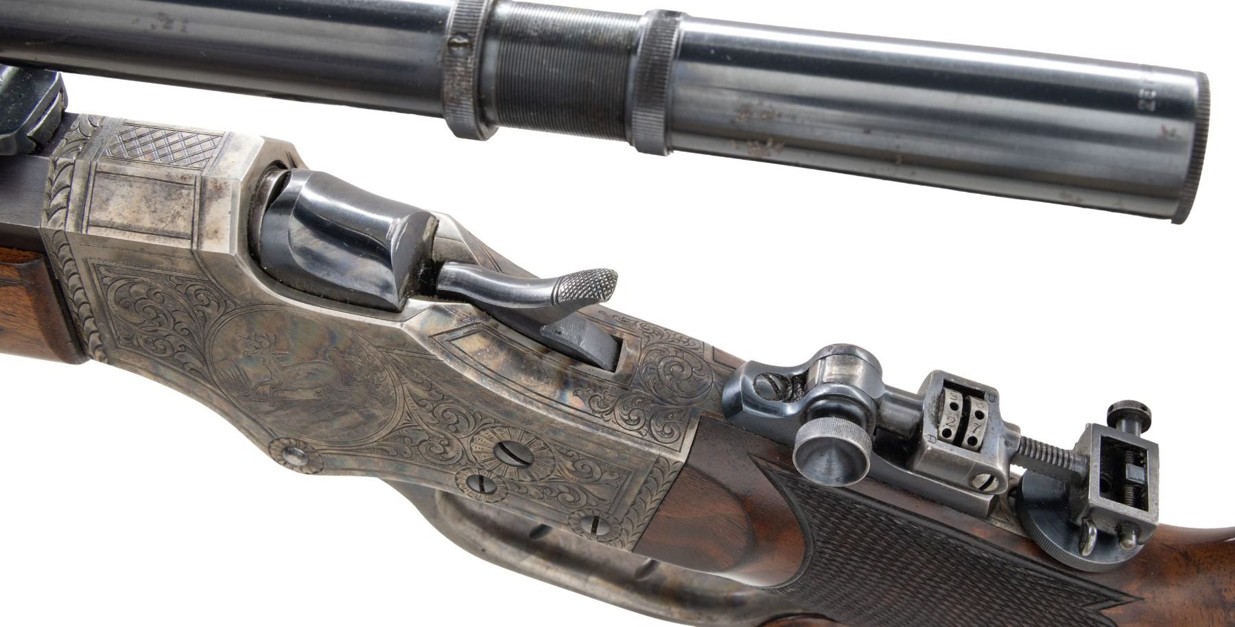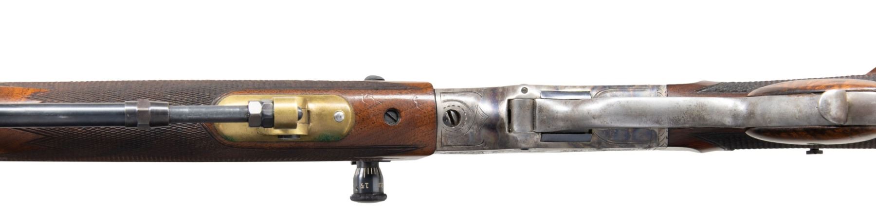 SINGLE SHOT RIFLE. Cal. 32-40 S#. 9473. Bbl. 32" octagon to round measures 1 1/16" at the muzzle and is fitted with a Pope false muzzle and bullet starter. Famed barrel maker Harry Pope sold his rifling machinery to J. Stevens and started work with them in a supervisory role in 1901. The Stevens-Pope barrels were available on order for Stevens, Winchester high wall, Ballard and other target rifles until 1913. The top flat is stamped "STEVENS-POPE" over the standard single line J. Stevens address. The bottom barrel flat is stamped with Pope's barrel number "1864". The front of the frame is model marked "54".This stunning rifle is the highest grade offered by Stevens. It is based on the Model 44 1/2 action. Harry Pope designed this improved falling block action shortly after arriving at Stevens. It has a drop forged receiver designed for smokeless powder pressures. This late production rifle features deep cut style scroll engraving. The right game scene depicts a bear while the left shows a running whitetail buck. Standard features include double set triggers, ripple case colored frame and Pope Special lever with 2 piece wood grips. The perch belly cheekpiece stock and schnable tipped forend are of fine Black Walnut with elaborate hand checkering that is designed around the base of the factory palm rest. The special Schuetzen buttplate is nickel finished. Sights consist of a Stevens No. 210 globe front with extra discs, a Stevens-Pope No.110 tang sight and an added Lyman Super Target Spot scope. Weight with scope is 15 lbs, 3.4 oz. UNATTACHED ACCESORIES: includes a wood shooters box containing: an Ideal No. 6 powder measure, Pope RE and DE capper, Stevens-Pope bullet lubricating pump with dies, bullet mold marked with matching barrel number "1864:, King powder Co. FFFG powder tin, Muller "Valvespout" oil tin, 1 Springfield armory box containing 38 lubricated lead bullets with 1928 date,1 partial box of Remington UMC No. 2 1/2 nickeled primers, 2 sealed boxes of 100 Peters No. 15 primers, 1 partial tin box of UMC No. 2 1/2 primers with red label, 1 tin primer box containing 3 front sight discs, wood cartridge case & bullet blocks, a small box containing a short starter plus other assorted tools and cases. Non related items include a Craftsman "Golden Rule, 50 years of value, 1886-1936" tape measure. A modern foam lined rifle case also holds: the false muzzle with bullet seater, a lubricating pump, loading rod, sight inserts, 2 firing pins, along with a modern cleaning rod & supplies. CONDITION: this exceptional rifle retains over 70% lightly faded barrel blue showing areas of thinning with dark spotting. The receiver has over 70% lightly faded case colors with crisp engraving. The stocks have lightly worn finish and checkering showing spots of wear with handling marks and a dent along the lower edge of the cheekpiece. The forend barrel channel shows gouge marks from relieving. Sound triggers and action. The barrel retains lightly worn Pope rifling showing a slight darkness in the grooves. PROVENANCE: From the Buckstix Collection. (25-6369/DS). CURIO. $10,000-20,000.