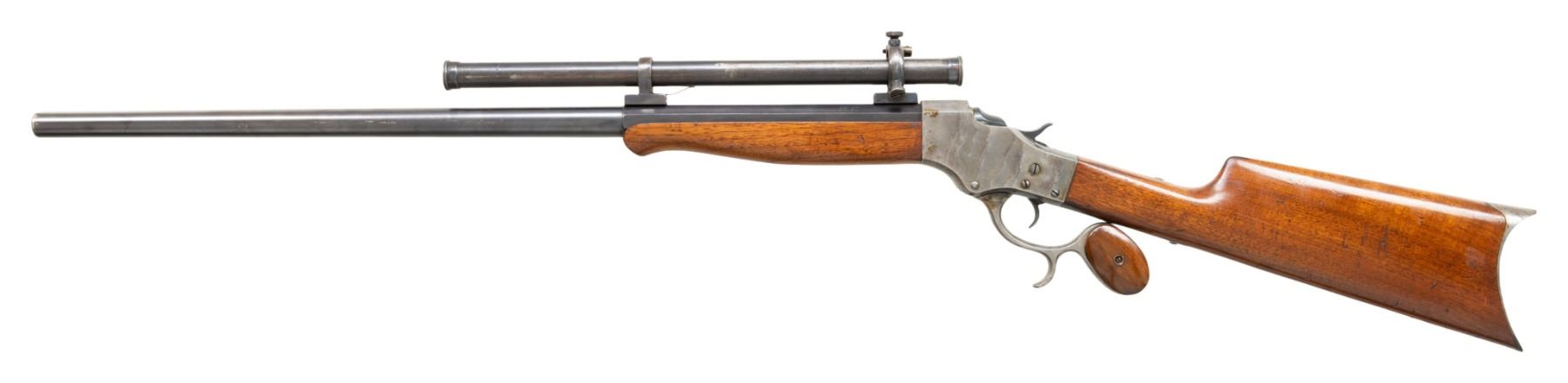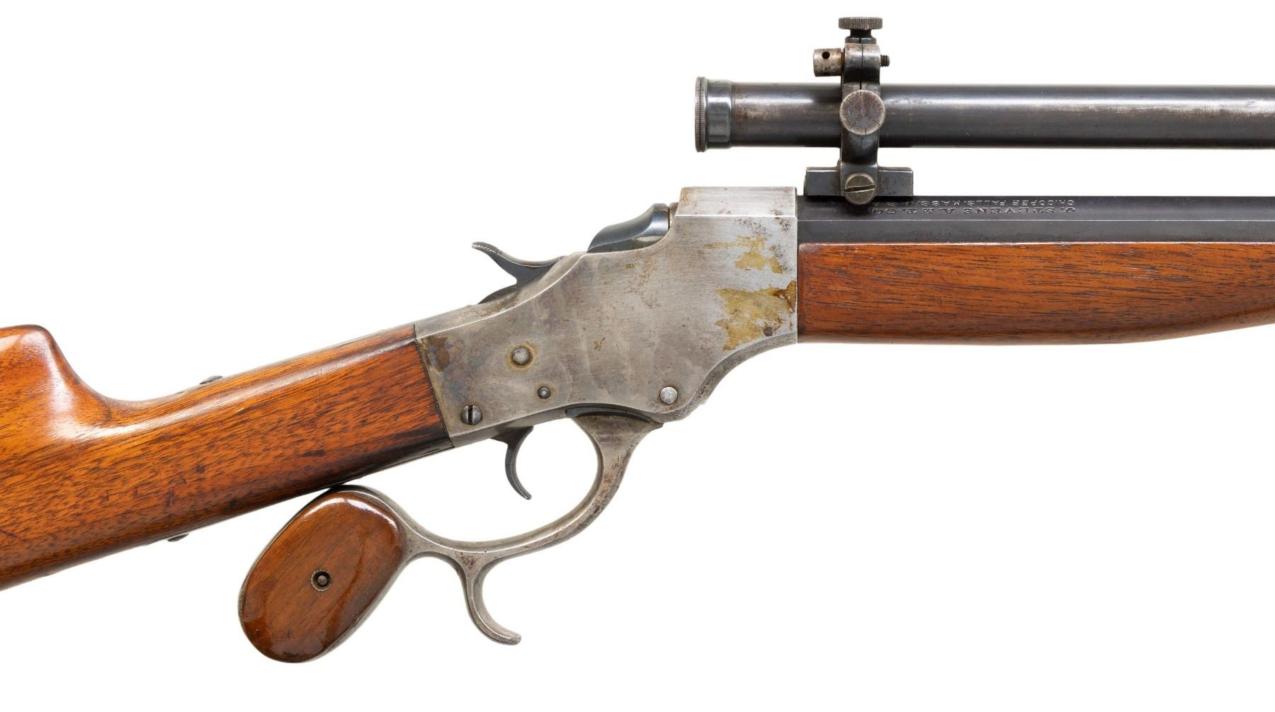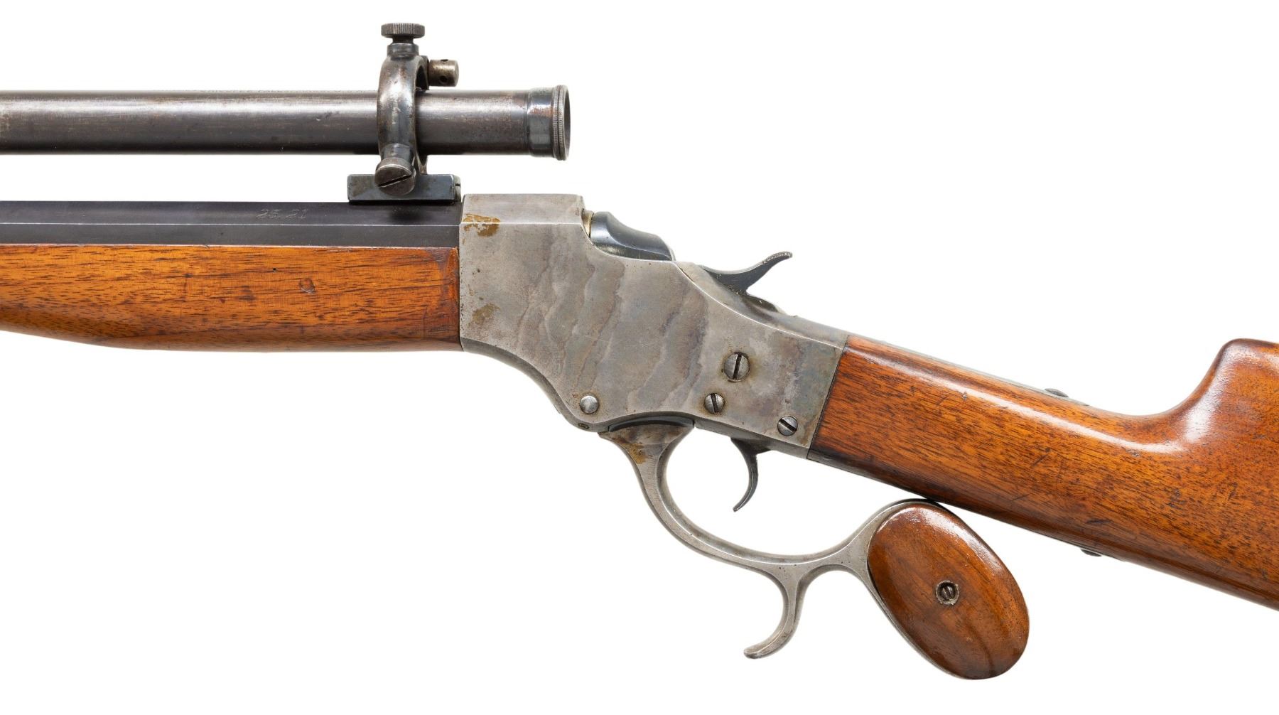 STEVENS TUBE SCOPE. Cal. 25.21 (25-21 Stevens). S# 955. Mfg. 1903-1916. Half rnd., half oct. 26" barrel. Stevens Tube Scope S# 470 w/ fine crosshairs, external adj. scope base on scope blocks measuring 7" from center. Case colored receiver w/ opening lever having finger curl & walnut grip panels. Walnut stock set w/ crescent buttplate. CONDITION: over 75% original barrel blue showing brown patina mixed throughout along with scattered marks & scratches. Receiver has fair muted case colors with spots of varnish, peppery oxidation & scratches. Lightly sanded & refinished wood shows numerous dings & scratches. Good rifling with wear to lands & residue in front of chamber. Fair blue on exterior of scope with cloudy optics & dust on crosshairs. PROVENANCE: Estate of Groves Herrick. (25-6735/MD). CURIO. $700-1000.