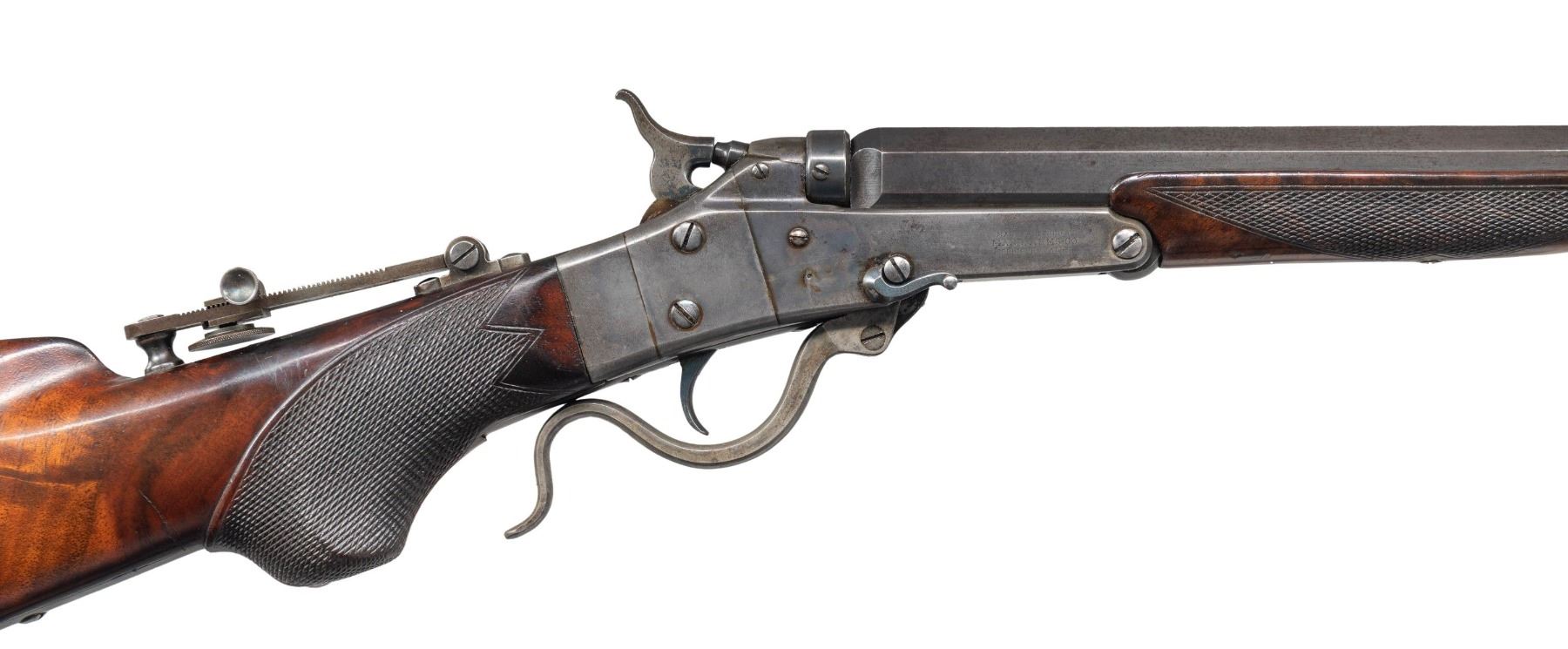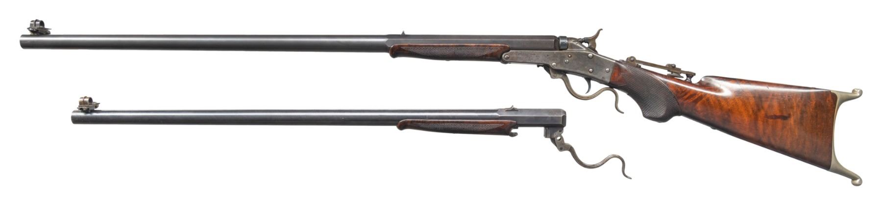 SINGLE SHOT RIFLE. Cal. 35-30 Maynard & 22RF. S# 25602. Bbl 1 is 35-30, oct to round measuring 28". Bbl 2 is 22RF, round w/ oct shank measuring 26". Both bbls have Windgauge front with fixed v-notch rear sights. Both have schnable tip forearms of fancy checkered walnut. Improved No. 16 Target rifle with case colored action having Hadley's patent device for rimfire cartridges. Vernier tang sight, pistol grip stock of checkered fancy walnut with nickel finished brass Schutzen buttplate. CONDITION: both bbls retain over 75% lightly worn blue showing edge and carry wear with small handling marks. The receiver retains some light and fading case colors in the more protected areas with silvering from carry wear. Company markings address on right of receiver show wear. Stock and both forearms show lightly worn finish and checkering with scattered scratches and marks. Both bores generally have bright appearances with lightly worn rifling and spots of very light pitting. (01-28040/DS). ANTIQUE. $6,000-8,000.