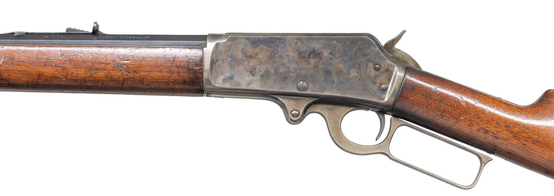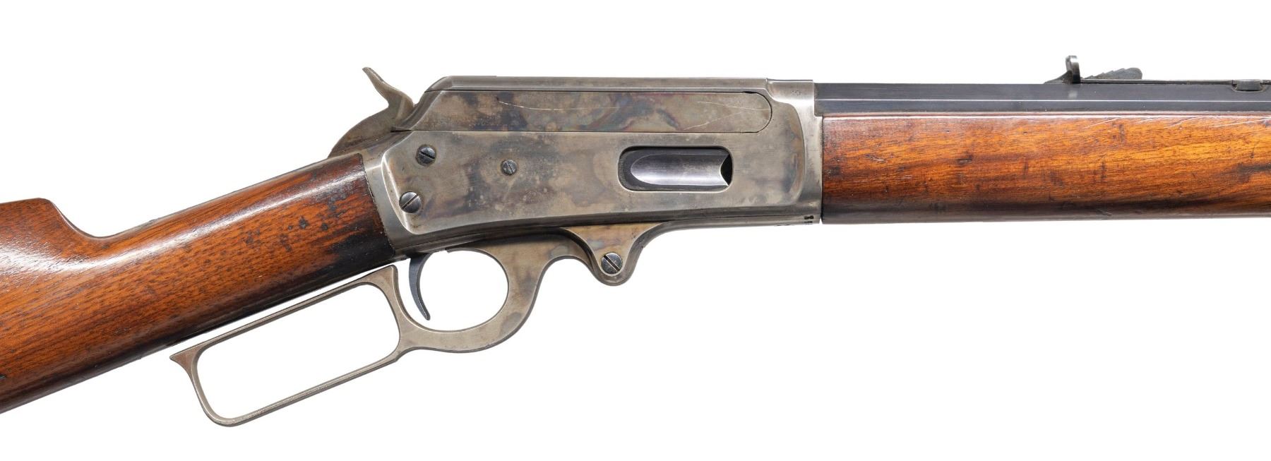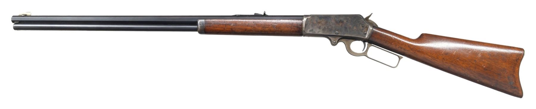 Cal. 25-36 Marlin. S# 355572. Mfg. approx. 1907. Oct. 26" barrel with German silver blade front sight, elevator rear sight. Tubular mag. Case colored receiver. Walnut stock set with curved buttplate. CONDITION: over over 80% blue with light fading to brown, scattered light scratches. Fair case colors with light scratches & handling wear. Good wood appearance with numerous dings, sm. gouges & marks. Good strong rifling w/ light wear & pinprick patina. PROVENANCE: The Esteemed Norm Greenberg Collection. (25-4212/MD). CURIO. $1,000-1,500.
