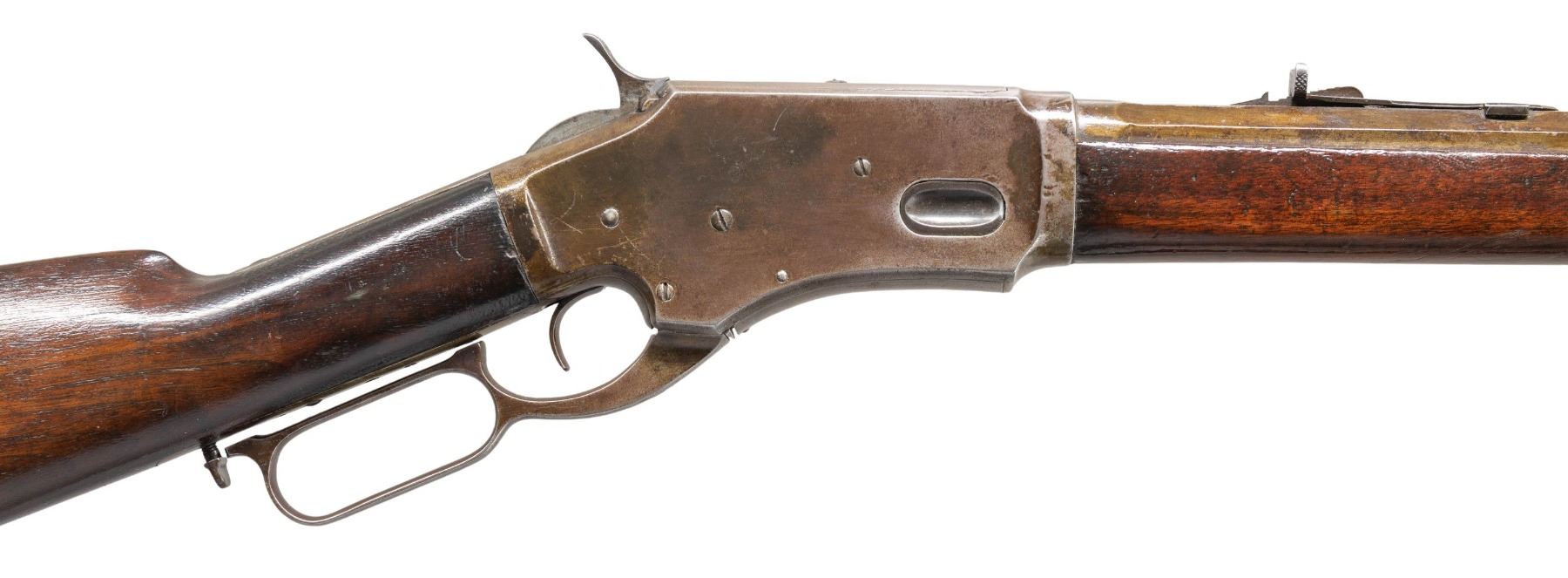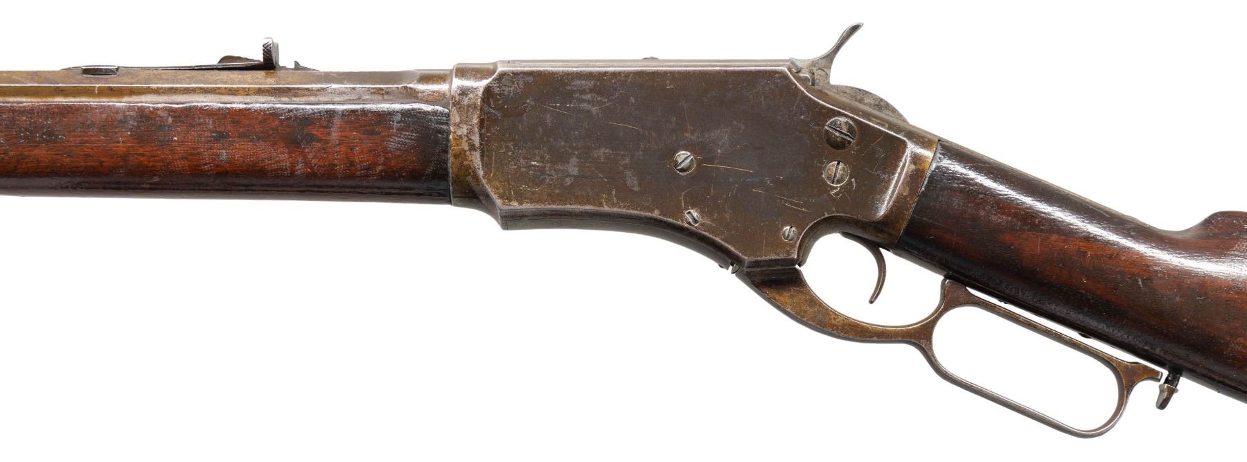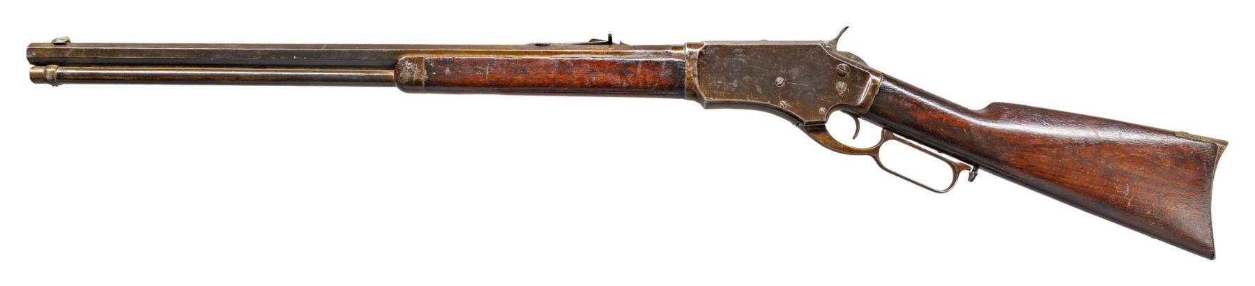 RIFLE. Cal. 38-40. S#. Q600. Bbl. 24" octagon with 2 line address. German silver blade front with sporting rear sight. Full length mag. Loop style lever. Walnut forend & straight grip stock with crescent steel trap door buttplate. Estimated quantity of 15,000, mfg. 1879-1886. CONDITON: metal has faded to brown with a heavy added coating of stock finish. The wood shows heavy wear and marks with a heavy coating of added finish. Sound action. Dark pitted bore retains partially intact rifling. (01-28206/DS). ANTIQUE. $1,500-2,250.