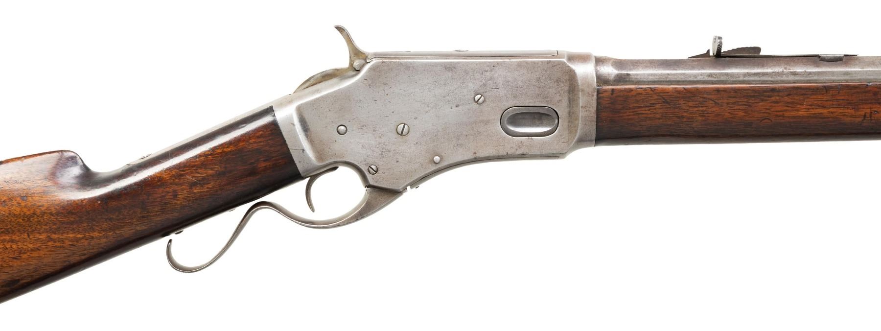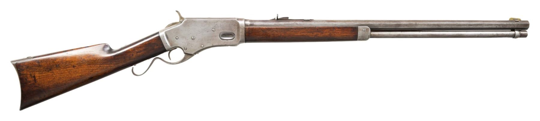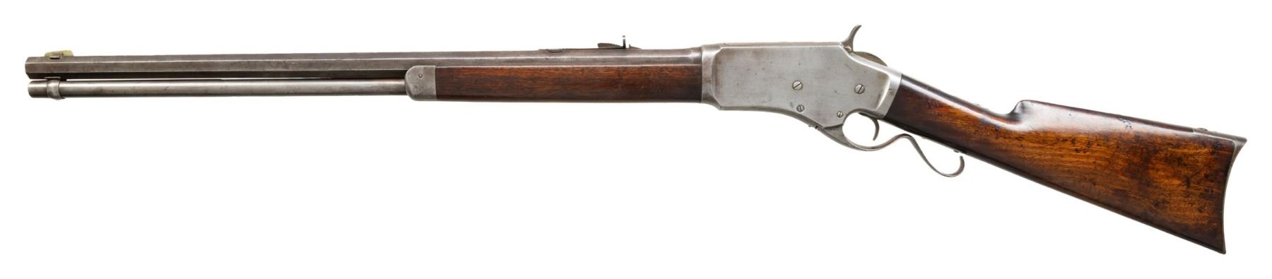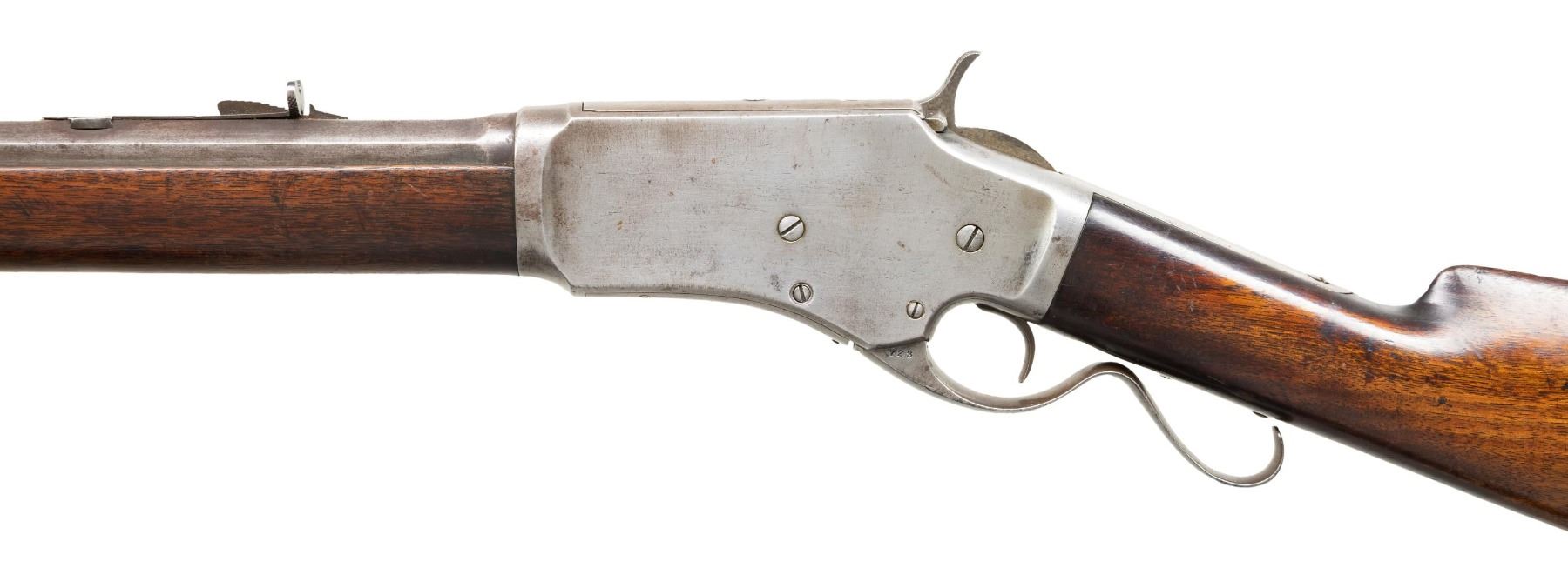 RIFLE. Cal. 44CF (44-40). S# 723. Bbl. 24" octagon Top flat is marked only "KENNEDY" without normal 1 or 2 line addresses. German silver blade Rocky Mountain front with sporting rear sight. Full length mag. "S" style lever. Walnut forend & straight grip stock with crescent steel buttplate. Estimated production of 15,000 mfg. 1879-1886. CONDITION: metal has a cleaned gray appearance with scattered spots of very light pitting. The wood has added finish over scratches & marks. Sound mechanics. The bore is generally bright with strong rifling. (01-28715/DS). ANTIQUE. $1,500-2,250.