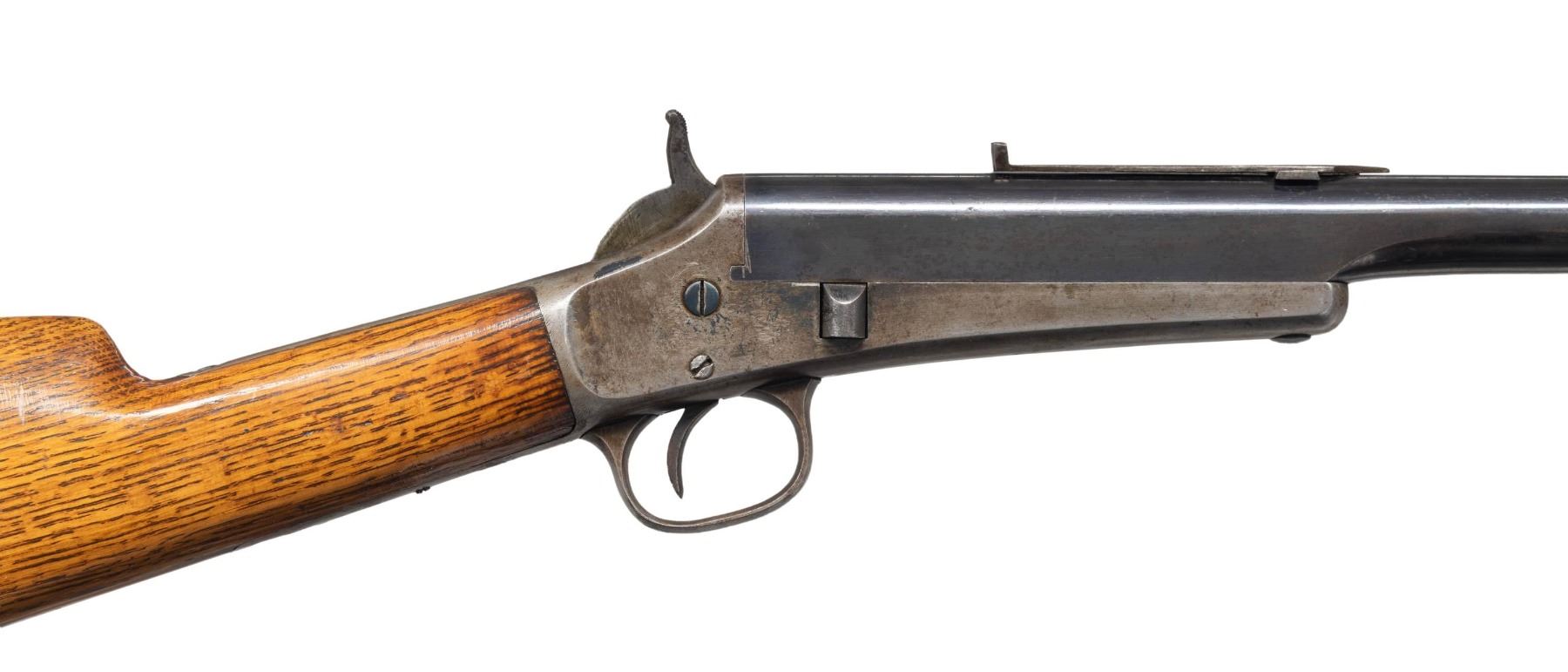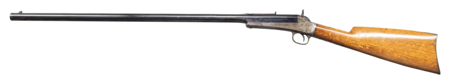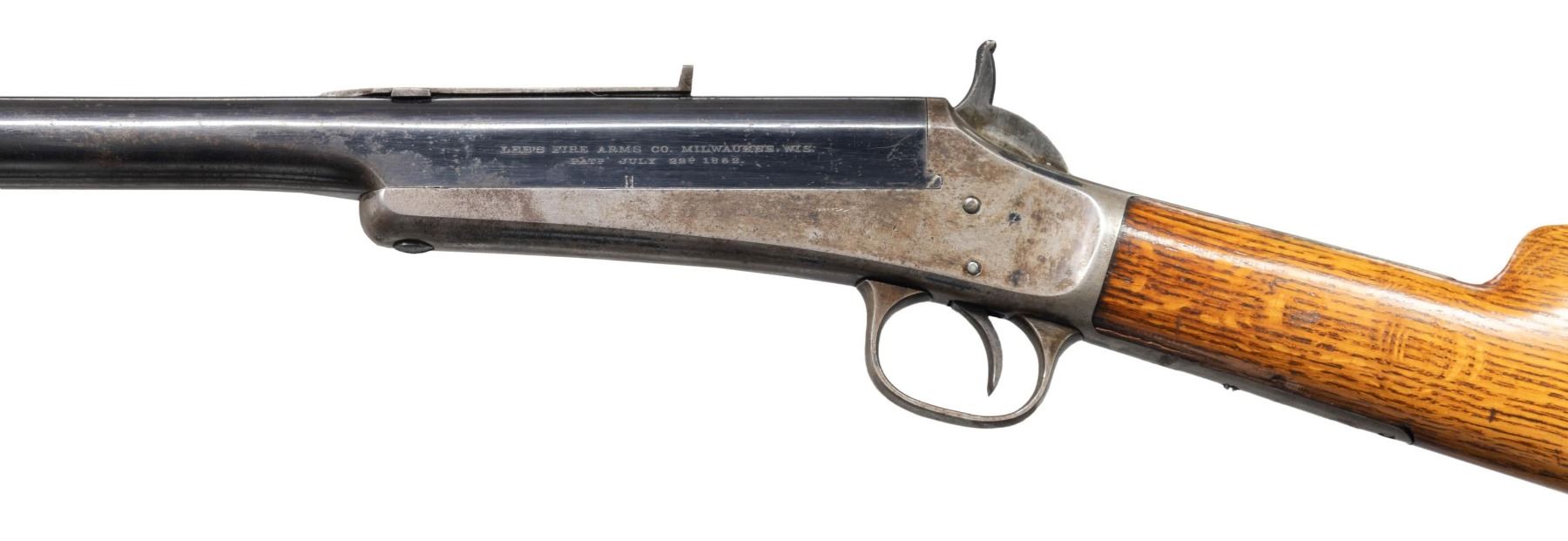 SPORTING RIFLE. Cal. 38 RF. S# 2114. Made between 1865-66 is estimated that fewer than 1,000 were made in all types. Most being military carbines; the majority were unfinished, as the Civil War had ended. This scarce sporting rifle has 29-5/8" bright blued barrel fitted with "U" notch rear and silver blade front sights marked "LEE'S FIRE ARMS CO. MILWAUKEE, WIS." "PATd JULY 22d 1862" on left side rear. Blued boxlock action releases barrel catch with hammer at second cocking click allowing barrel to swing to the right for loading. Extractor is actuated by finger piece on right. S# is on action watertable. Barrel is locked in place at both full cock and with hammer completely down. Straight grip buttstock made of quartered chestnut measures 14-1/8" over crescent steel buttplate. Rifle is made without forend wood. CONDITION: very fine. Barrel retaining over 85% original bright blue with some scattered freckling. Action appears to be bright blued as well, traces of that blue remain; the rest almost completely flaked to gray brown. Stock retains most of its original varnish finish with some minor marks. Bore is very good, shiny with some pitting. Mechanically good. PROVENANCE: Estate of Groves Herrick. (01-28353/MGM). ANTIQUE. $1,500-2,250.