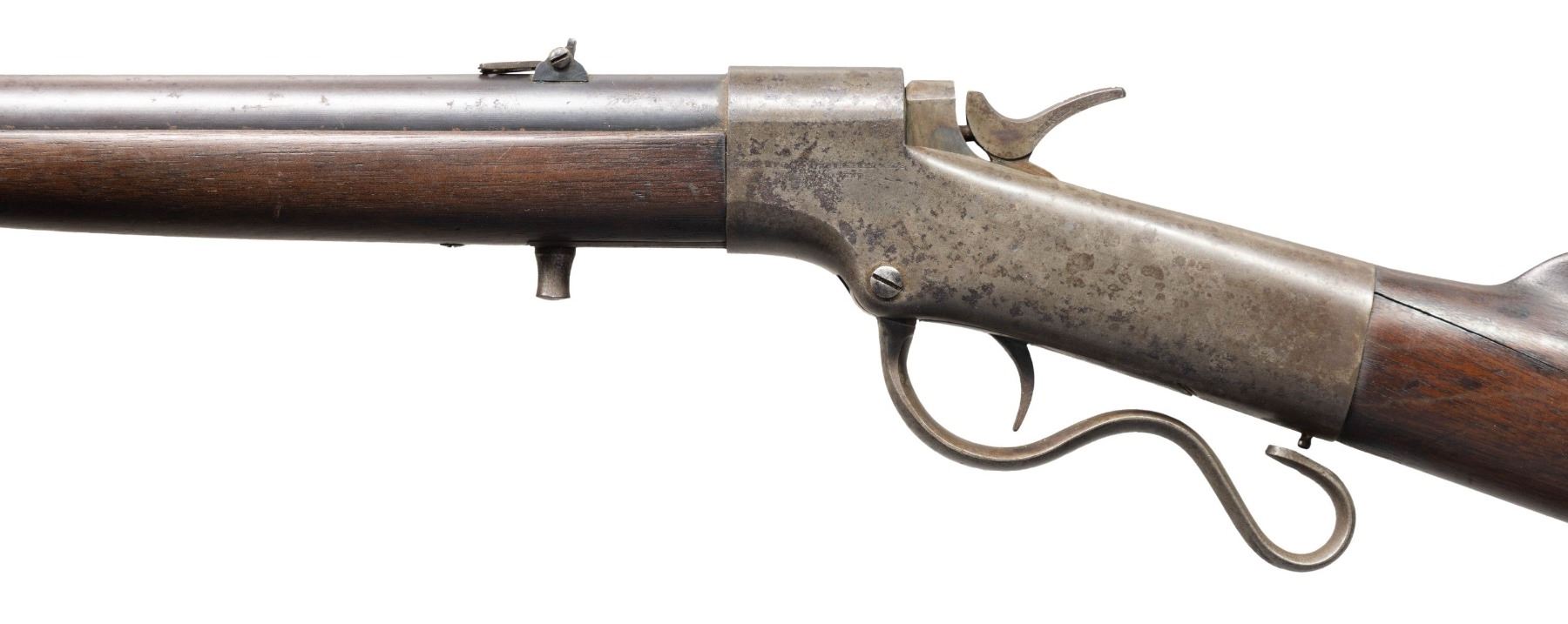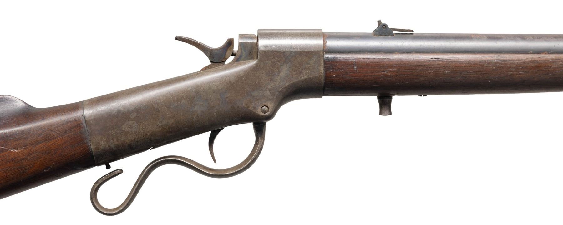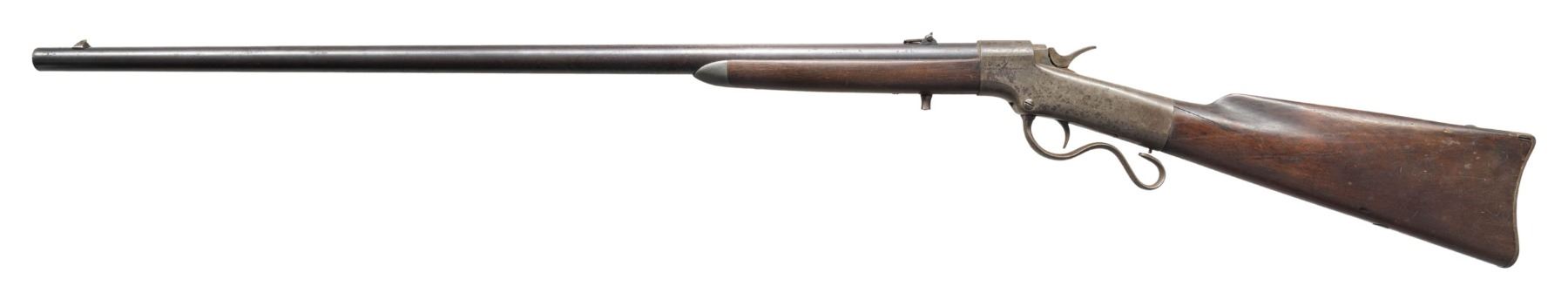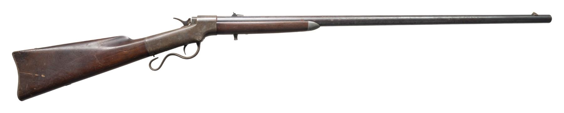 RIFLE. Cal. 44. S# 21302. Rnd. 30" barrel. Blade front sight & folding rear sight. Ballard patent action with serpentine lever; forearm has slot for manual extractor of a rimfire barrel. Walnut stock set w/ musket buttplate & pewter forearm tip. CONDITION: fair fading barrel blue mixed with brown patina showing oxidation throughout. Faint case colors on action with patina & light pitting. Fair worn wood finish with large crack right side wrist, numerous dings & marks. Dark bore shows strong rifling under large deposits of fouling. (01-28562/MD). ANTIQUE. $1,200-1,500.