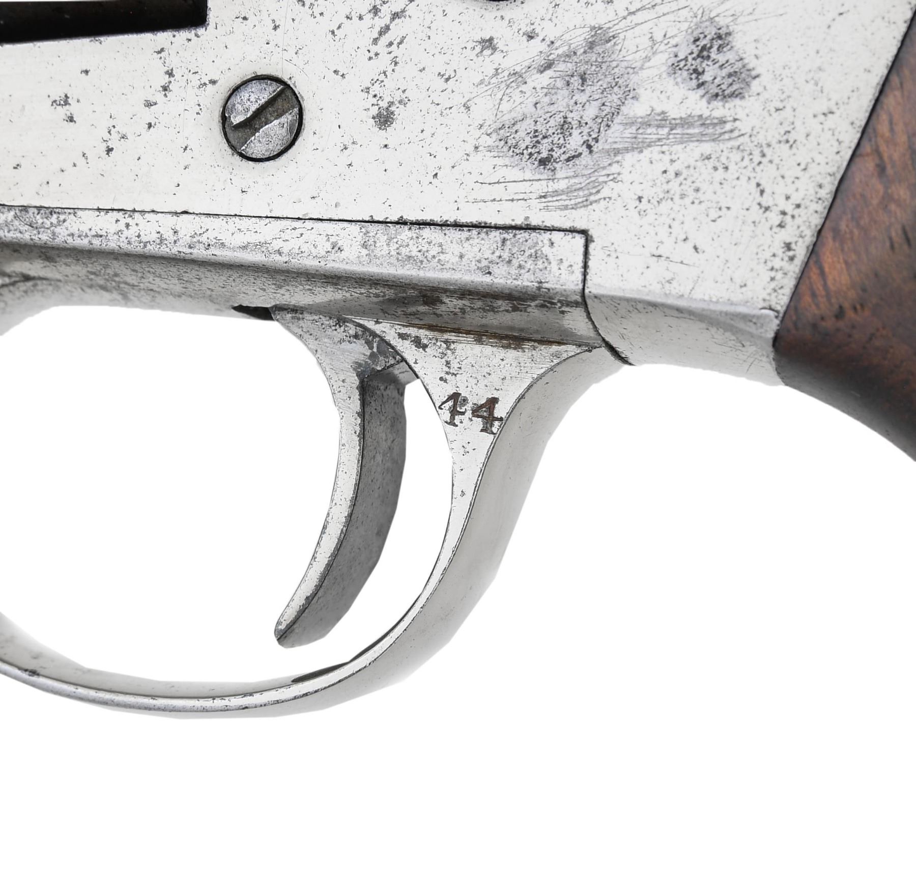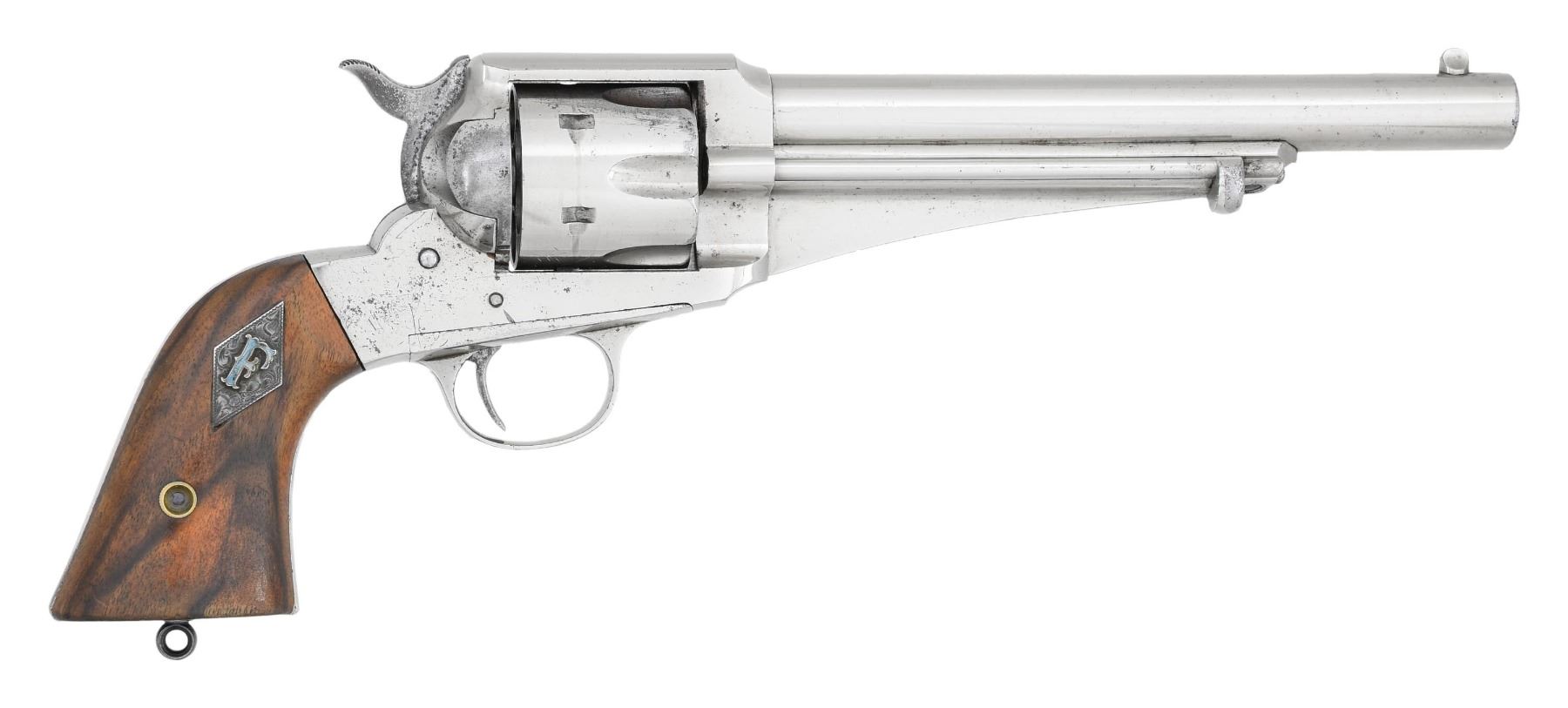 Cal. 44-40. NSN. Bbl. 7 1/2" rnd. with semi-circular blade front sight and distinctive webbed ejector housing. Bottom of ejector housing have 4 intentionally cut "kill notches". 6-shot fluted cyl. Full nickel finish. 2-piece walnut grips have added diamond shaped inserts with raised letter "F" against engraved backgrounds. Butt of gun has a replacement blued lanyard stud. Cyl. is marked with assembly # "653". Inside of grip frame has probable assembly # "1019". Estimated 25,000-30,000 mfg. 1875-1889. CONDITION: 90% original nickel finish showing scattered spots of corrosion and finish loss with light dents and handling marks. Refinished grips show wear and handling marks. Sound action. Lightly pitted bore retains intact rifling. PROVENANCE: The Esteemed Norm Greenberg Collection. (01-27639/DS). ANTIQUE. $2,000-3,000.