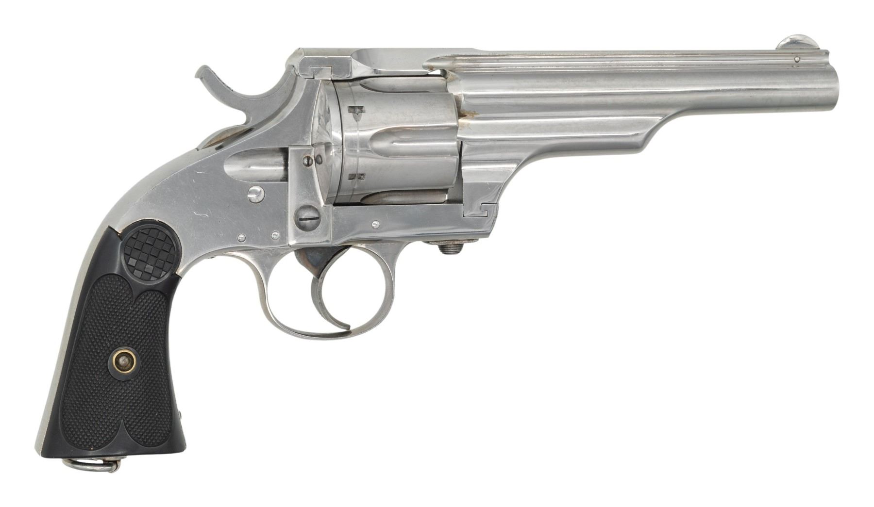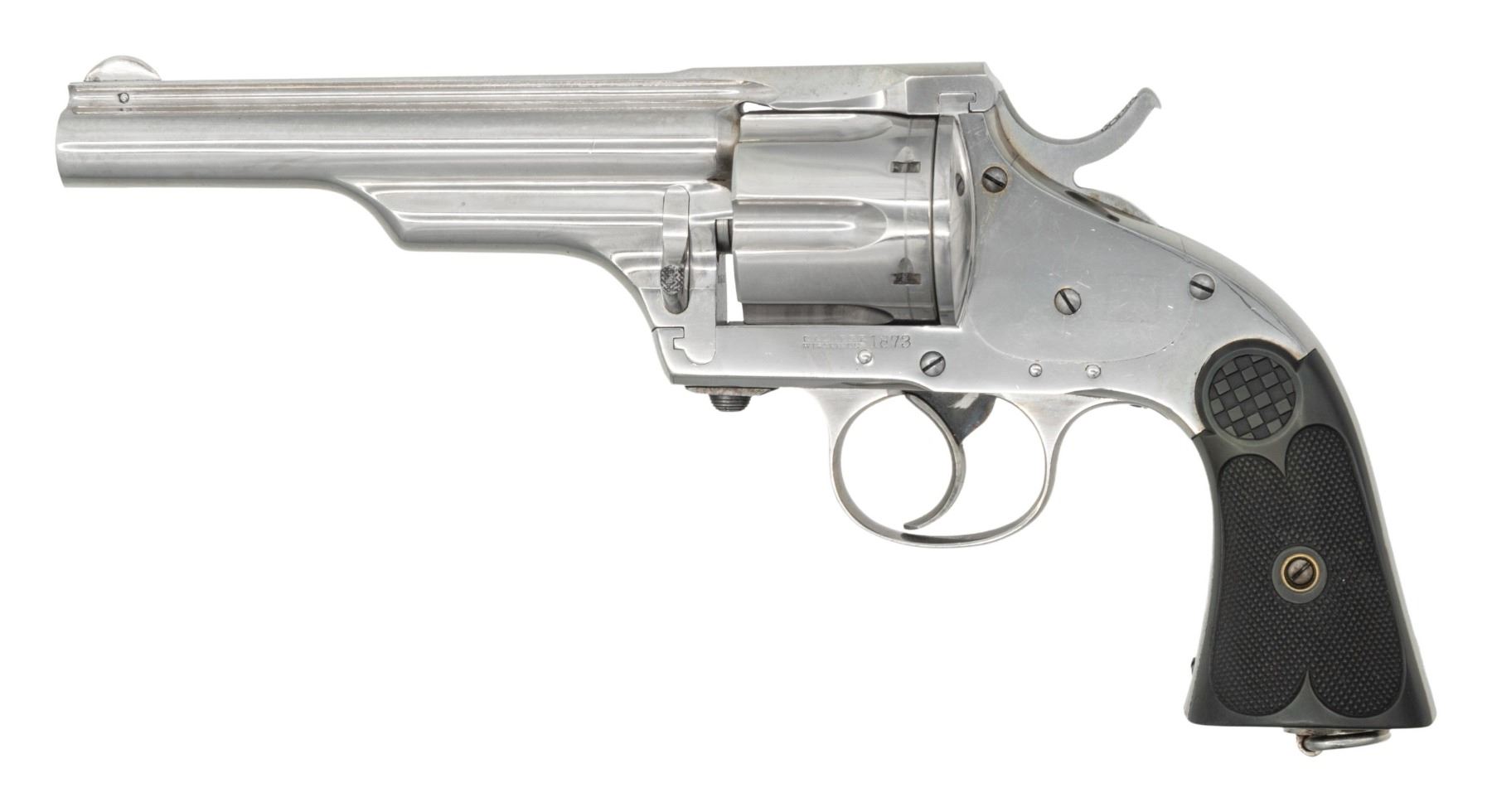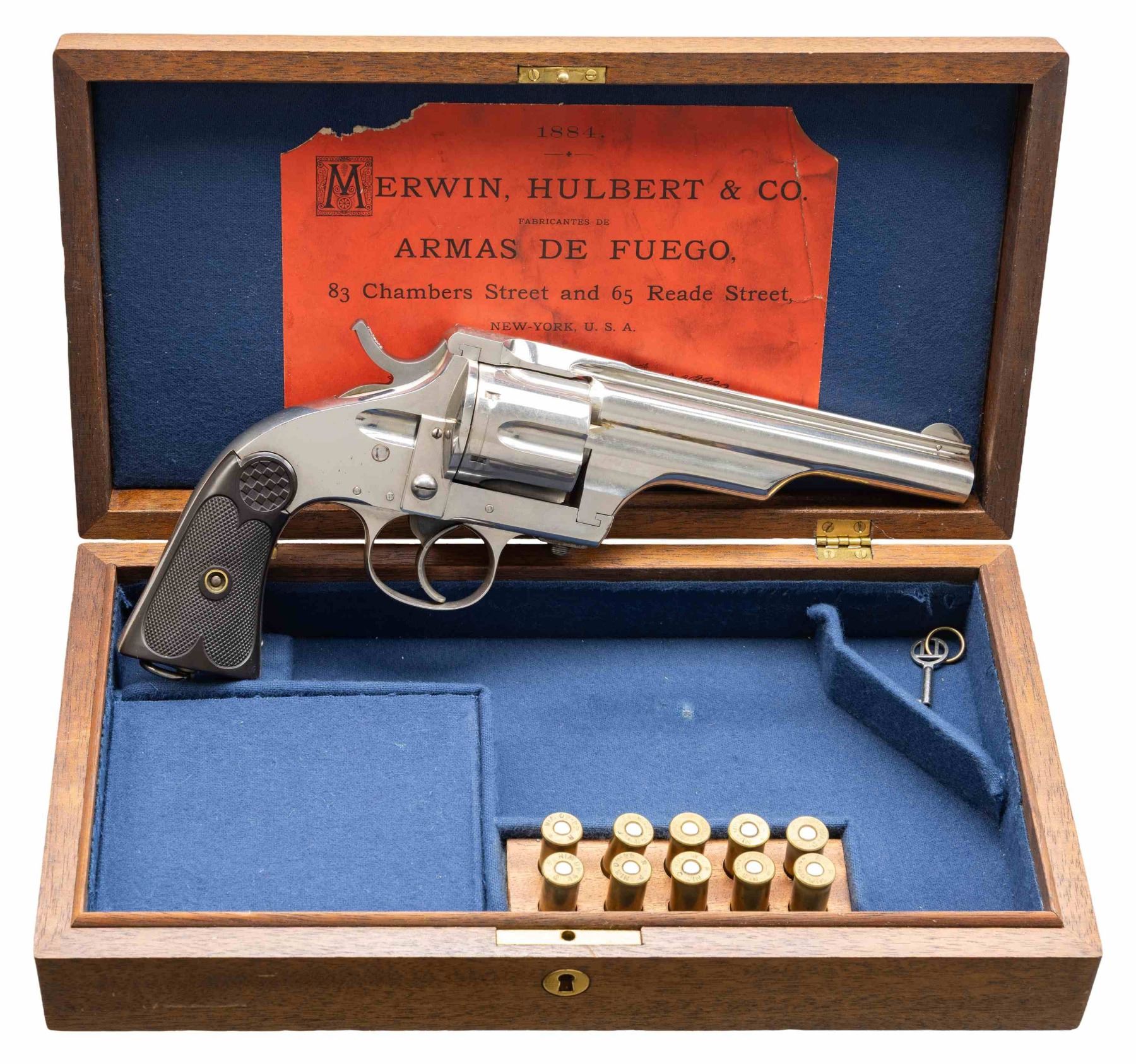 REVOLVER. Cal. 44-40. S# 23510. Bbl. 5 1/2" with solid rib & pinned blade front sight. Mfg. by Hopkins & Allen in the 1880s. Matching numbers on rear of bbl. lug, rear of cyl. & on butt. Left side of frame stamped "CALIBRE / WINCHESTER 1873". 6 Shot fluted cy. Lanyard ring in butt. Original 2 piece checkered hard rubber grips. UNATTACHED ACCESSORIES: compartmentalized walnut display case. Case contains 8 rds. 44-40 ammunition. Interior of lid has Merwin & Hulbert label. CONDITION: very fine as factory quality refinished? metal components retain 99% high polish nickel plating. All edges appear sharp. Grips are near excellent. Mirror bore with crisp rifling. PROVENANCE: From the Buckstix Collection. (01-28583/BH). ANTIQUE. $3,000-5,000.