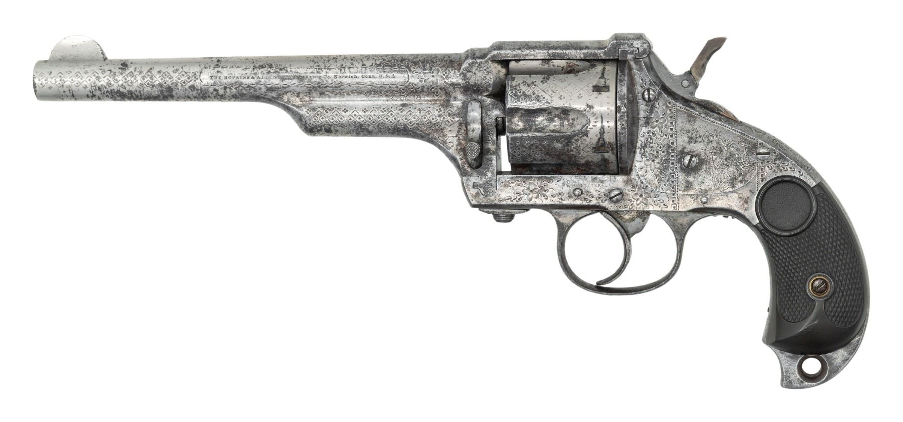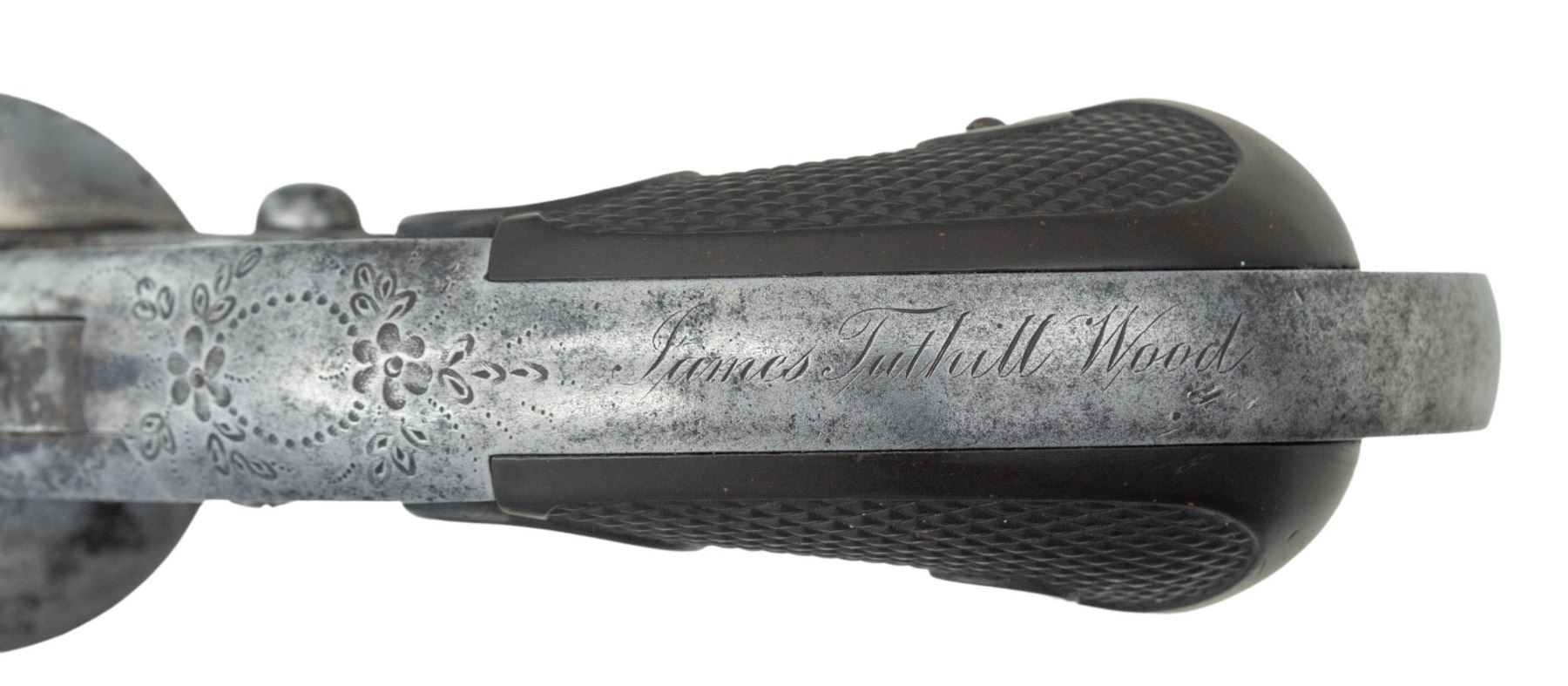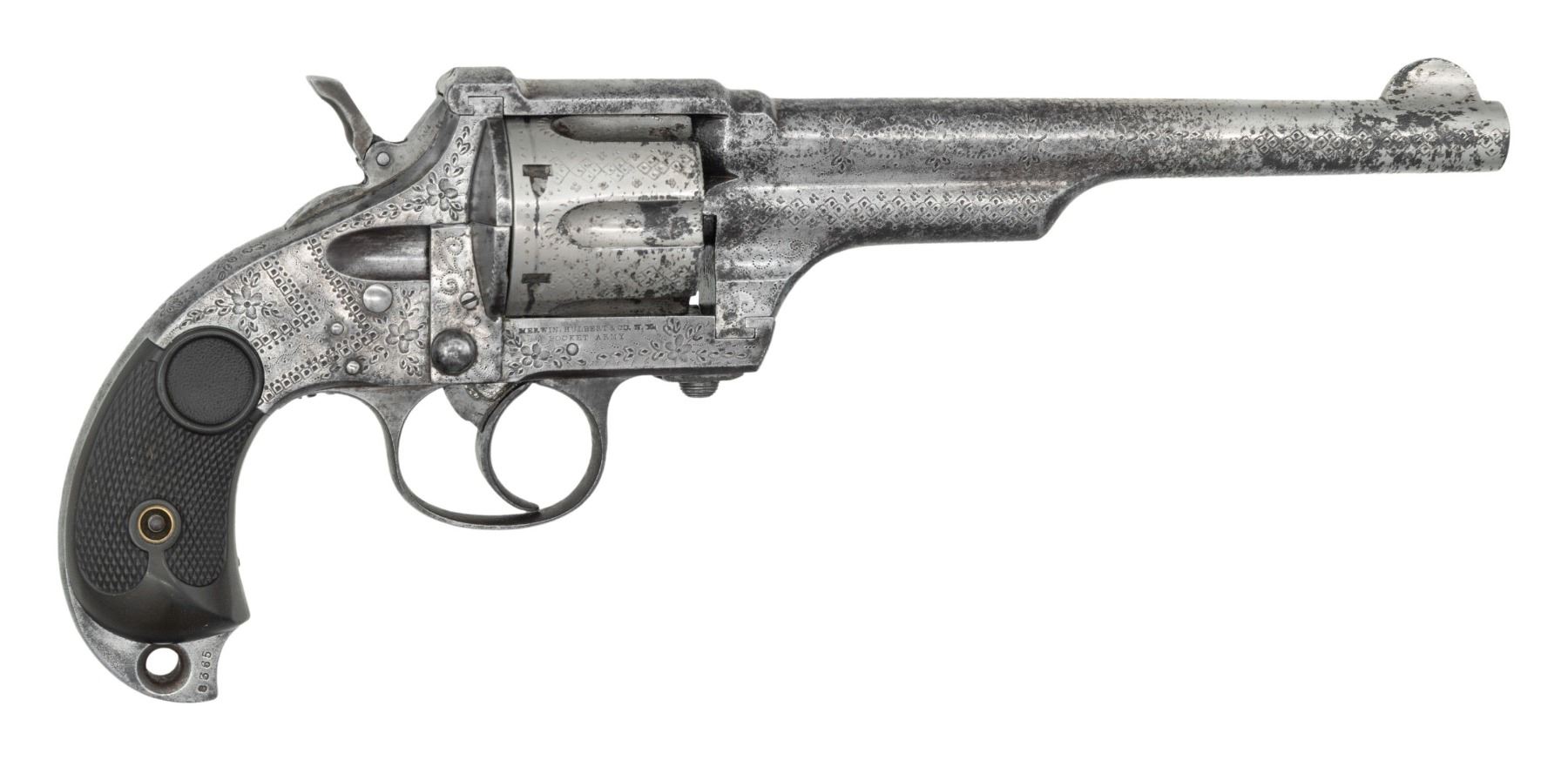 3RD MODEL POCKET ARMY DA REVOLVER. Cal. 44-40. S# 8365. Bbl. 7" with integral blade front sight. Mfg. by Hopkins & Allen for Merwin & Hulbert. Revolver features the unique full coverage factory floral engraving with deer on left side of frame. Backstrap is inscribed "James Tuthill Wood". Matching numbered frame, cyl. & bbl. assembly. Left side of frame marked "CALIBRE / WINCHESTER 1873". Right sid of frame stamped "MERWIN, HULBERT & CO. N.Y. / POCKET ARMY". 6 Shot fluted cyl. Folding hammer. 2 Piece checkered hard rubber grips on "skullcrusher" grip frame. Factory nickel finish. CONDITION: bbl. assembly retains 30% original flaking nickel. Cyl. retains 60% original flaking nickel. Balance of metal fading to gray with scattered light oxidation & areas of fine & moderate pitting. edges of 2 cyl. flutes show moderate dents. very good grips beginning to fade to brown with age. Good bore with scattered areas of light pitting. PROVENANCE: From the Buckstix Collection. (01-28589/BH). ANTIQUE. $3,000-5,000.