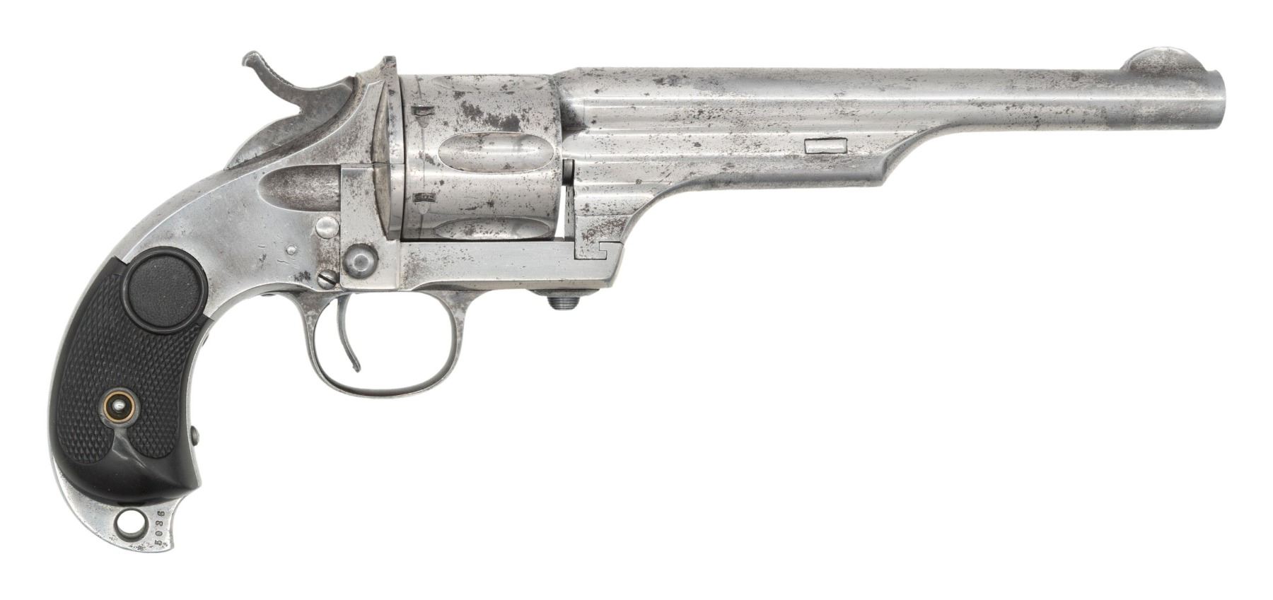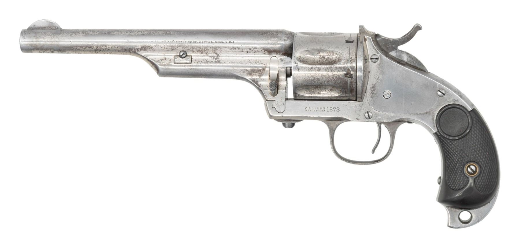 ACTION REVOLVER. Caliber 44-40, left side of frame is marked "CALIBRE WINCHESTER 1873". s#. 5036. Bbl. 7" round with lug & integral semi circular front sight. Scoop fluted 6 shot cyl. Open top frame. Bbl. turns & slides forward for loading. Nickel finish. Checkered hard rubber 2 piece grips with ring at the round butt. Mfg. 1876-1880s. CONDITION: over 30% nickel showing areas of wear & spotting. Grips show light wear. Sound mechanics. Lightly pitted bore retains good rifling. PROVENANCE: The Esteemed Norm Greenberg Collection. (01-27631/DS). ANTIQUE. $1,750-2,500.