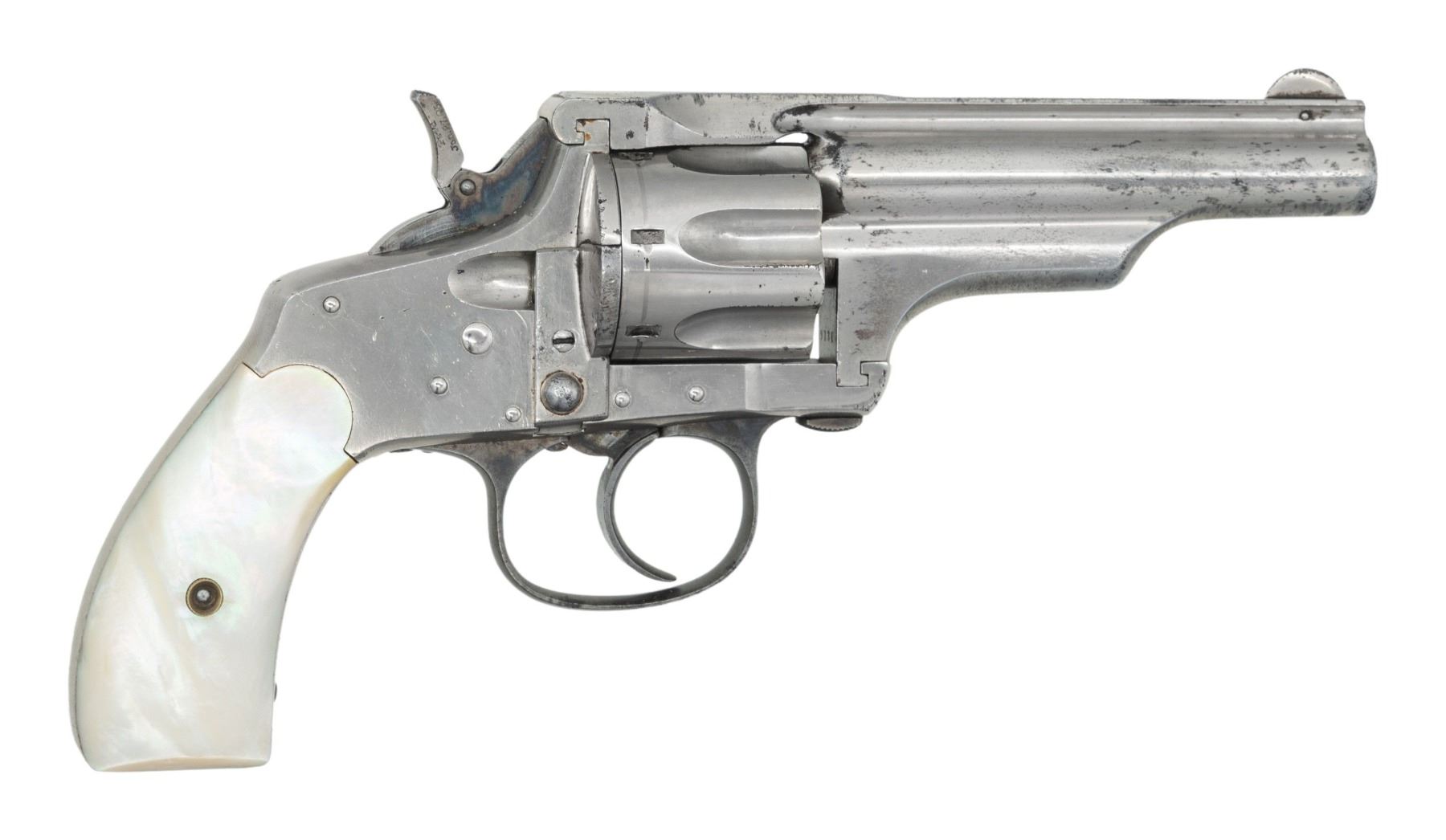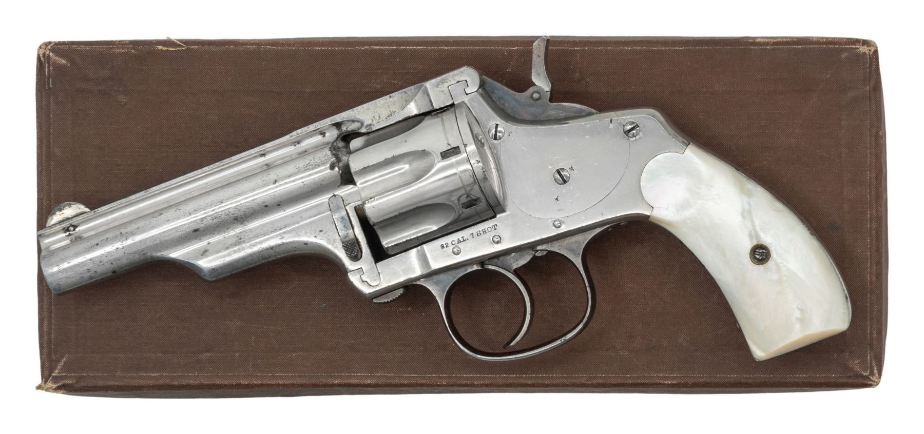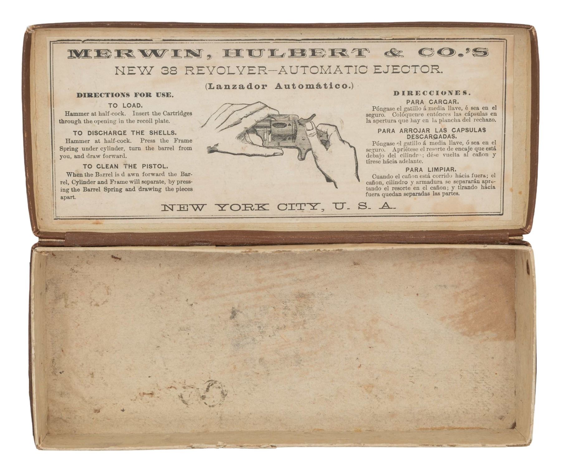 POCKET DA REVOLVER WITH FACTORY BOX & MOTHER OF PEARL GRIPS. Cal. 32 M&H Long. S# 9130. Mfg. 1880's. Matching numbered 3.5" bbl. w/ pinned blade front sight, rib has Merwin & Hulbert address markings & trench rear sight. Matching numbered 7 shot fluted cyl. Nickel finished with folding hammer spur & 2 piece mother of pearl grips. UNATTACHED ACCESSORIES: factory original brown 1 piece box with end label & label on interior of lid. Box in good intact condition showing fraying on edges & 2 torn corner on lid. CONDITION: good nickel finish on exterior with spots of peeling & numerous marks. Good appear grips with heavily distorted grip screw head. Bore shows worn rifling & pitting. PROVENANCE: From the Buckstix Collection. (01-28602/MD). ANTIQUE. $1,500-2,500.