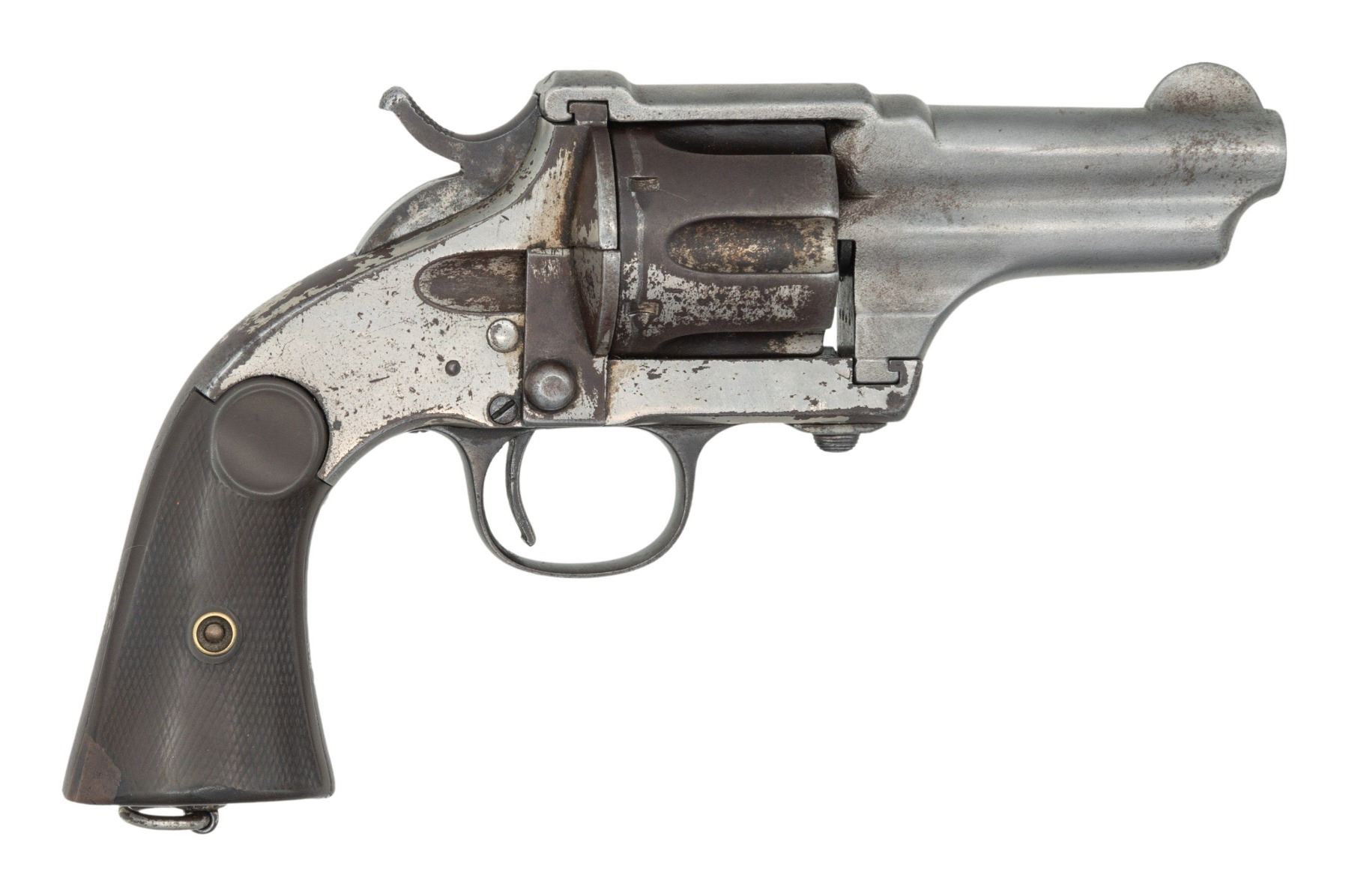 Cal. 44-40. S# 15926. Bbl. 3 3/8". Mfg. for Merwin & Hulbert by Hopkins & Allen. 6 Shot fluted cyl. Flat butt with lanyard ring. 2 Piece checkered hard rubber grips. Bbl. & cyl marked with assembly numbers "6447". Left side of frame marked "CALIBRE / WINCHESTER 1873". Nickel finish. CONDITION: bbl. has been heavily cleaned with evidence of prior pitting. Cyl. retains 10% nickel with balance an even brown patina. Frame retains 70% original flaking nickel with scratches; exposed metal is an even brown patina. Bore has frosted appearance with good rifling. PROVENANCE: From the Buckstix Collection. (01-28586/BH). ANTIQUE. $1,200-1,800.