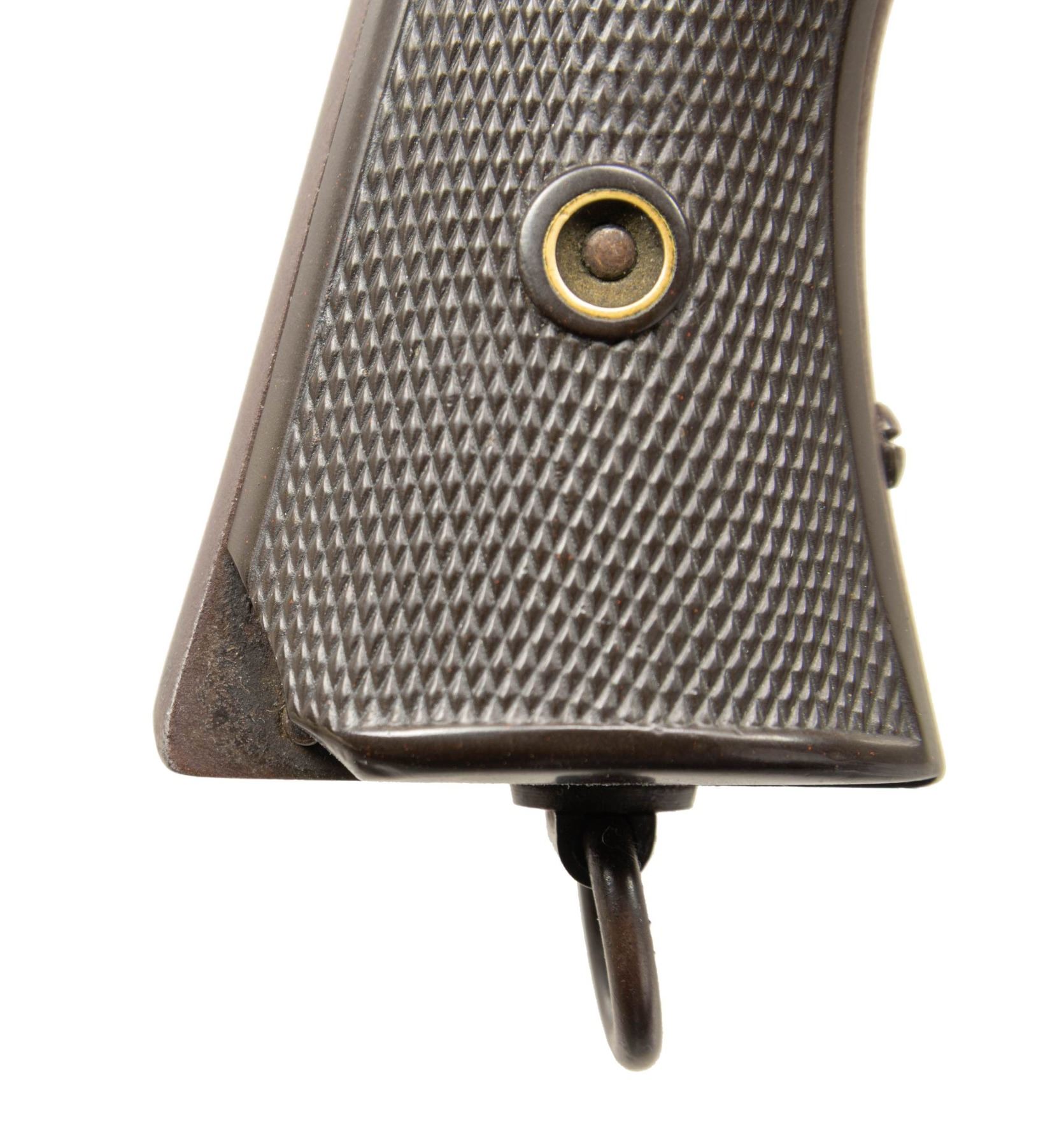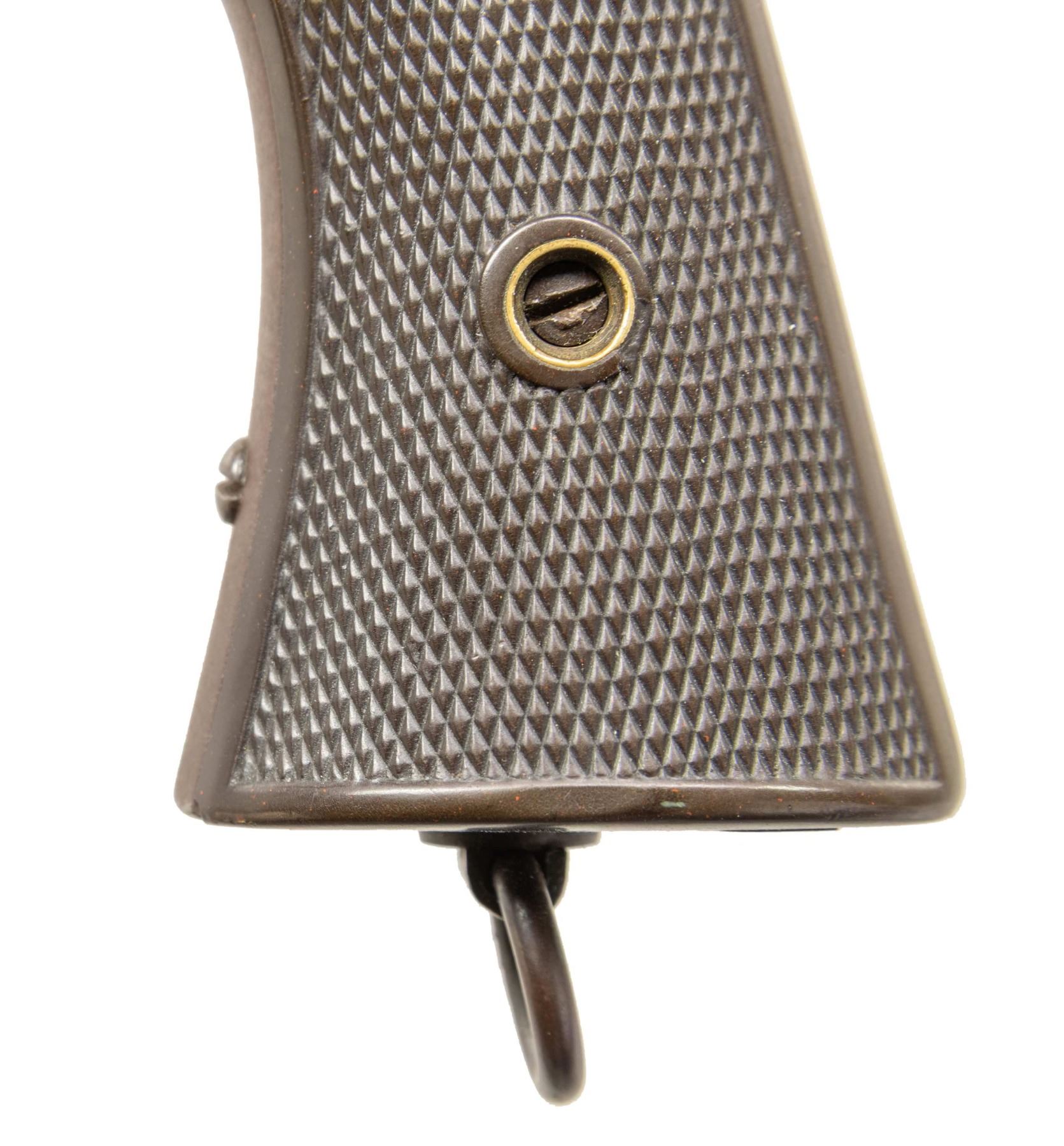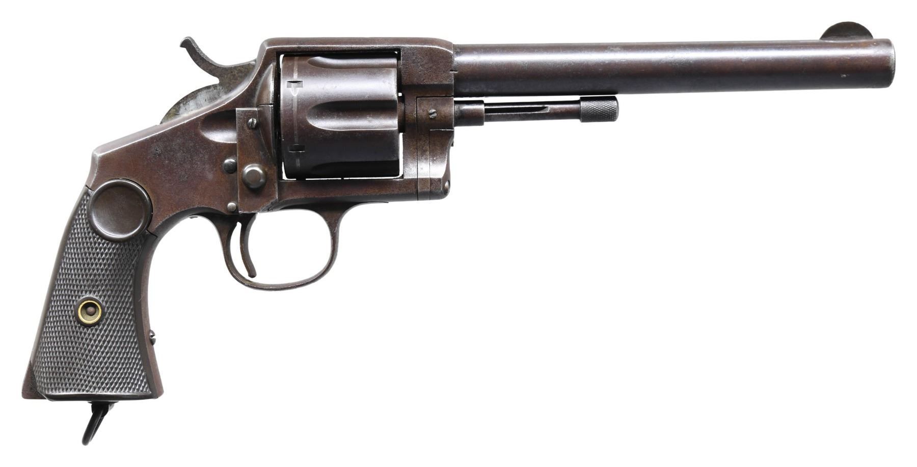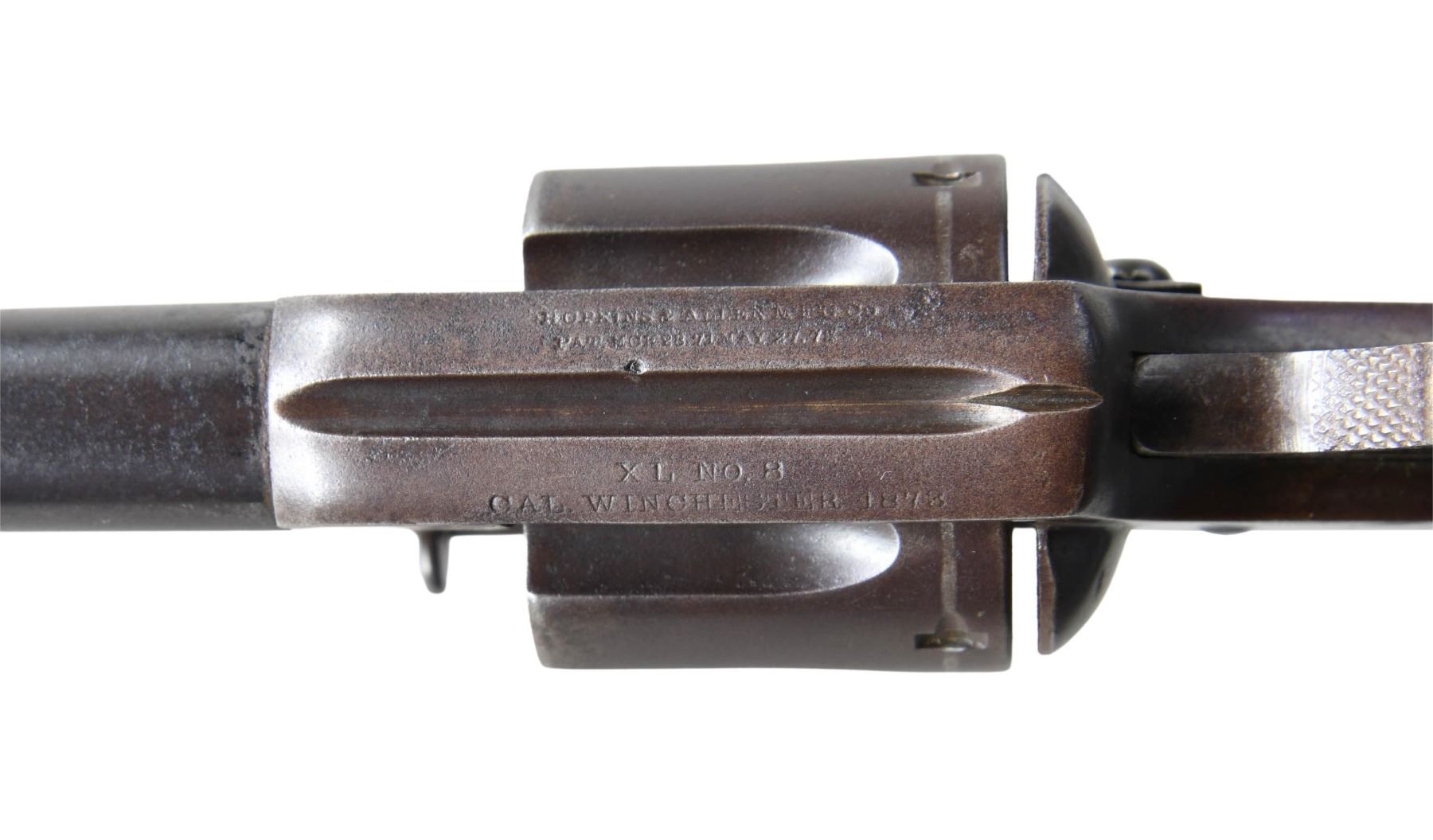 REVOLVER. Cal. 44-40. S# 1010 (beneath left grip panel). Bbl. 6 3/4". XL No. 8 Army single action revolver mfg. by Hopkins & Allen. Available information is conflicting, with production totaling approx. several hundred to 2,700 across all XL No. 8 variations. The top strap of the frame is marked "HOPKINS & ALLEN MFG Co/ PAT.MCH.28.81 MAY 27.78" above "XL NO. 8/ CAL WINCHESTER 1873". Metal components exhibit a blue finish. Frame is mounted with 2-piece checkered brown hard rubber grips and features a lanyard ring on the butt. Fixed half-moon blade front sight with frame V-notch rear sight. All serialized parts are matching and include the frame, trigger, loading gate, cyl., bbl., ejector rod / cyl. base pin crane, as well as the ejector rod / cyl. base pin crane latch. Right grip is matching via a lightly etched "1010" on the interior of the panel. CONDITION: metal components retain trace to fair amounts of their original factory blue finish, with the balance having faded to brown patina, exhibiting scattered spots and areas of light to mild pitting and surface oxidation. Bright bore, exhibiting scattered spots and patches of dark moderate pitting, while retaining strong rifling throughout. Hammer does not hold on cock, but cyl. otherwise indexes appropriately. Grips show some smoothing, with the left panel exhibiting a mild chip and crack on the butt at the frame grip pin, with the right panel exhibiting a large chip at the frame grip pin. PROVENANCE: The Esteemed Norm Greenberg Collection. (01-27634/MLW). ANTIQUE. $1,500-2,250.