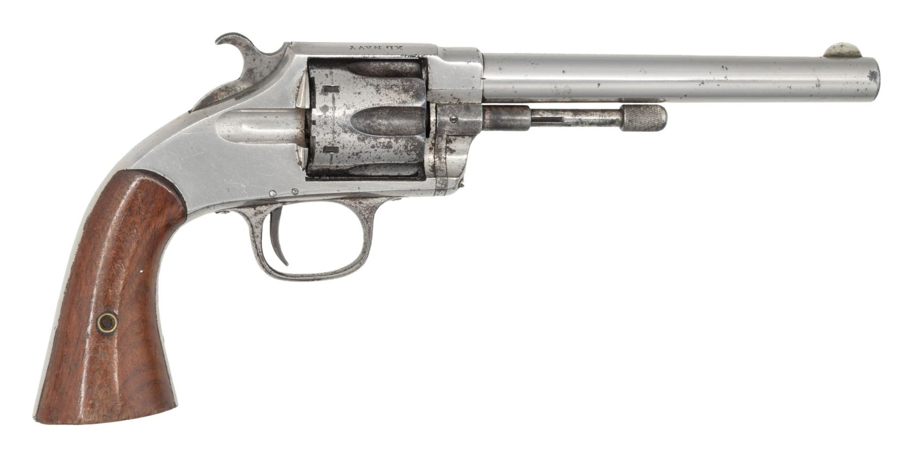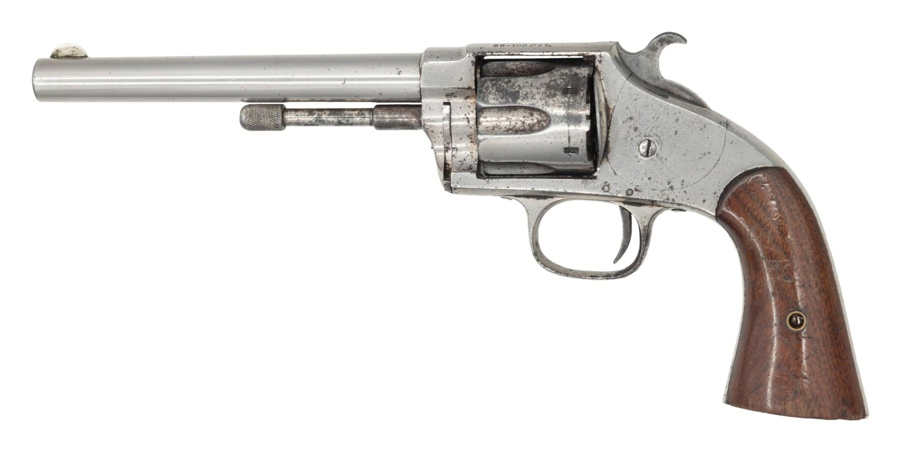 Cal. 38-100 (38 RF Long). S# 584 (bottom of barrel). Bbl. 6" with circular front sight. 6 Shot fluted cyl. Ejector pin . Nickel finish. Two piece walnut grips. CONDITION: over 50% original nickel showing large portions of peeling nickel finish to gray/brown patina. Fair grips shows large areas of scuffed finish, large gouges & chipped screw head. Fair rifling with pitting. PROVENANCE: The Esteemed Norm Greenberg Collection. (01-27633/MD). ANTIQUE. $1,400-1,900.