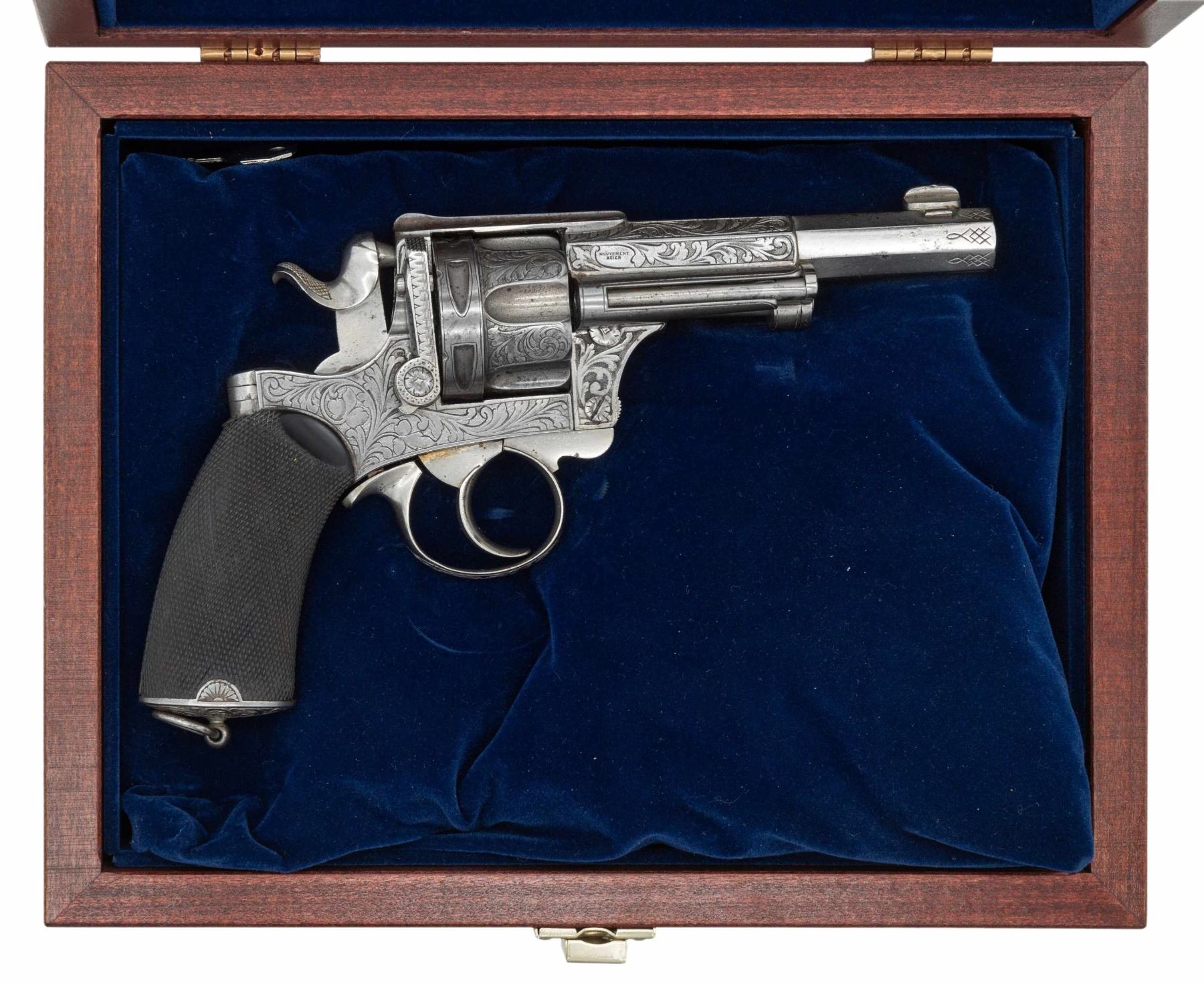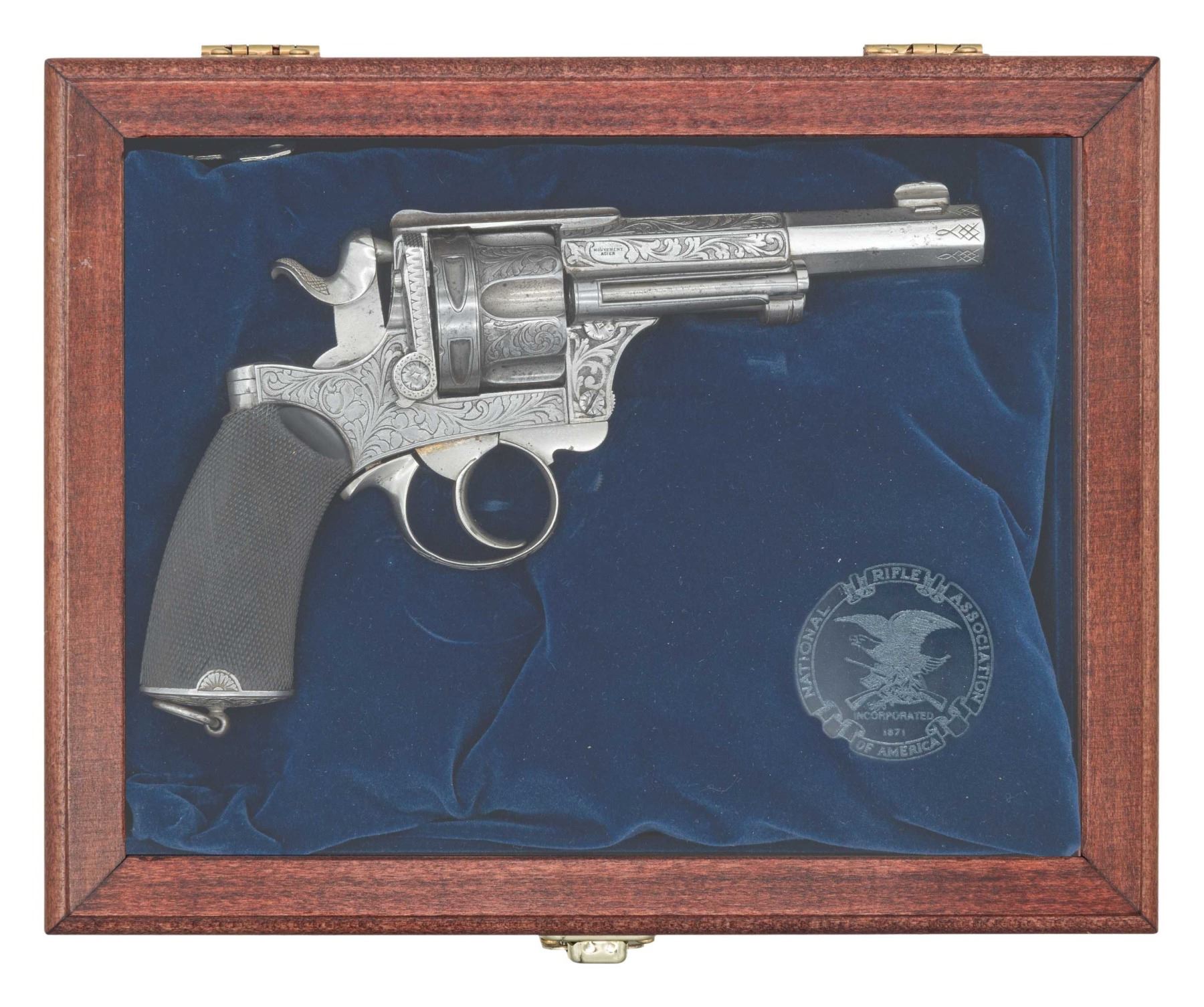 MAQUAIRE DOUBLE ACTION REVOLVER WITH DISPLAY CASE. Cal. 11mm. S# 6224. Bbl. 4 1/2". Fagnus Maquaire double action revolver mfg. in France by Fabrique De St. Etienne. The Fagnus Maquaire revolver closely resembles the French Model 1874 revolver, albeit with several notable improvements and external differences. The top flat of the octagonal bbl. is marked "ACIER FONDU" (French: "CAST STEEL), with "FABRIQUE/ DE ST ETIENNE" marked on the left and "MOUVEMENT/ ACIER" (French: "STEEL MOVEMENT" marked on the right. The frame features near full coverage bordered foliate scroll engraving, which extends to the sideplate takedown lever, sides of the cyl., trigger guard bow, as well as the pommel cap. Recoil shield and cyl. latch exhibit bands of decorative engraving, with each flat of the faceted bbl. exhibiting a geometric line design engraved at the breech area. Metal components exhibit a nickel plated finish overall. Frame is mounted with 2-piece checkered brown hard rubber grips, featuring a lanyard swivel and ring on the butt. Thick dovetailed blade front sight with integral large frame U-notched rear sight. Cyl. matches the frame via "24". UNATTACHED ACCESSORIES: unrelated wood NRA display case with glass lid. Case is housed within a cardboard shipping box. CONDITION: metal components retain the majority of their original nickel plated finish, exhibiting scattered small spots of flaking and wear that show through to dark oxidation overall. Bright bore, exhibiting some light pitting, while retaining well defined 4-groove rifling throughout. Proper manual mechanics. Grips show some light smoothing, as well as a couple of scattered marks from handling and storage, with the left panel exhibiting a chip beneath the rear trigger guard tang. NRA display case is very good overall. PROVENANCE: From the Buckstix Collection. (01-28581/MLW). ANTIQUE. $2,500-3,500.