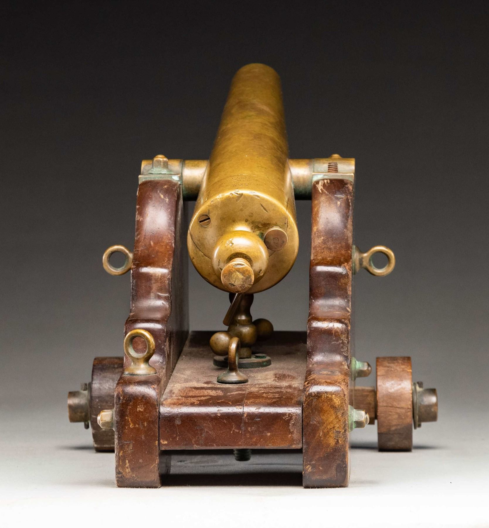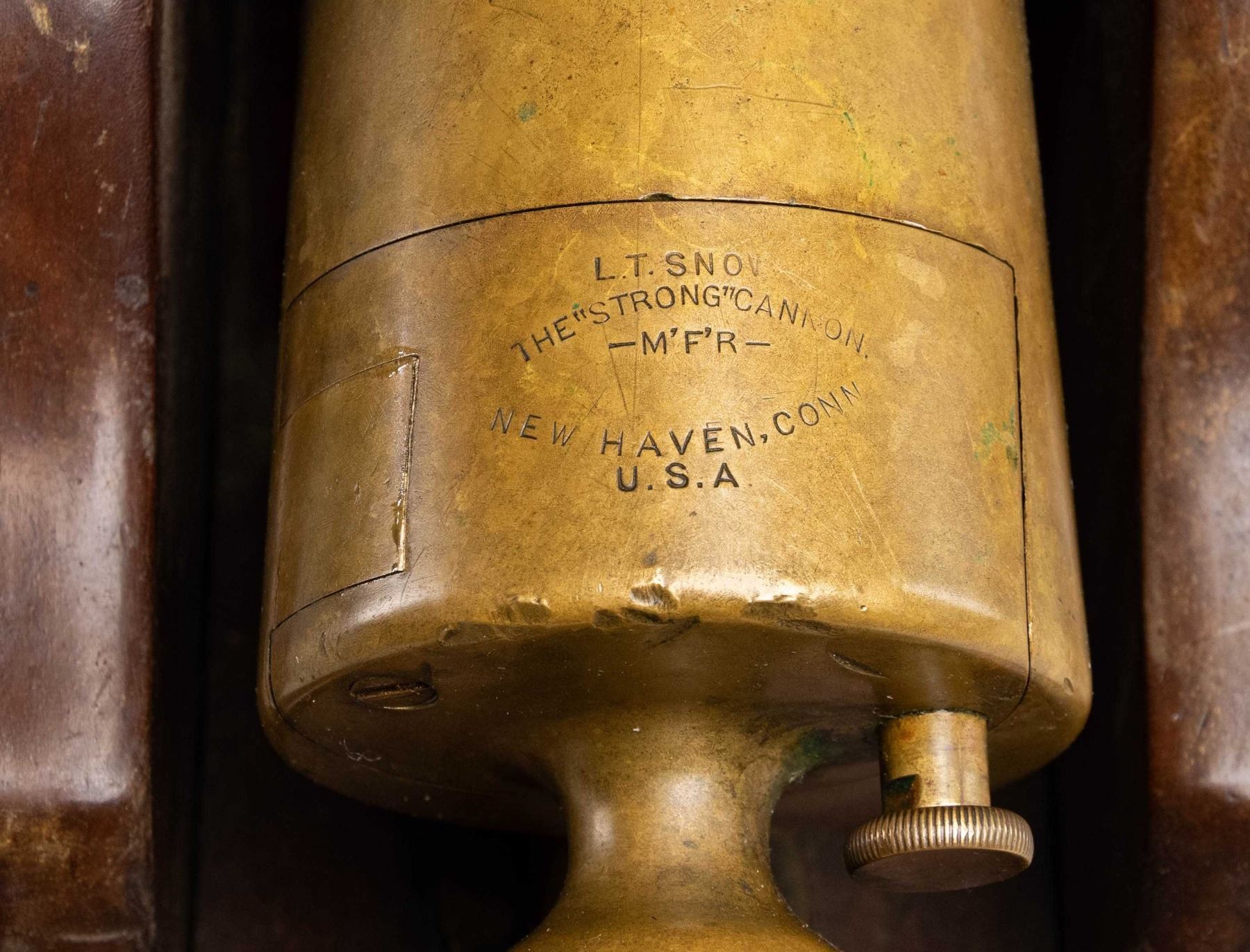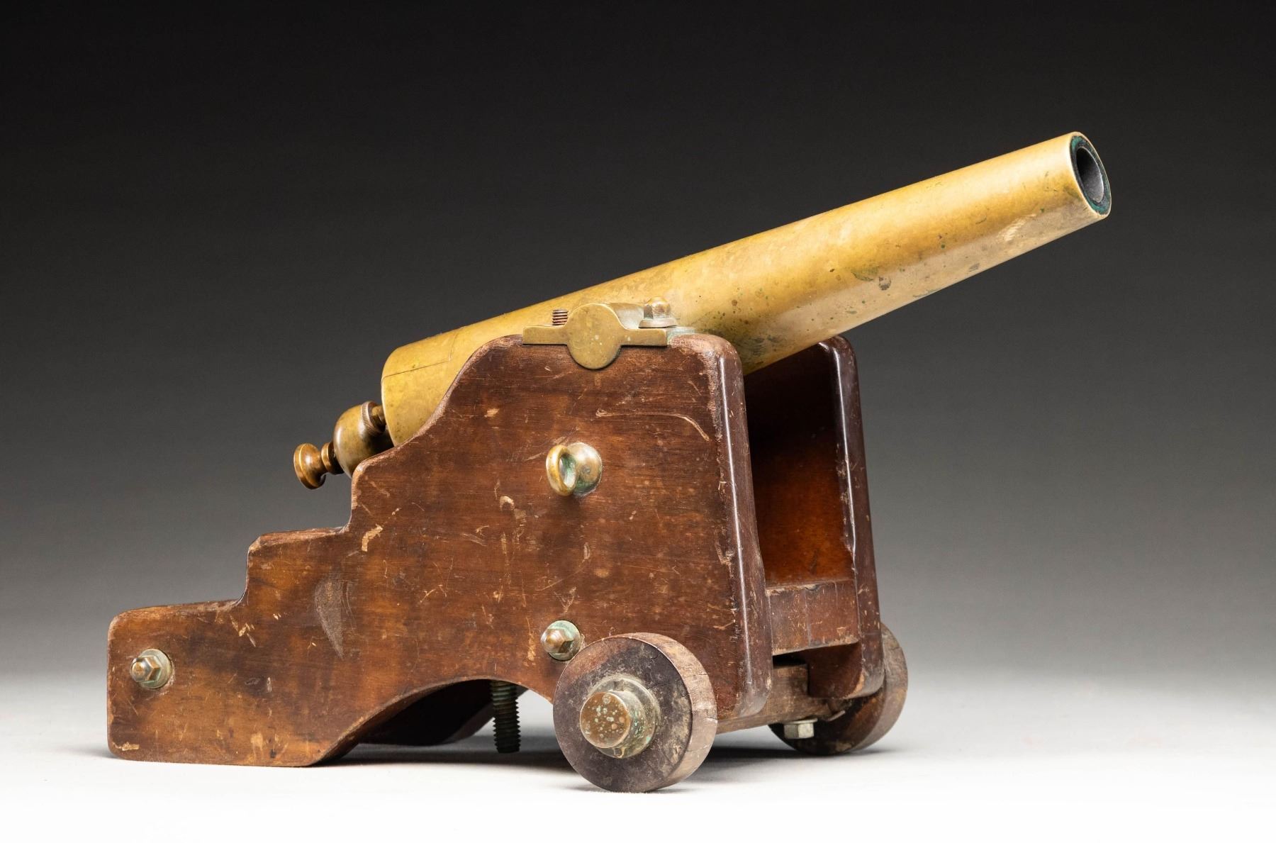 Cal. 10 gauge blank "Strong" Yacht cannon made by LT Snow of New Haven CT. Brass cannon measures 13" in length. Cannon measures 16" overall from rear of carriage to muzzle. Rear brass carriage ring & one mount nut are all missing. Hardwood carriage. CONDITION: base of carriage shows a 4 3/4" crack at rear, carriage otherwise shows scattered finish wear, dings & scuffing. Brass parts are a dull yellow color with scattered oxidation & light ding dings. Good bore with light oxidation & usage wear. (02-26086/MJC). NON-GUN. $4,000-6,000.