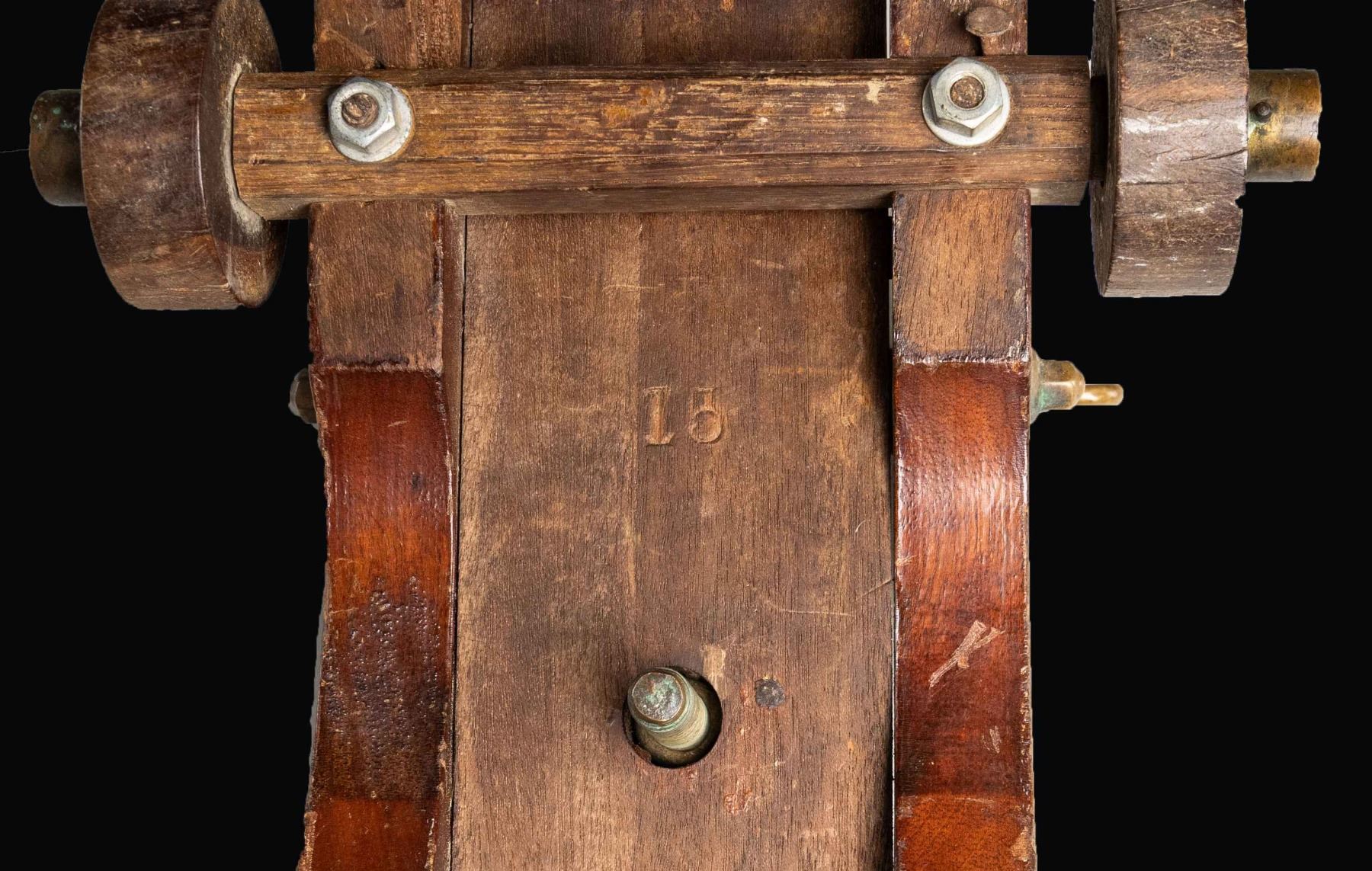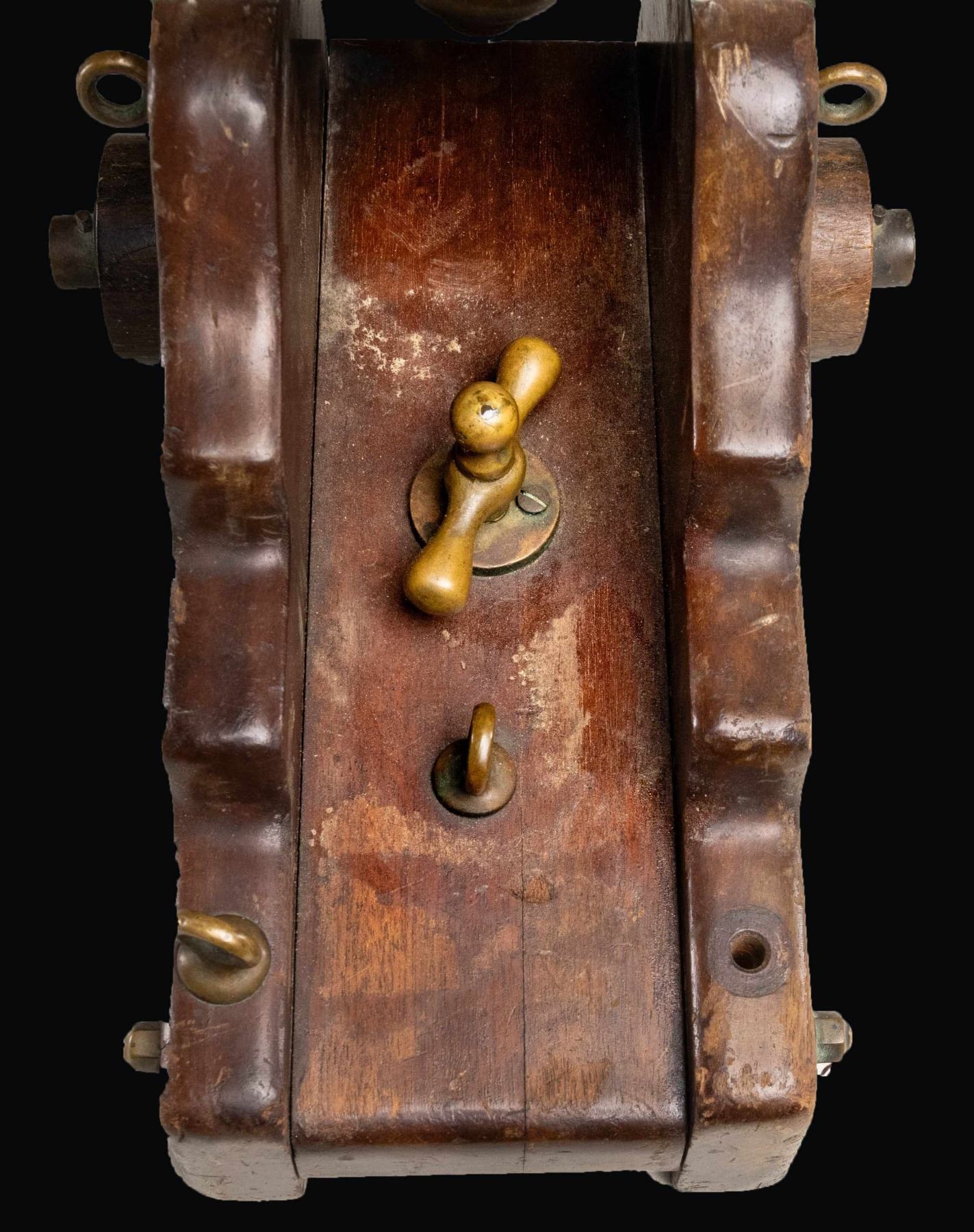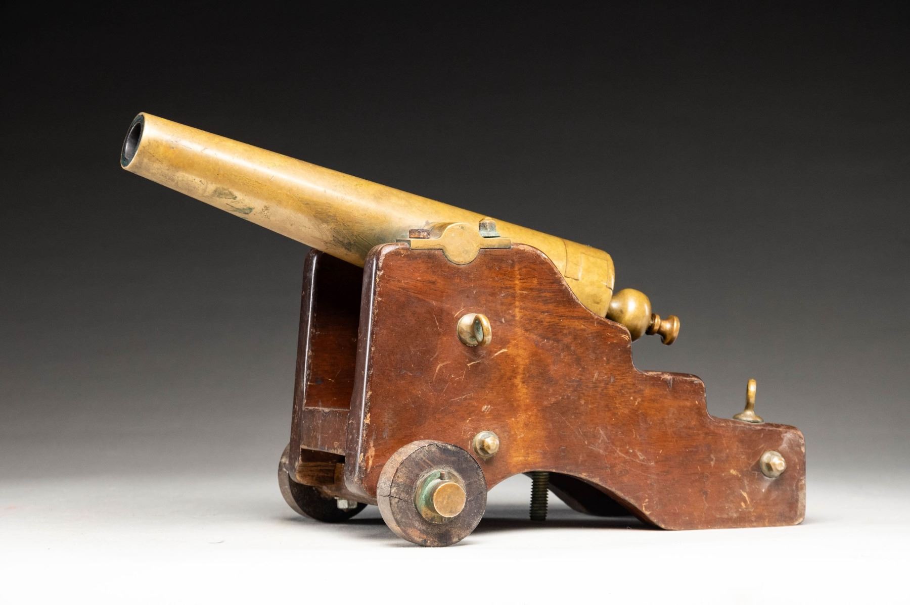 Cal. 10 gauge blank "Strong" Yacht cannon made by LT Snow of New Haven CT. Brass cannon measures 13" in length. Cannon measures 16" overall from rear of carriage to muzzle. Rear brass carriage ring & one mount nut are all missing. Hardwood carriage. CONDITION: base of carriage shows a 4 3/4" crack at rear, carriage otherwise shows scattered finish wear, dings & scuffing. Brass parts are a dull yellow color with scattered oxidation & light ding dings. Good bore with light oxidation & usage wear. (02-26086/MJC). NON-GUN. $4,000-6,000.