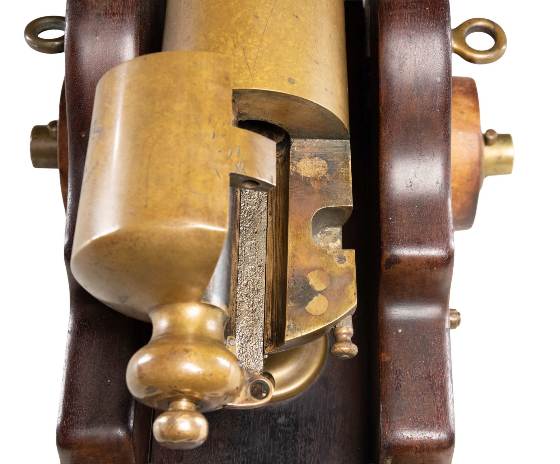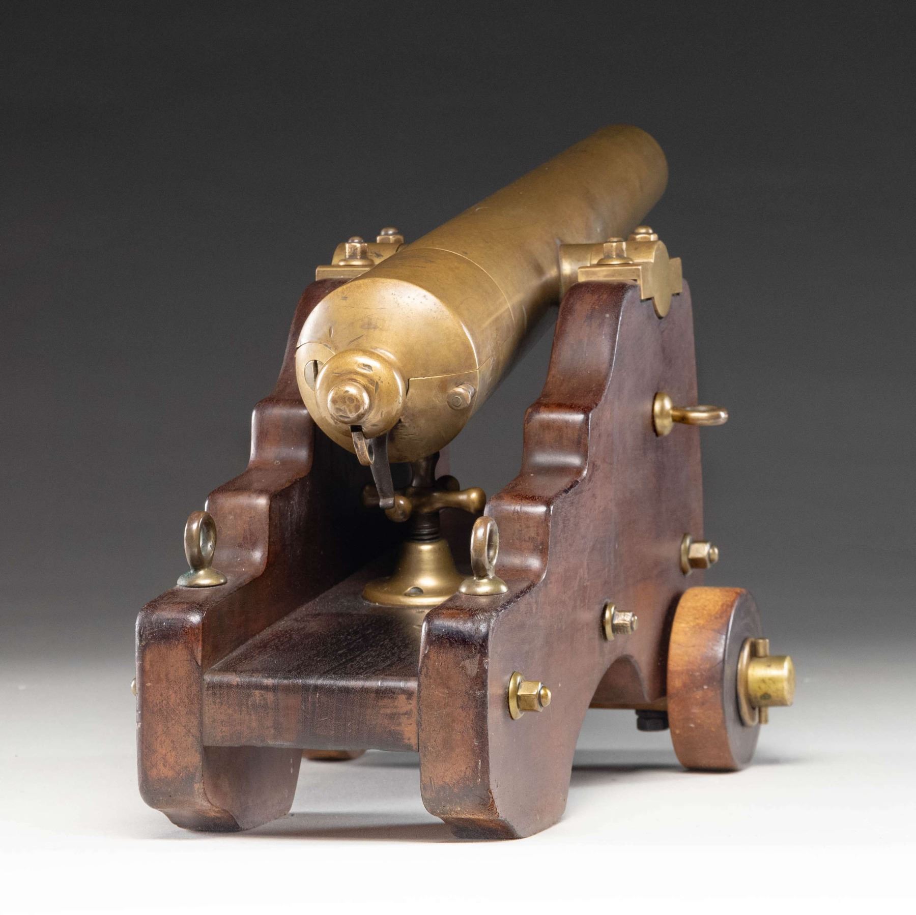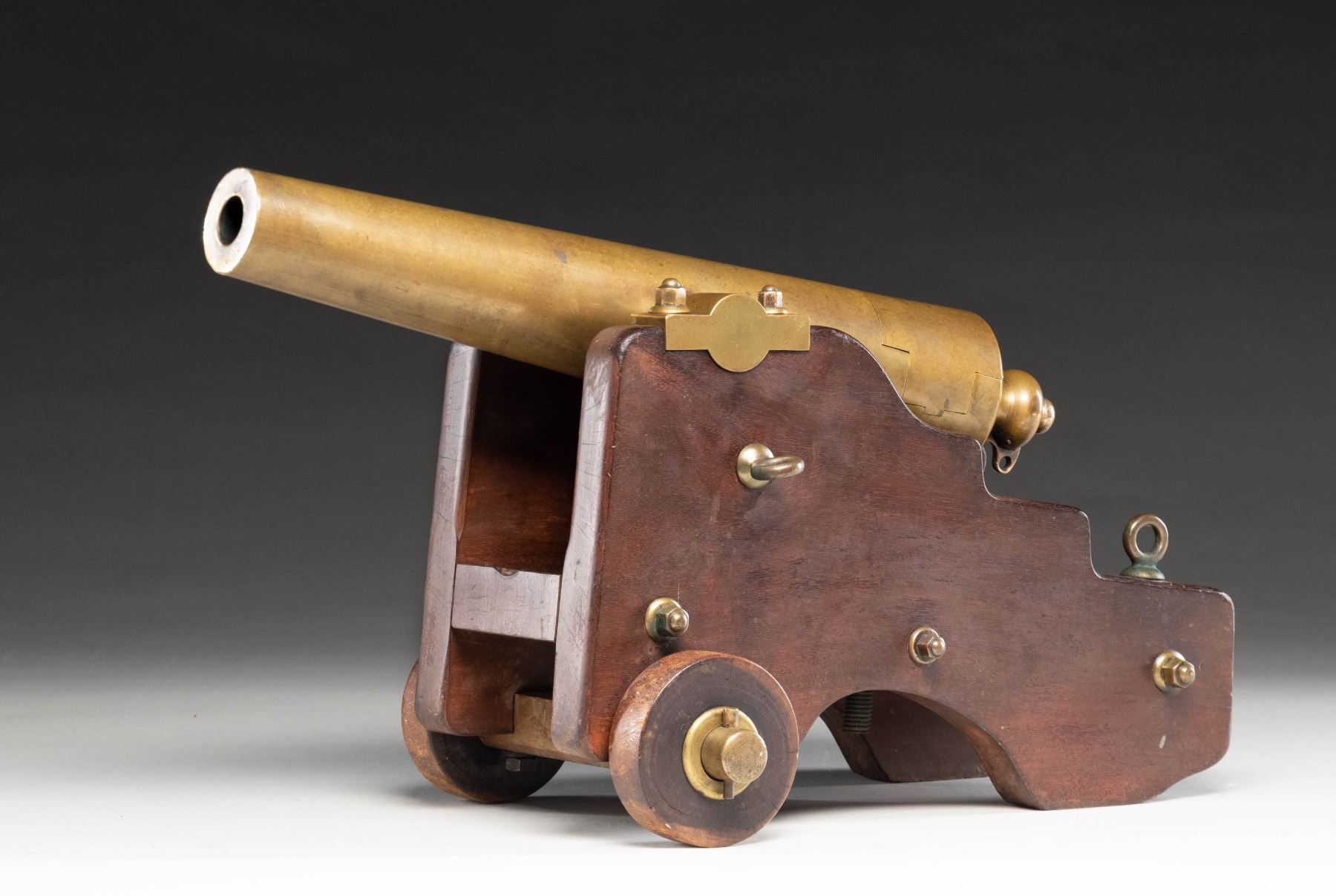 YACHT CANNON. Cal. 8 Ga. S# NSN. These well made attractive signal guns were very popular at the turn on of the 19th century. The 8 gauge guns being the most desirable because they are large enough to make a visual statement and emit a resounding boom!; yet small enough to be stowed in a closet or locker. Loading components are readily available. This fine condition gun has 18" barrel (over cascabell) with improved breech loading system having heavy pivoting breech block with spring loaded firing pin, remote firing mechanism (long string attached to sear) and finger lever type cartridge extractor. Top of breech is deeply marked "MANF'D BY" "THE STRONG FIREARMS" "-CO-" over a heraldic eagle, over "NEW HAVEN CONN" "U.S.A.". Barrel is mounted in its original mahogany Naval carriage with two lignum vitae wheels. All original brass hardware is present including capstan elevation screw, heavy trunnion mounts, assembly bolts and tie down rings. CONDITION: fine. Brass with old cleaning is nicely toned. Maker's marks are exceptionally strong and clear. There is evidence of assembly and disassembly of carriage with marks on brass nuts. Wood retains nearly all of what appears to be original finish with some light marks. Firing mechanism is good. Extractor works. (02-26144/MGM). $3,000-5,000.