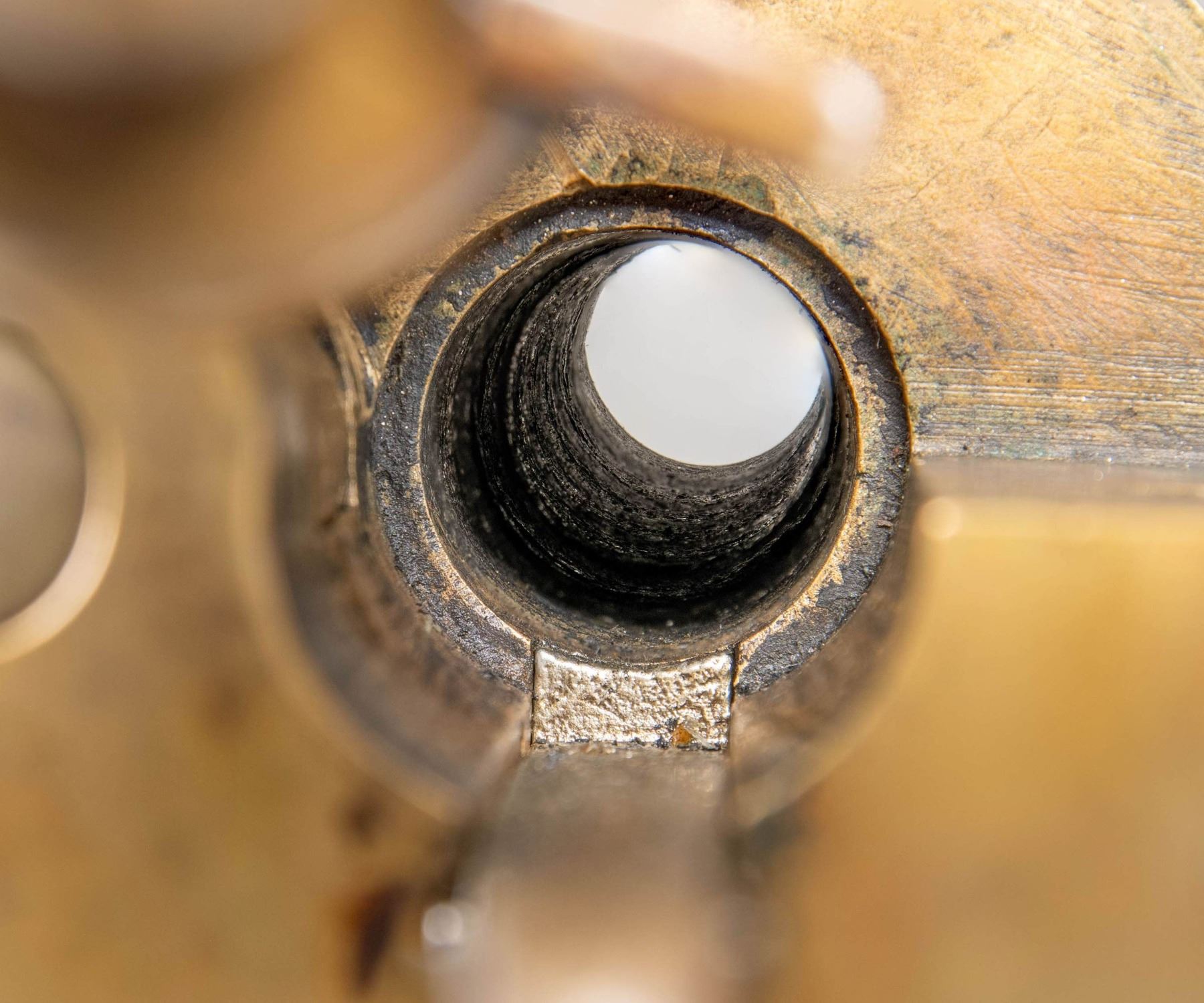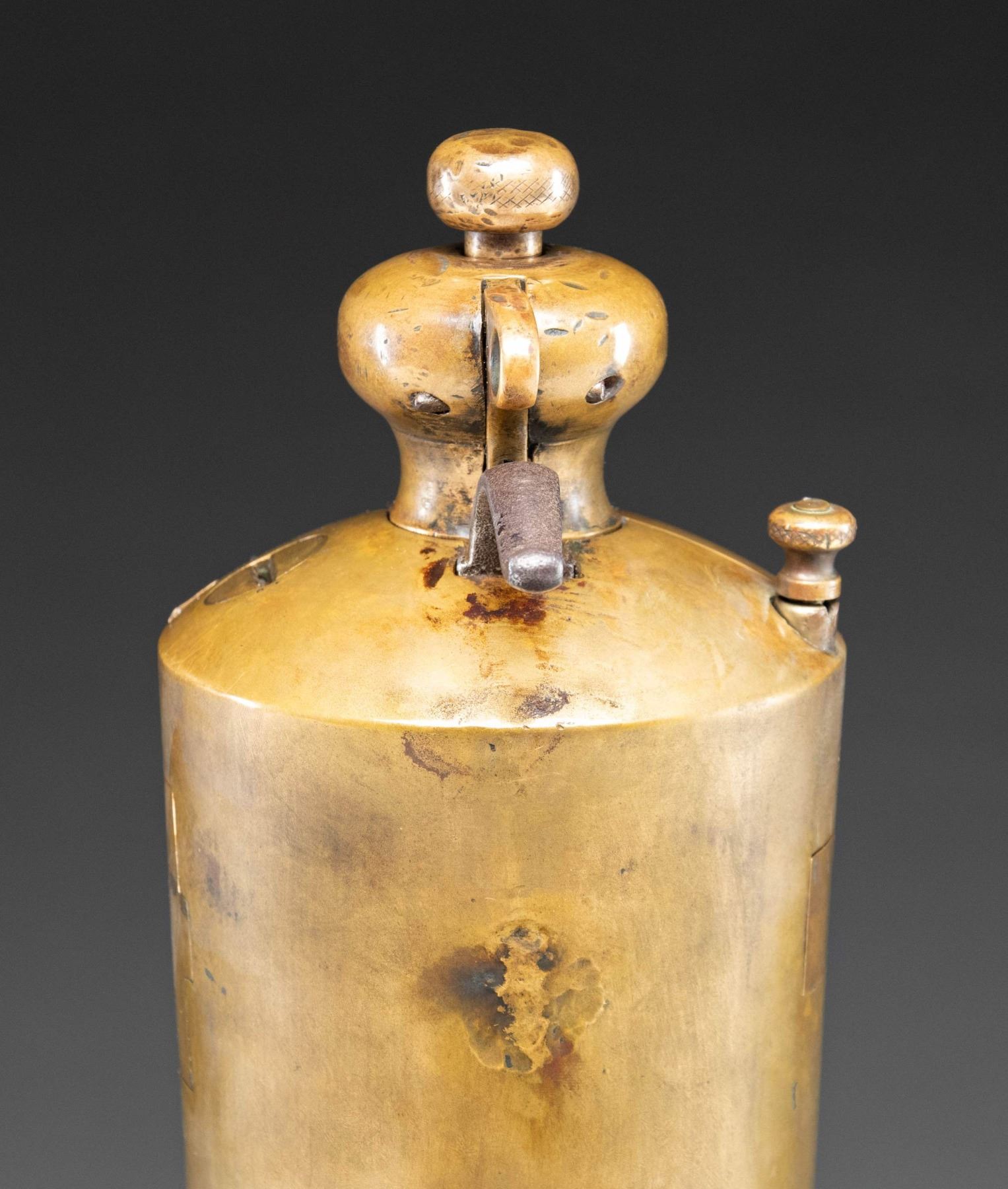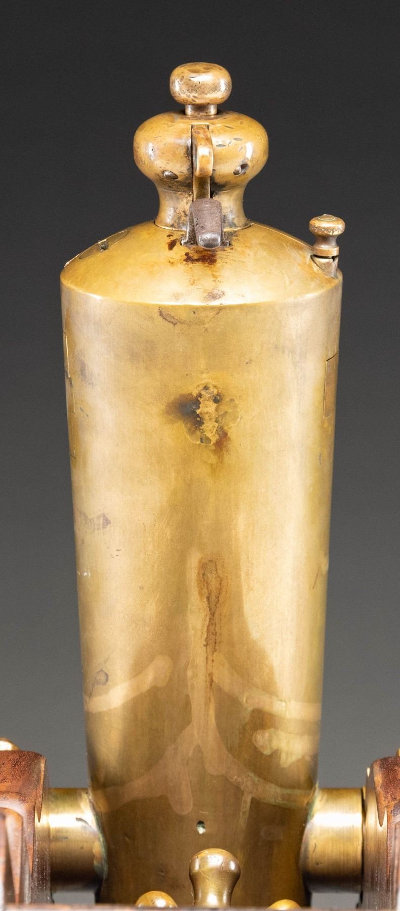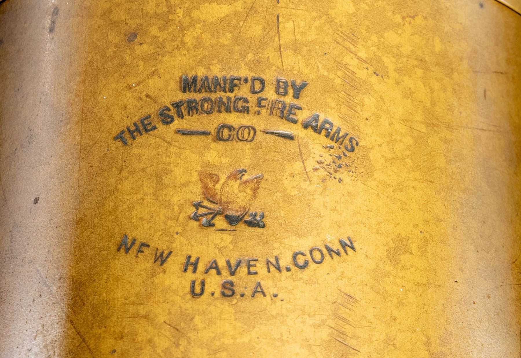 YACHT CANNON. Cal. 8 Ga. S# NSN. These well made attractive signal guns were very popular at the turn on of the 19th century. The 8 gauge guns being the most desirable because they are large enough to make a visual statement and emit a resounding boom!; yet small enough to be stowed in a closet or locker. Loading components are readily available. This fine condition gun has 18" barrel (over cascabell) with improved breech loading system having heavy pivoting breech block with spring loaded firing pin, remote firing mechanism (long string attached to sear) and finger lever type cartridge extractor. Top of breech is deeply marked "MANF'D BY" "THE STRONG FIREARMS" "-CO-" over a heraldic eagle, over "NEW HAVEN CONN" "U.S.A.". Barrel is mounted in its original mahogany Naval carriage with two lignum vitae wheels. All original brass hardware is present including capstan elevation screw, heavy trunnion mounts, assembly bolts and tie down rings. CONDITION: fine. Brass with old cleaning is nicely toned. Maker's marks are exceptionally strong and clear. There is evidence of assembly and disassembly of carriage with marks on brass nuts. Wood retains nearly all of what appears to be original finish with some light marks. Firing mechanism is good. Extractor works. (02-26144/MGM). $3,000-5,000.