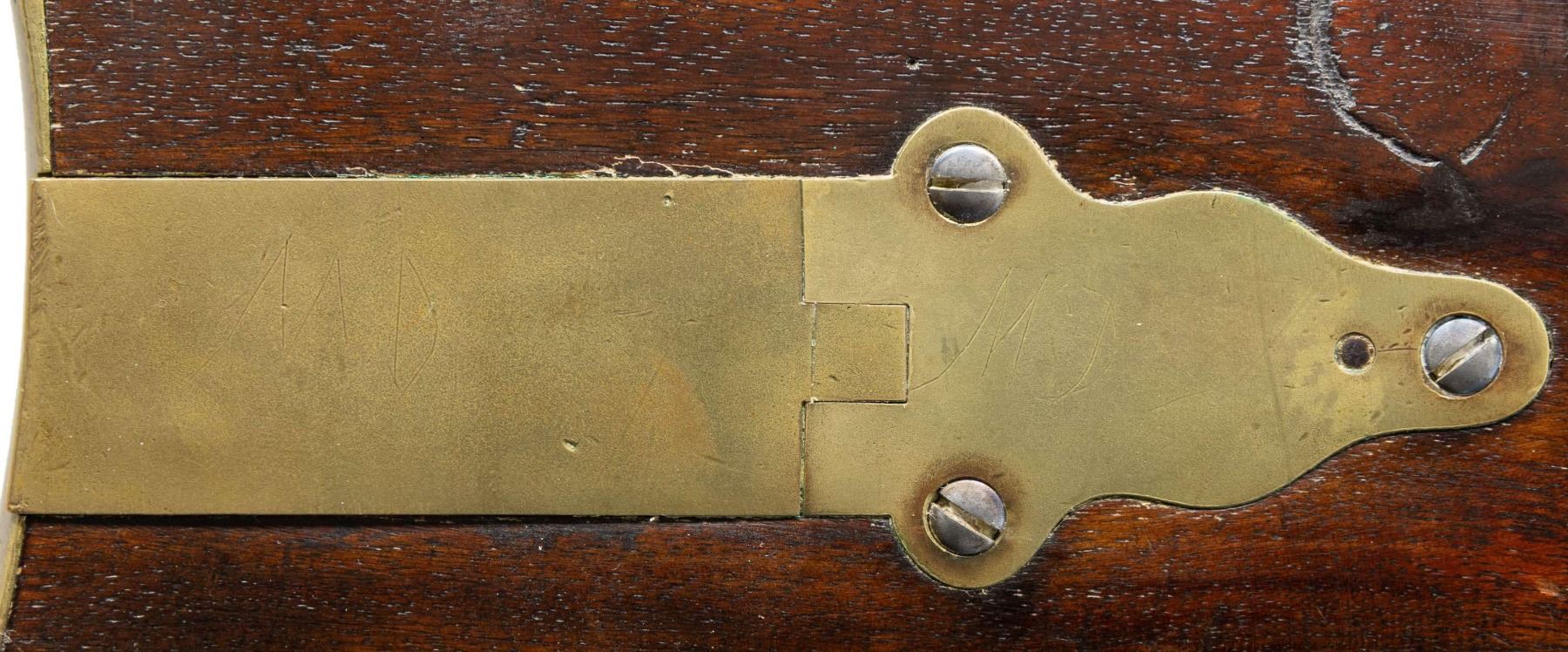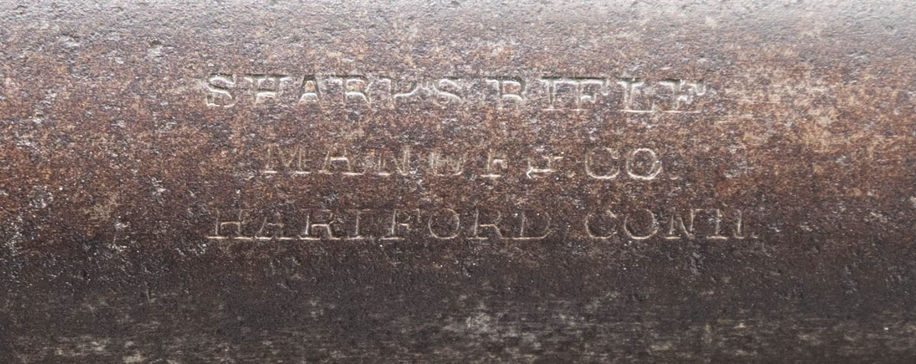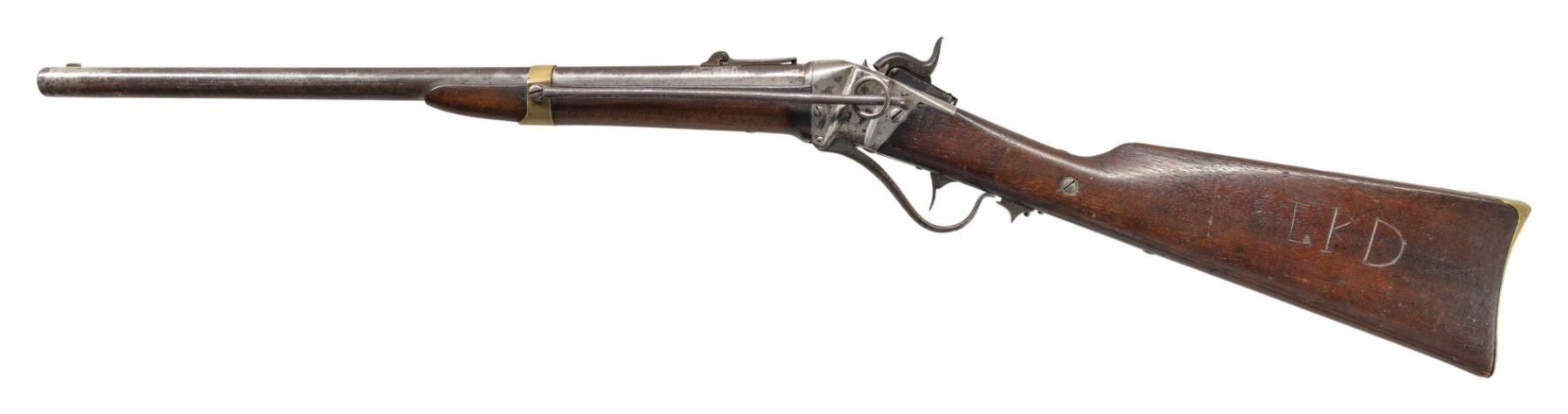 MILITARY CARBINE. Cal 52. S# 11974. Standard brass mounted configuration, 37.5" overall, 21.5" barrel, "SHARPS RIFLE / MANUFG. CO. / HARTFORD CONN" on top flat rear a barrel band, adjustable long range rear sight, brass blade front sight, "SHARPS /PATENT / 1852" on lock, "SHARPS / PATENT / 1848" on back of frame and S# on tang. Barrel has small "M" inspection at left breech. "LKD" soldier's initials carved on left butt stock. Consecutive S# 11975 is found in National Archives records re-issued to Co. C, 19th PA Cavalry, S#s 11972 & 11977 are found in 1864 records in the 1st Maryland Cavalry. "MD" is scratched into toolbox lid. CONDITION: very good overall, all original and matching, honest well used example showing abrasions from saddle wear. Iron overall is cleaned toned to mottled brown/bright patina. Mechanics are fine including Maynard capping device, crisp bright discernible rifling. PROVENANCE: Estate Collection of John "Jack" Dhooghe. (01-28236/JS). ANTIQUE. $2,000-3,000.