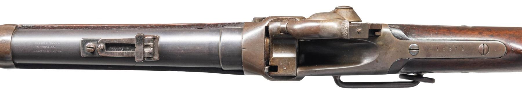 ALTERATION. Cal. 50-70. S# C10065. Standard configuration, 22" unaltered six land & groove barrel, Lawrence patent rear sight & German silver blade front sight in square block. Breech block converted to center fire. Sharps patent markings from before conversion stamped on frame & lock. Stock upgraded at time of alteration retained original buttplate with cutout for toolbox, "DFC" cartouche. CONDITION: very good to fine overall, barrel overall plum/blue patina with strong traces of blue, receiver has traces of case color, stock very good, crisp inspection cartouche. Mechanics fine, bright shiny rifled bore. PROVENANCE: Estate Collection of John "Jack" Dhooghe. (01-28269/JS). ANTIQUE. $2,000-3,000.