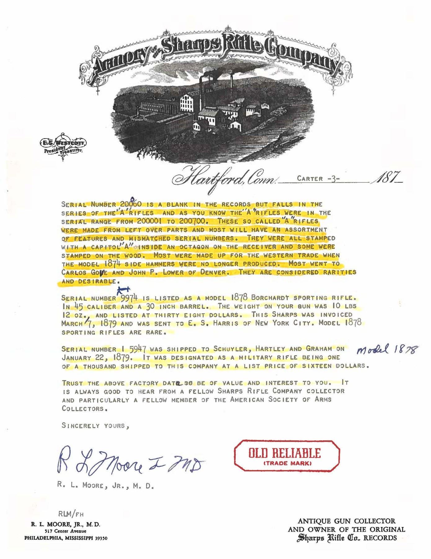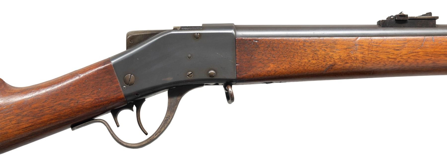 Cal. 45-70 (2 1/10"). S#. 15947. Bbl. 32" round. Fixed front sight w/ military style graduated leaf rear sight. Blue finish w/ case colored lever. 2 band fastened full length walnut forend & straight grip stock w/ checkered steel buttplate. Knurled tip iron ramrod. UNATTACHED ACCESSORIES: R. L. Moore letter stating the following: "Serial number 15947 was shipped to Schuyler, Hartley and Graham on January 22, 1879. It was designated as a military rifle being one of a thousand shipped to this company at a list price of sixteen dollars.". CONDITION: fine, retaining over 90% lightly faded blue showing small marks & spotting. Lever shows some case colors in the protected side areas. Original wood finish shows scattered scratches, marks & small dents. Sound action. Bright near excellent bore. PROVENANCE: The Esteemed Norm Greenberg Collection. (01-27771/DS). ANTIQUE. $2,000-3,000.